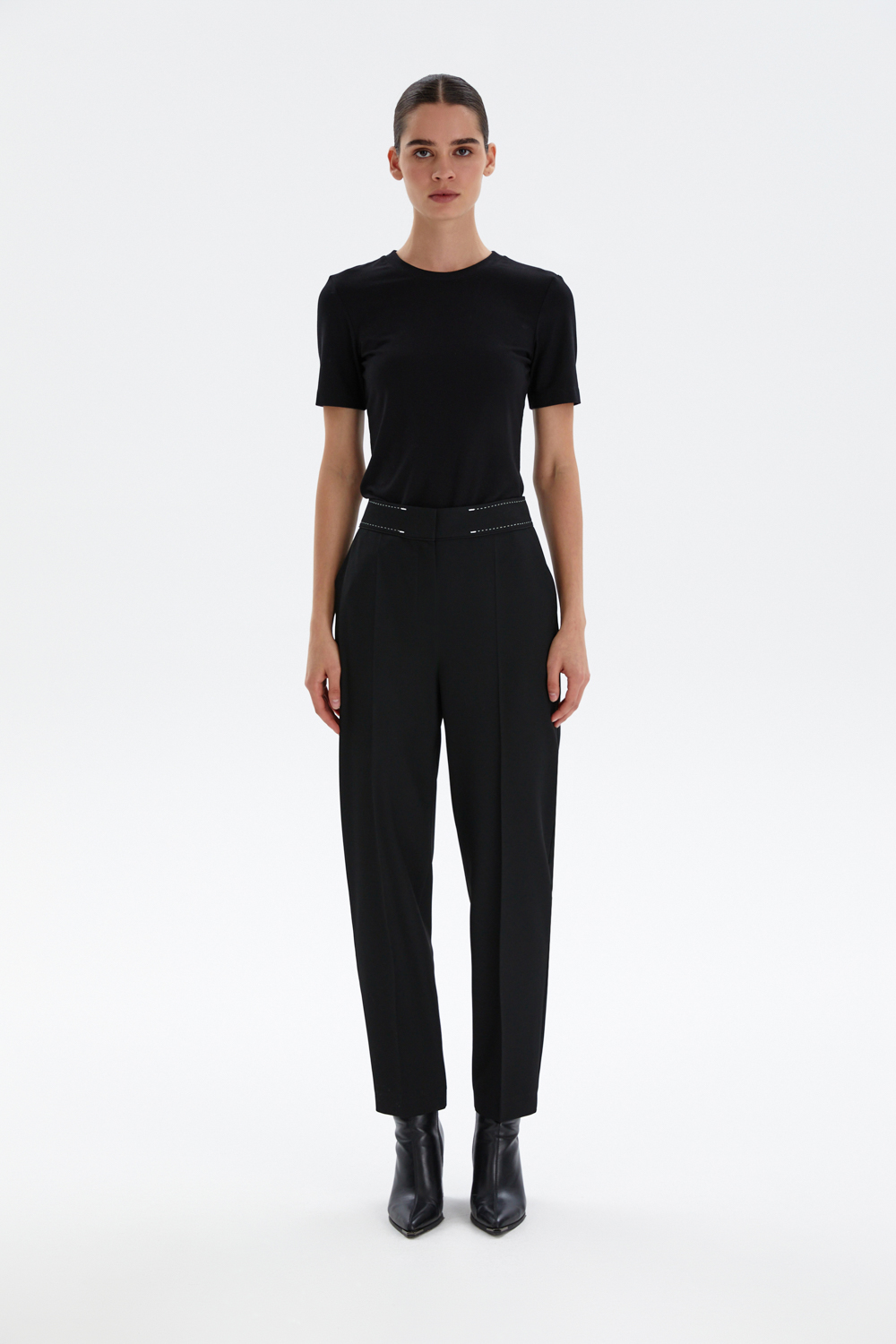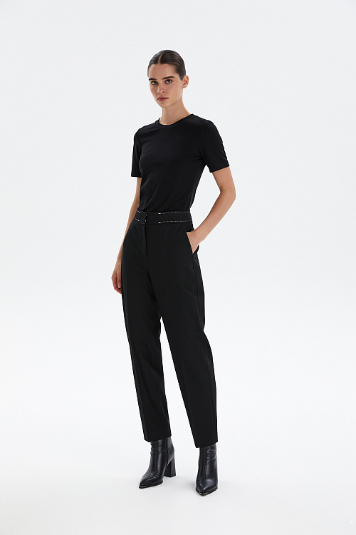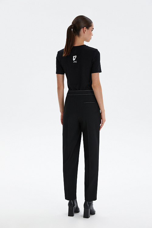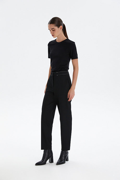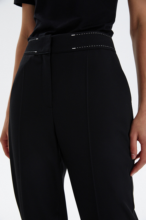 Высокая посадка визуально вытягивает силуэт, а аккуратные стрелки добавляют строгости и делают образ более собранным. Декоративная отстрочка на поясе придаёт модели современный характер и подчёркивает внимание к деталям. Прямой крой обеспечивает комфорт и свободу движений, сохраняя при этом идеальную форму.