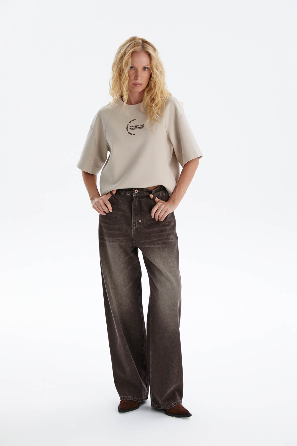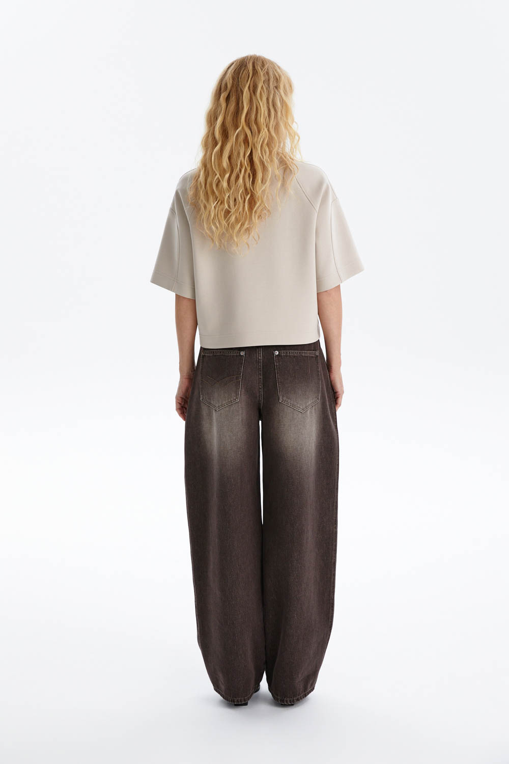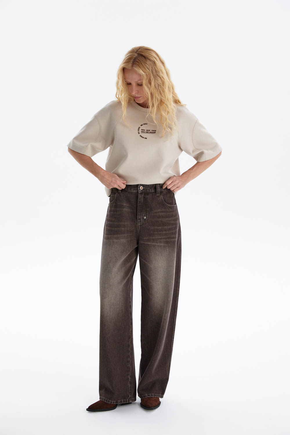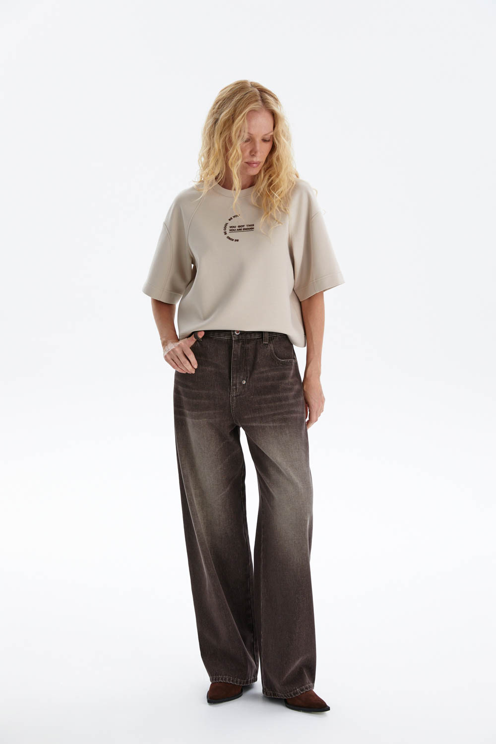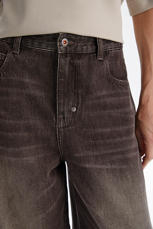 Широкие джинсы из мягкого денима выполнены в актуальном силуэте со слегка зауженной линией к низу. Свободная посадка обеспечивает комфорт, а эффект лёгкого выцветания и винтажный оттенок придают модели современный характер.
