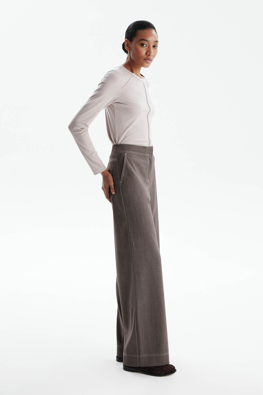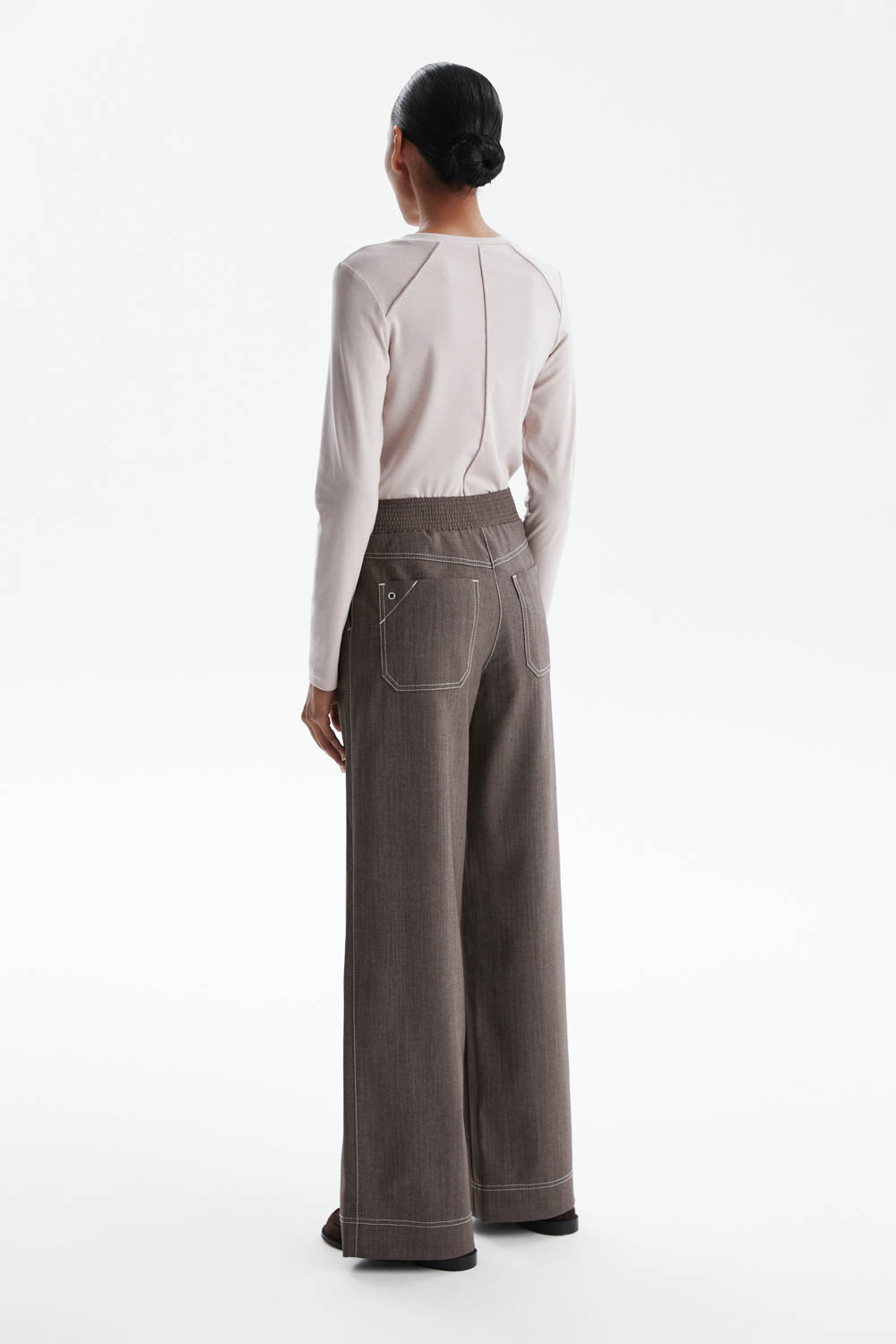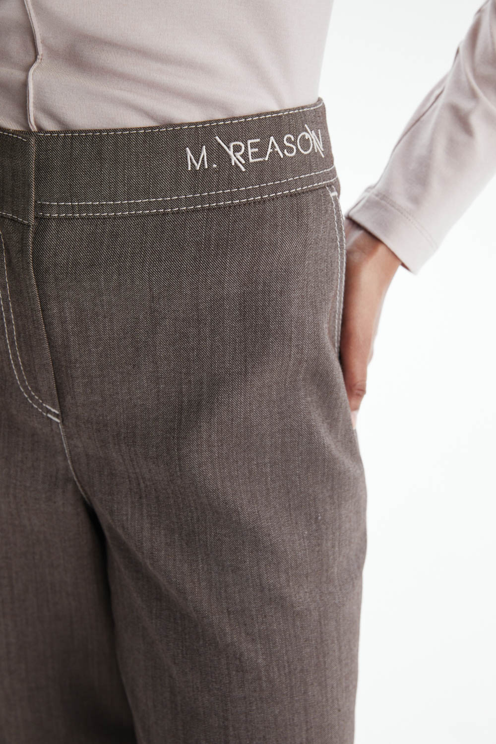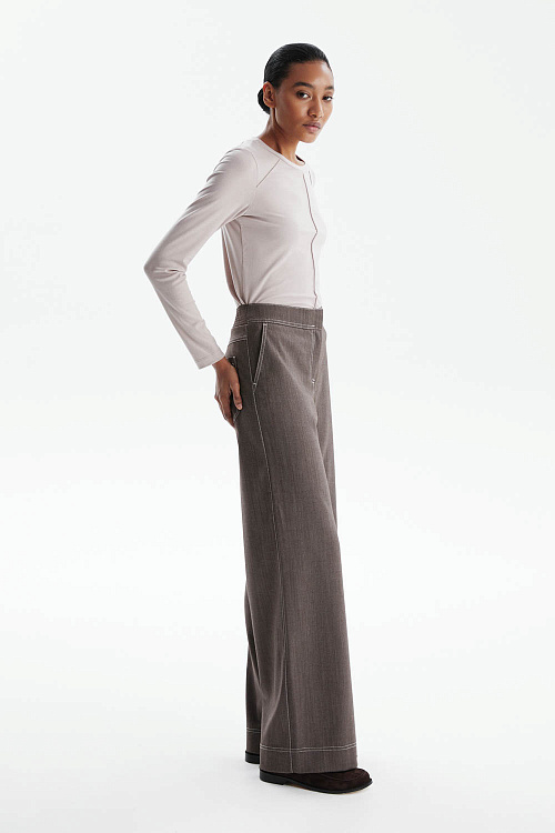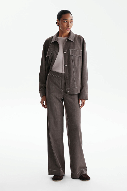 Универсальный серо-коричневый оттенок дополнен контрастной двойной отстрочкой, которая подчёркивает линии кроя и усиливает «денимовый» характер модели. Пояс с эластичной вставкой сзади и функциональные карманы обеспечивают удобство и практичность. Свободный силуэт визуально вытягивает фигуру, делая образ стильным и расслабленным.