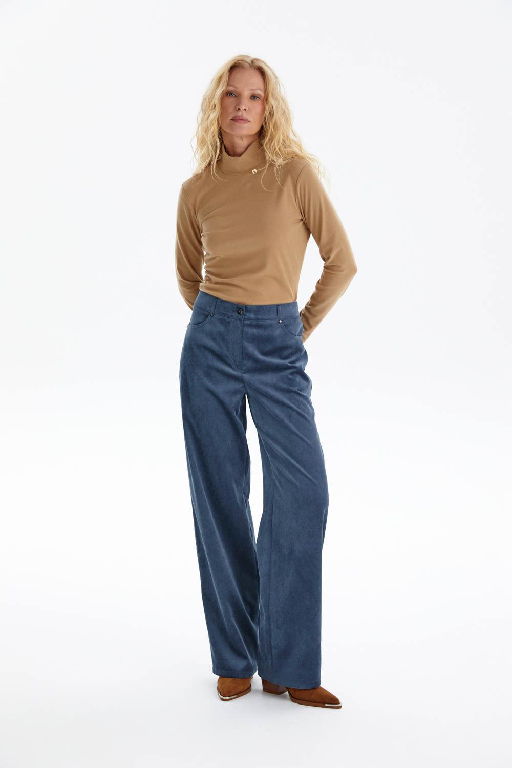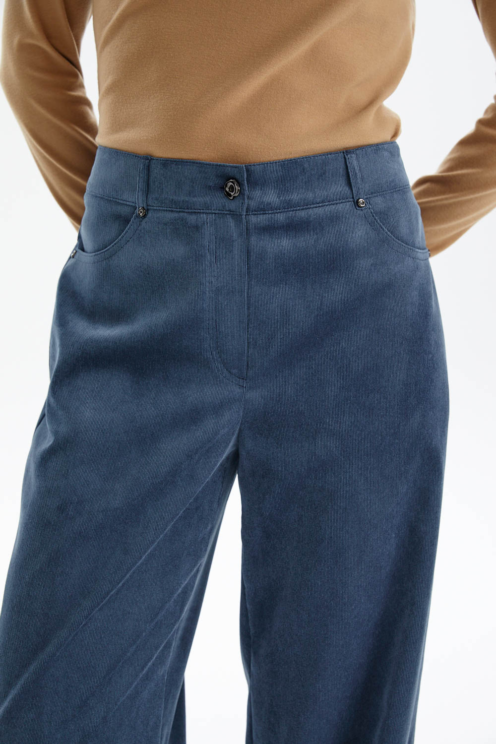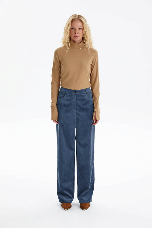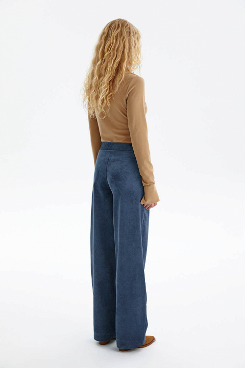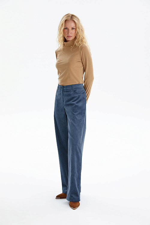 Широкие брюки прямого кроя из мягкого микровельвета в благородном лазурно-индиговом оттенке станут универсальной основой гардероба.