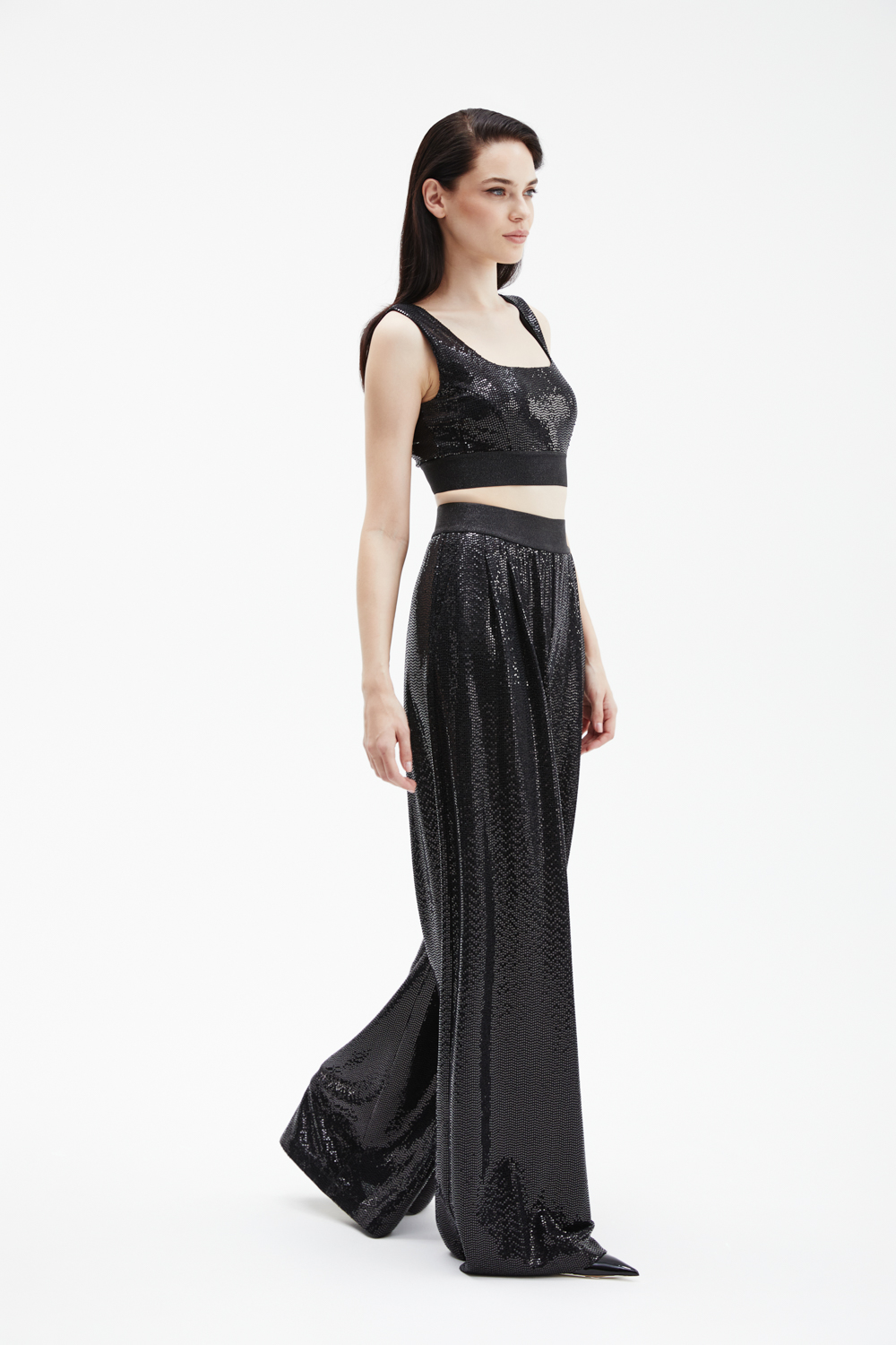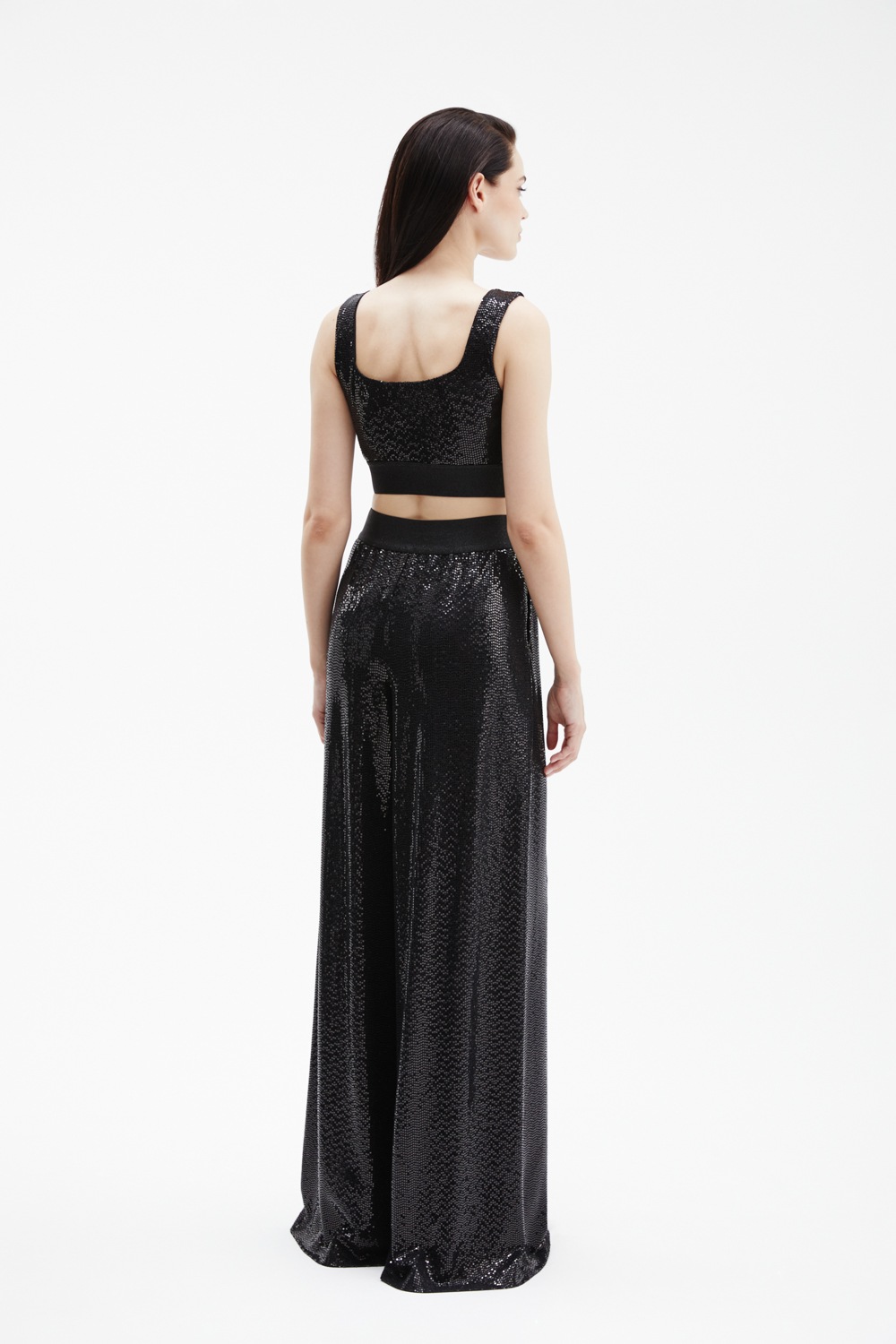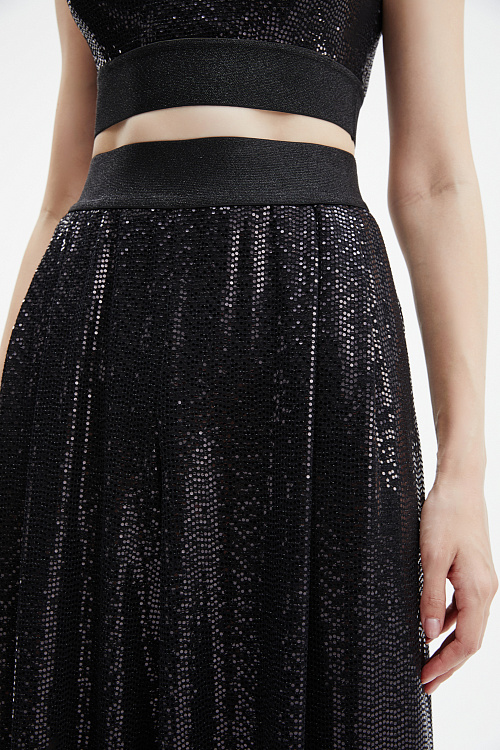 Черные брюки-палаццо широкого силуэта выполнены из мягкого трикотажа, полностью расшитого мелкими пайетками, которые создают элегантное мерцание.