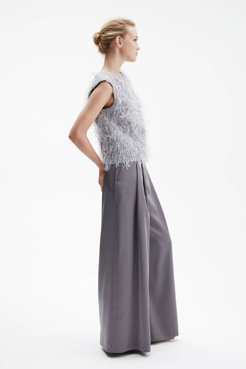 Высокая посадка с притачным поясом и застёжкой на молнию в левом боковом шве. Двойные складки спереди формируют изящный объём и визуально удлиняют силуэт, широкие прямые брючины подчёркивают лёгкую элегантность. Аккуратные боковые карманы добавляют практичности, сохраняя чистоту линий.