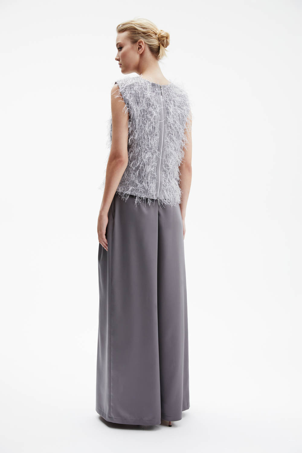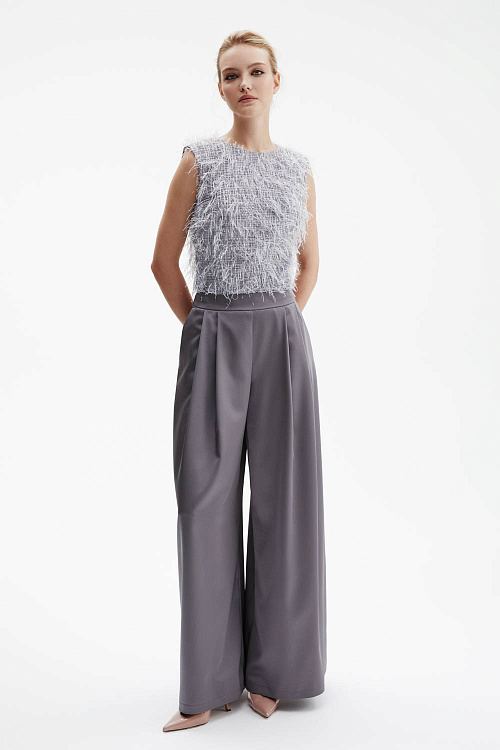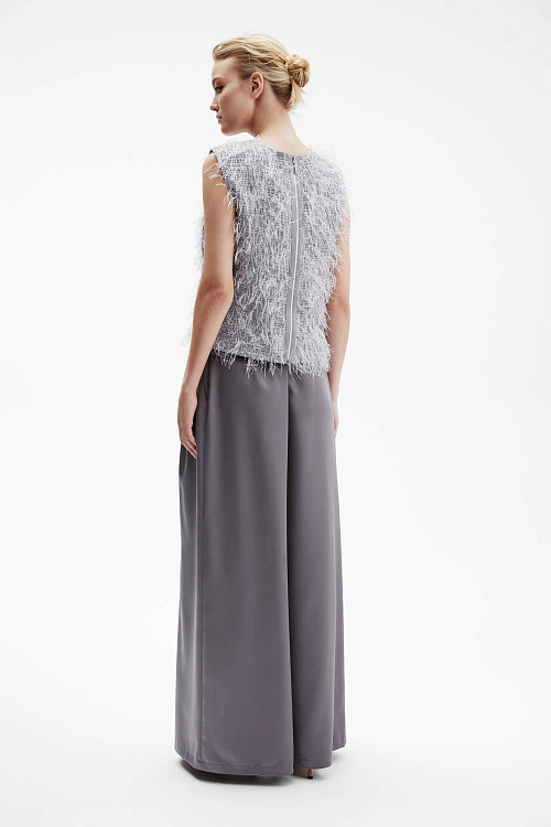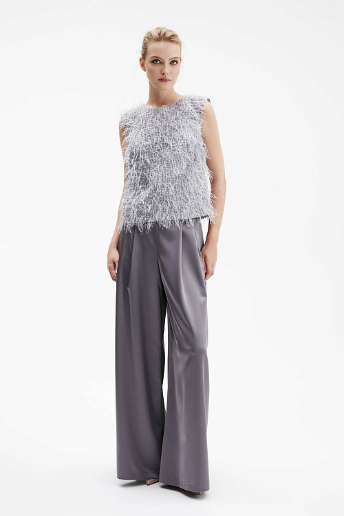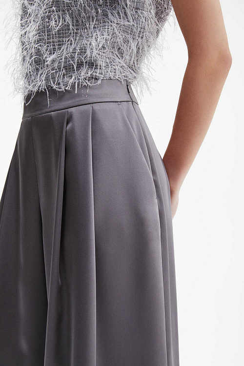 Серые брюки-палаццо широкого силуэта выполнены из гладкого струящегося атласа, который мягко отражает свет и красиво драпируется.
