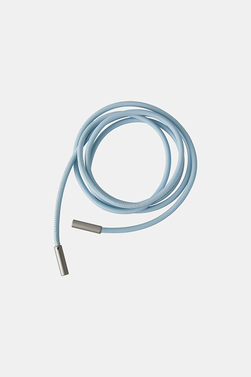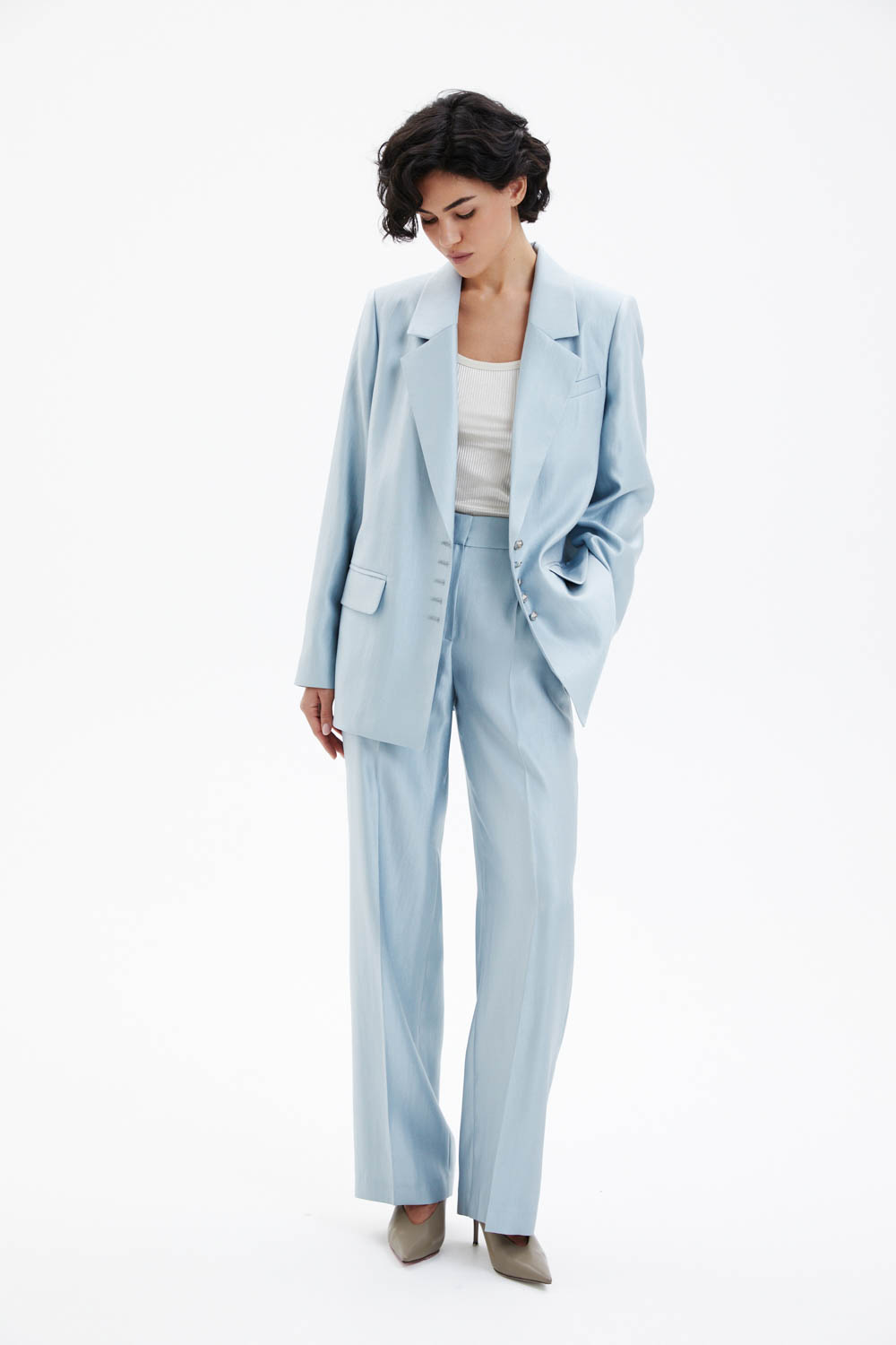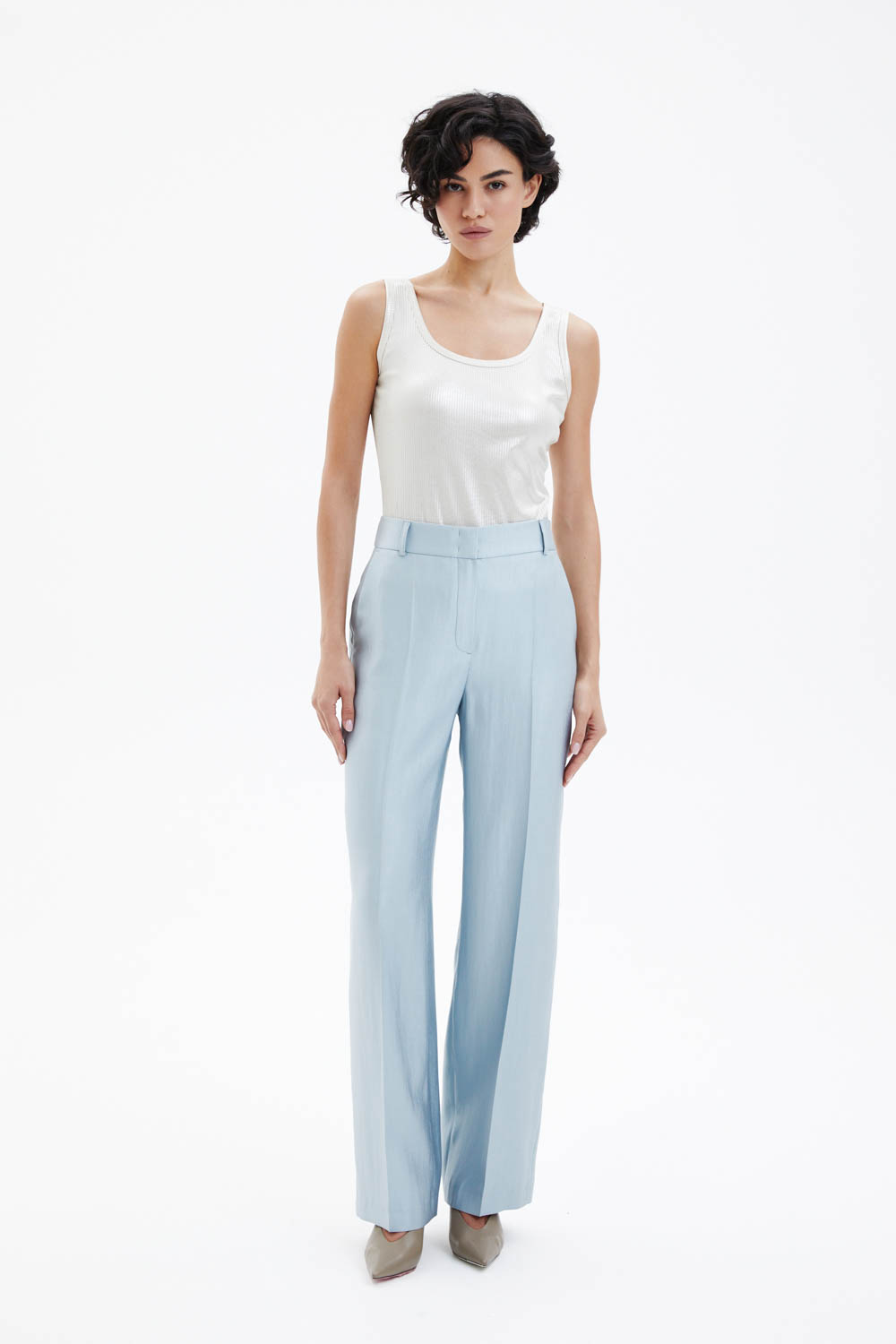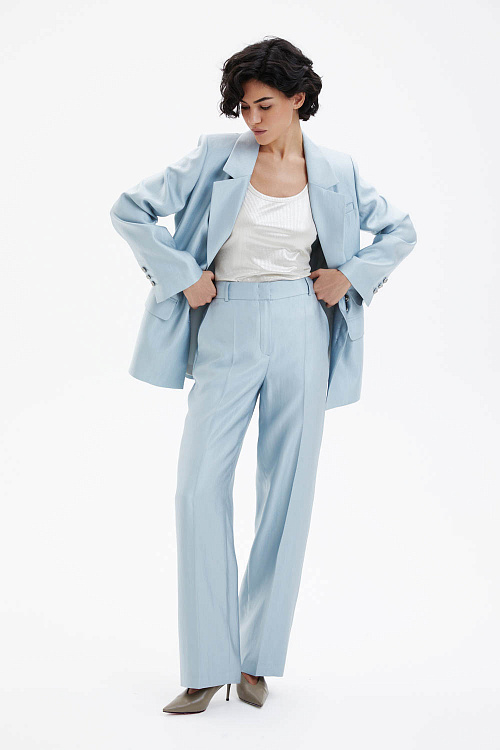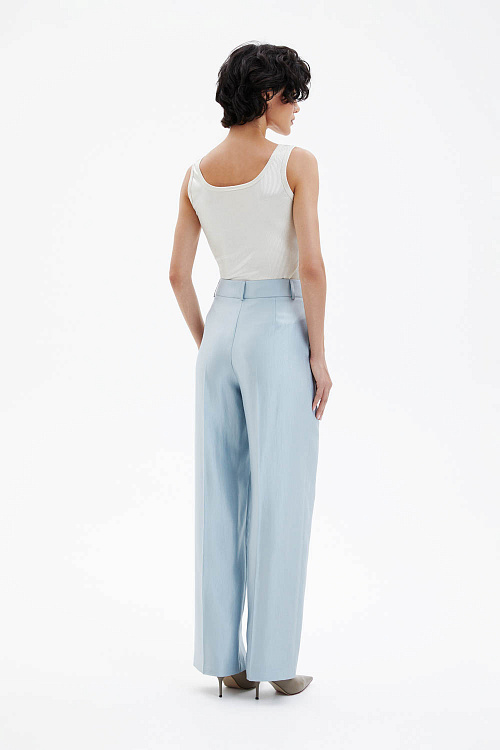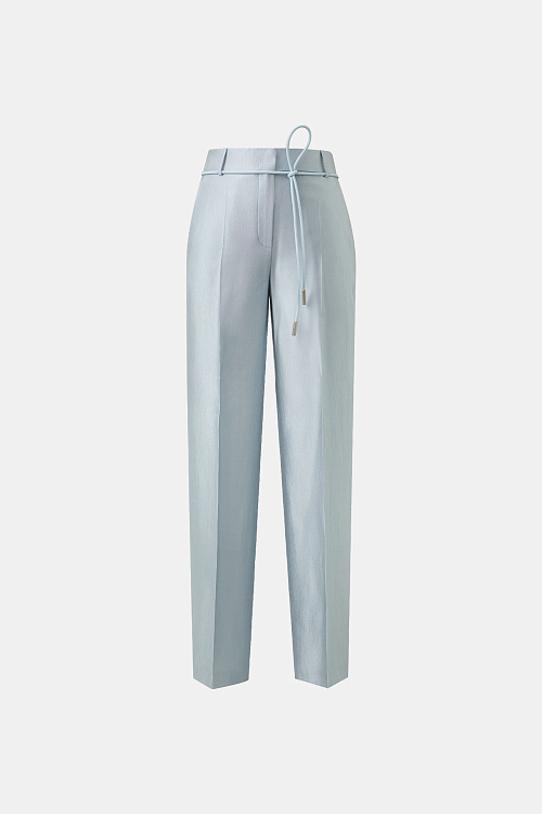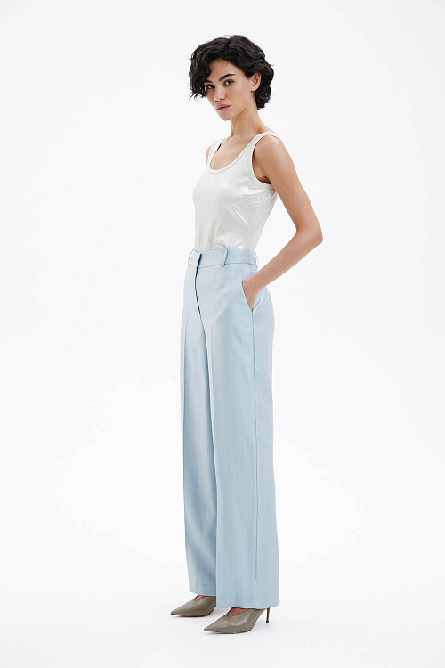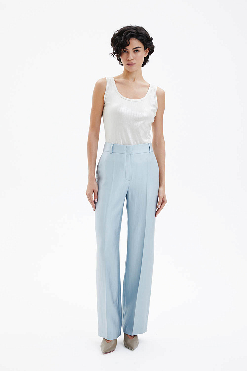 Брюки прямого силуэта со стрелками выполнены на притачном поясе и слегка заужены книзу. Лёгкая ткань небесно-голубого цвета с металлическим отблеском создаёт выразительный визуальный эффект и делает модель акцентной. Спереди расположены два функциональных кармана, а спинка остаётся гладкой, сохраняя чистоту линий. Лаконичный крой в сочетании со стрелками формирует аккуратный удлинённый силуэт. В комплекте пояс-шнурок голубого цвета.