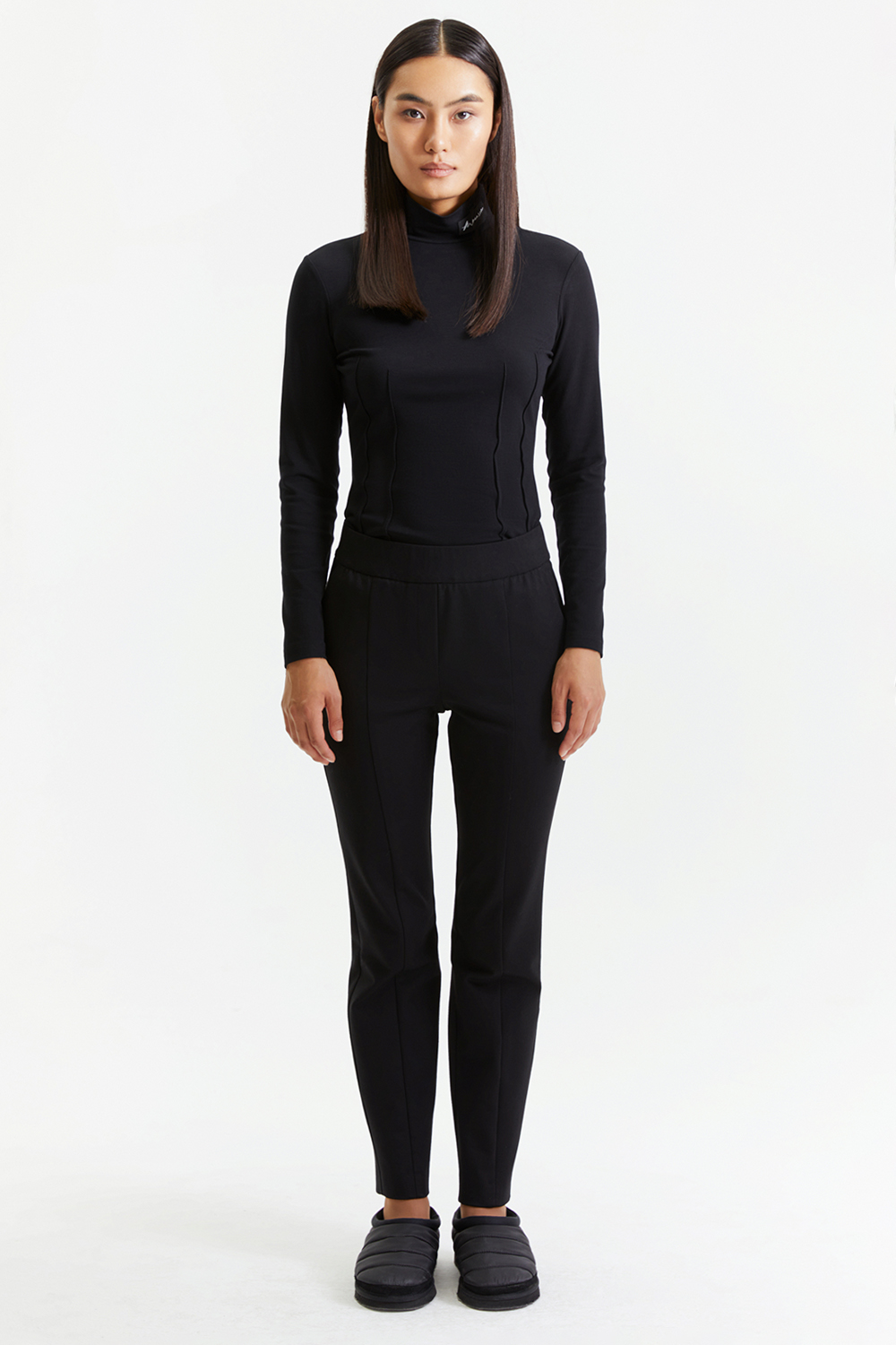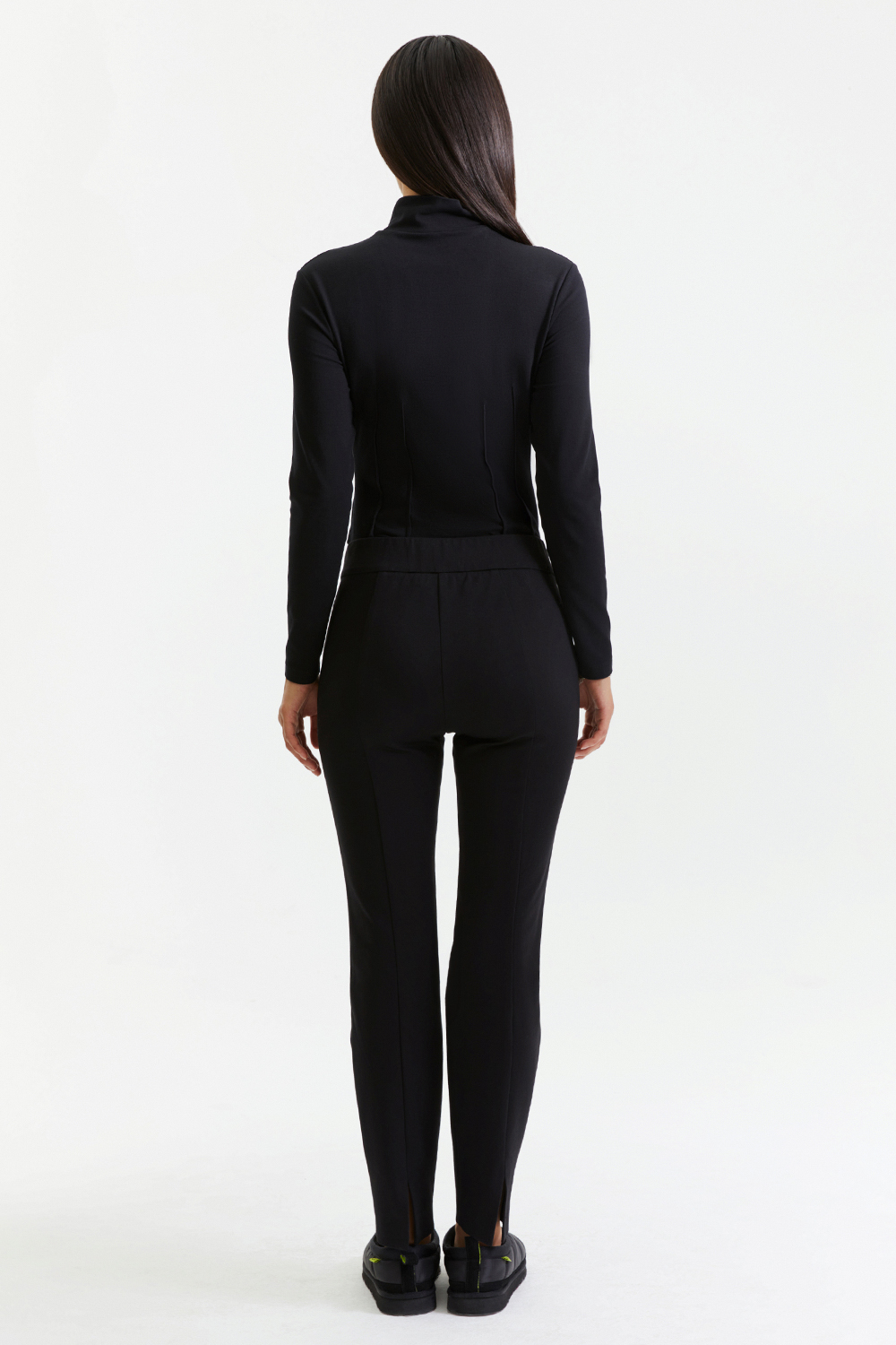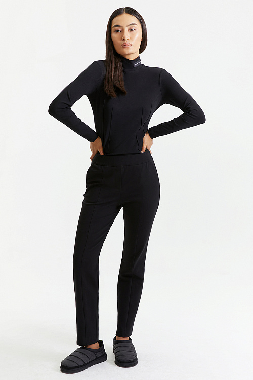 Стильные леггинсы с горизонтальными рельефными швами по передним и задним половинкам из плотного джерси черного цвета с небольшими разрезами сзади.