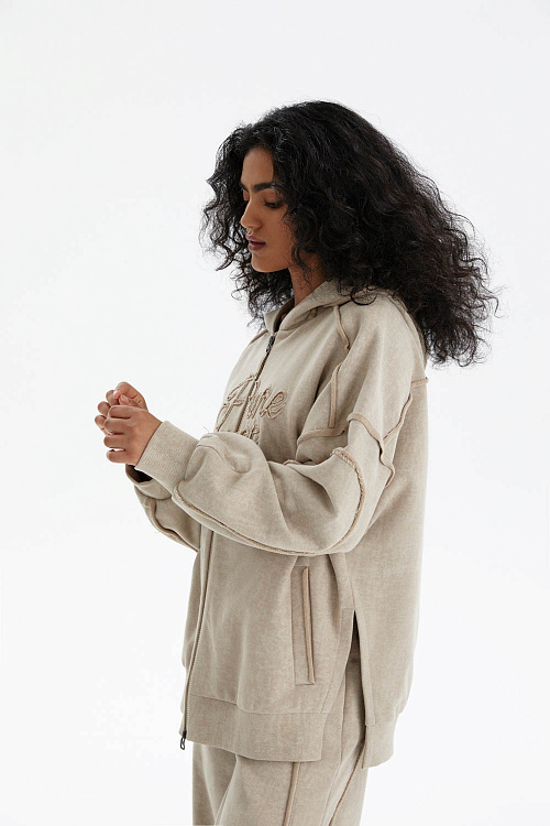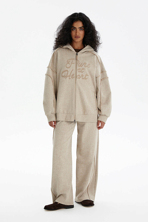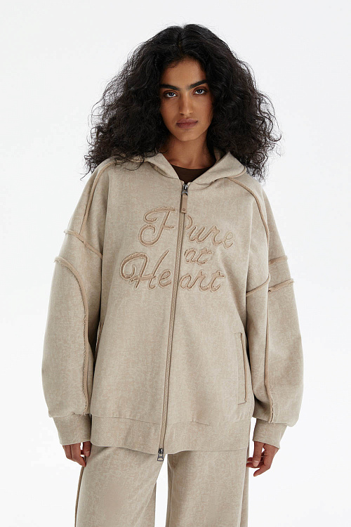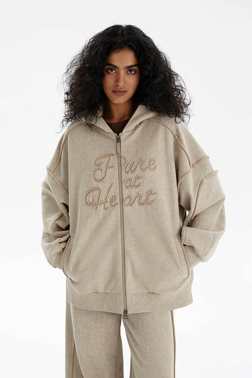 На груди расположена фактурная объёмная вышивка «Pure at Heart» («С чистым сердцем»), которая придаёт изделию характер. Капюшон на кулиске и удобная молния обеспечивают функциональность, а прорезные карманы добавляют практичности.
