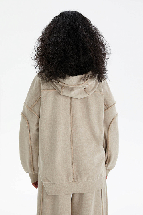 Свободный крой с заниженной линией плеча и объёмными рукавами создаёт расслабленный силуэт, а декоративные внешние швы добавляют актуальную нотку и подчёркивают уникальность модели.