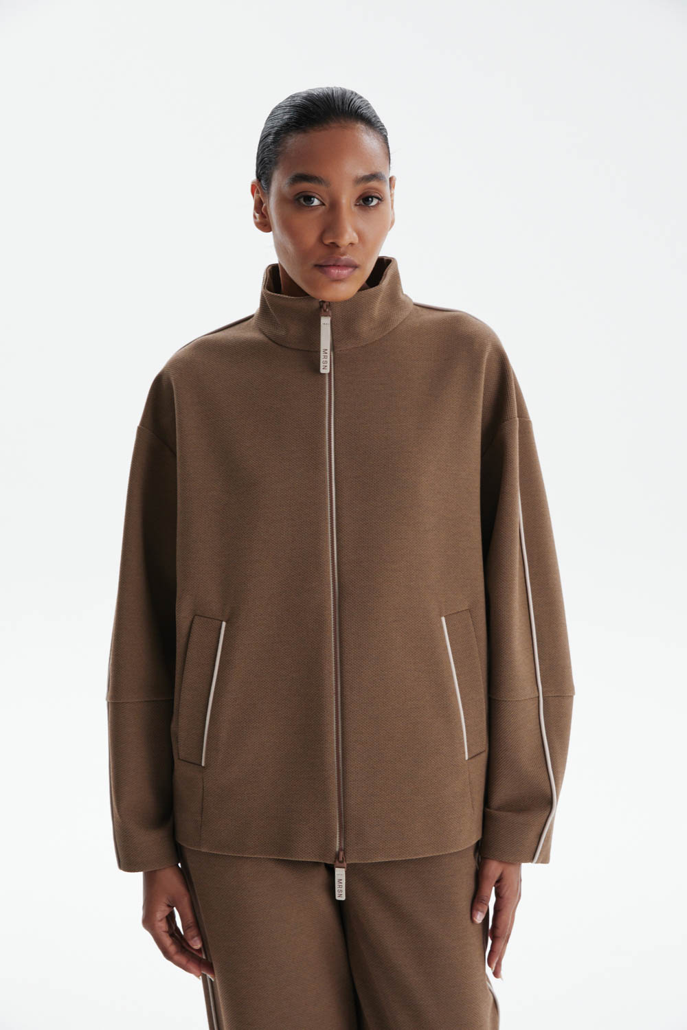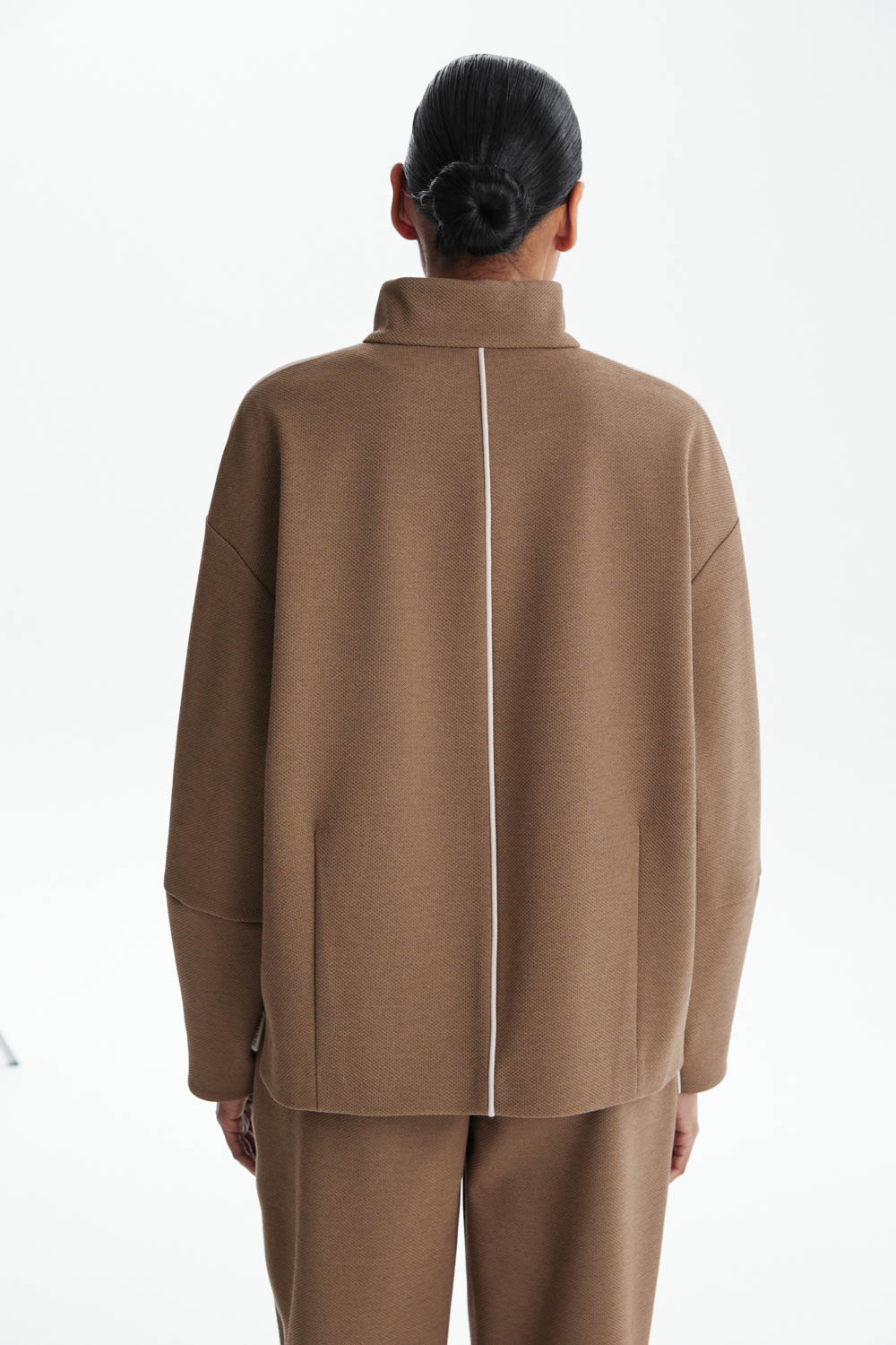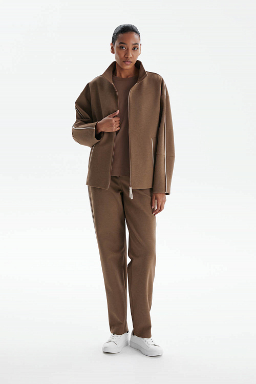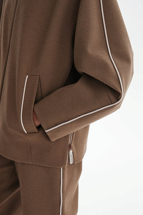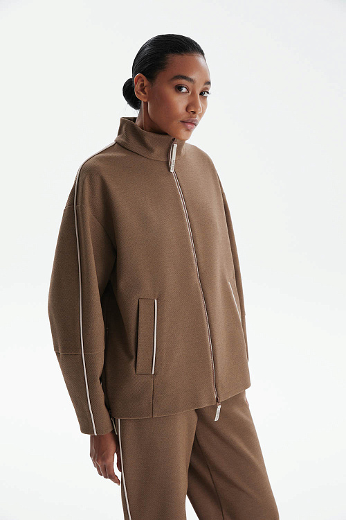 Олимпийка свободного кроя из трикотажа «пике» в благородном карамельном оттенке сочетает спортивный характер и элегантность. Высокий воротник и приспущенная линия плеча формируют современный расслабленный силуэт, а боковые разрезы на молниях обеспечивают удобство и вариативность в носке.