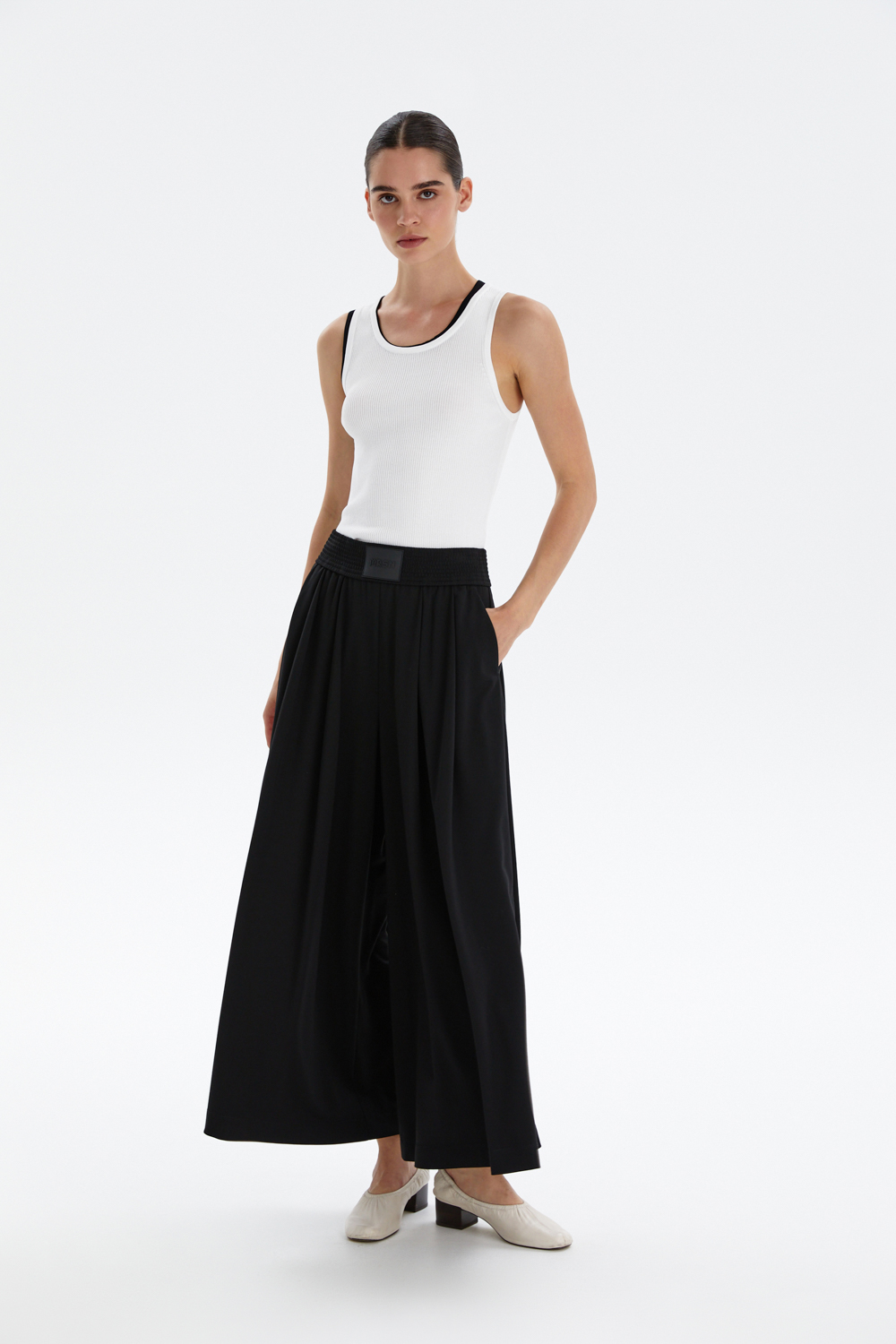 Лаконичный чёрный цвет делает кюлоты универсальной основой гардероба: они легко комбинируются с приталенными топами, объёмными свитерами или жакетами, создавая образы от расслабленного кэжуал до стильного офисного или вечернего.