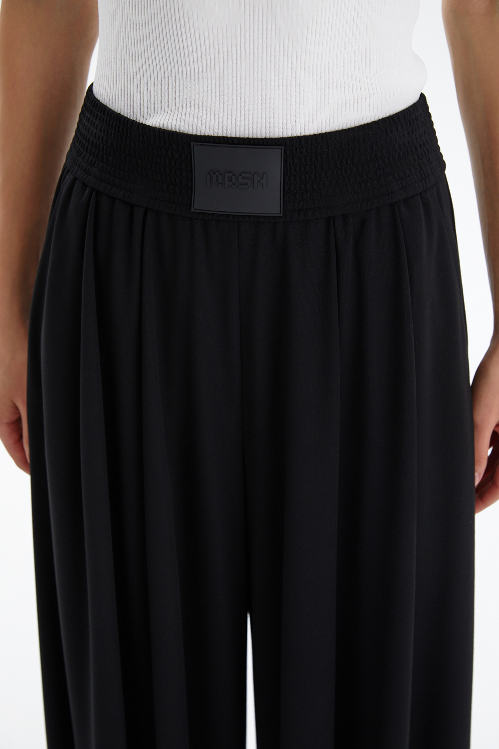 Свободный крой с широкой линией штанин и заложенными складками спереди создаёт эффектный силуэт, добавляя объёма и динамики. Эластичный пояс на резинке обеспечивает удобную посадку в течение всего дня. Модель дополнена функциональными карманами и акцентным силиконовым шевроном, что подчеркивает её актуальный характер.