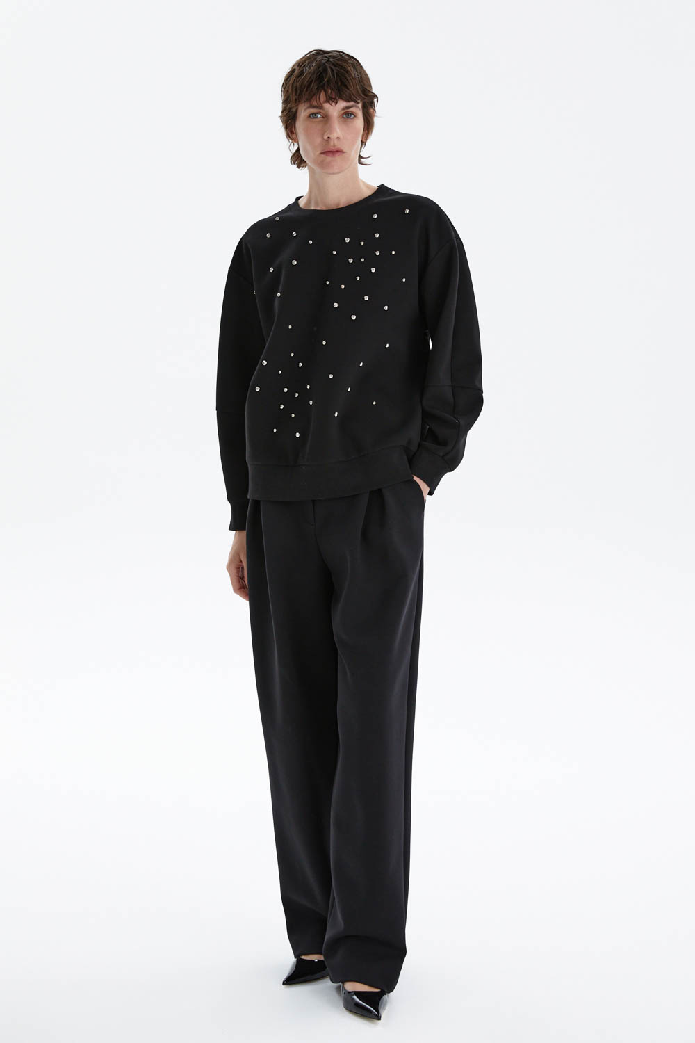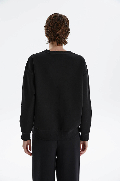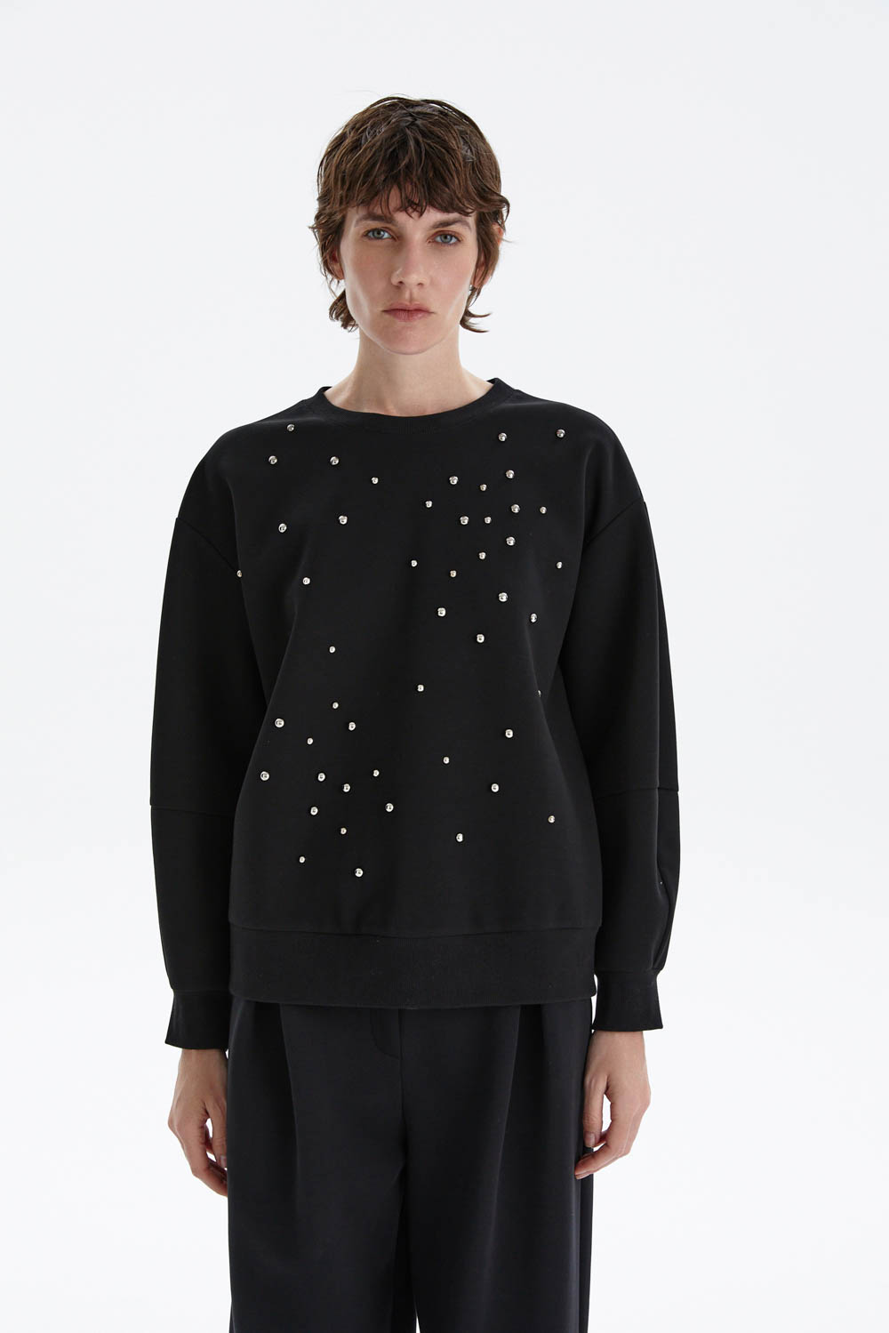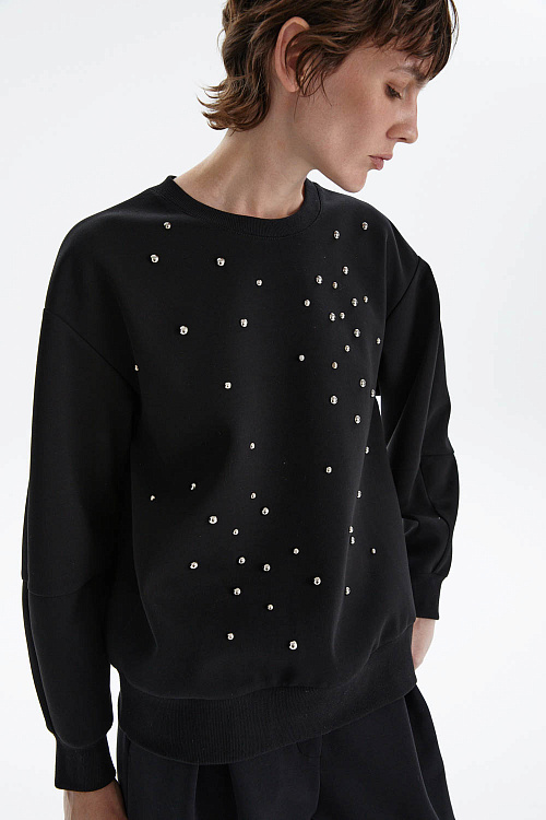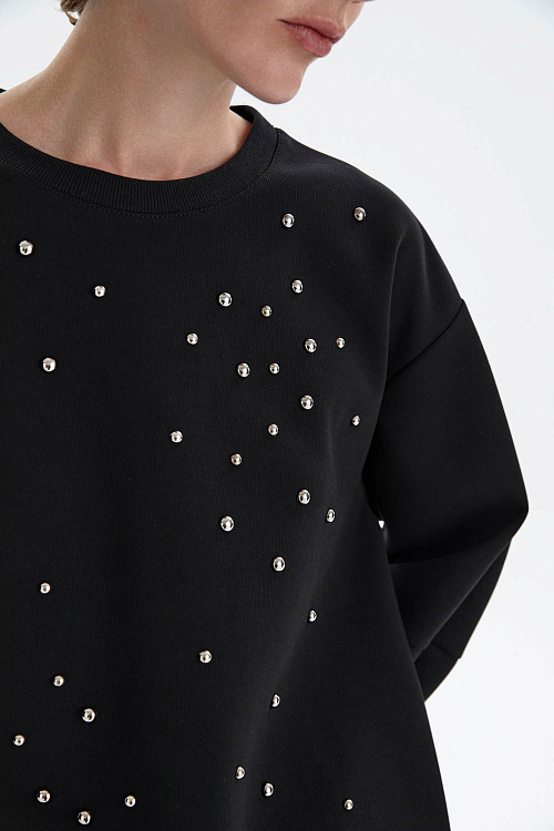 Свитшот свободного кроя в чёрном цвете с декоративной россыпью металлических страз на передней части — эффектный акцент для стильных образов. Лаконичный фасон и мягкий трикотаж дарят комфорт, а мерцающие детали придают изделию изысканный характер и лёгкую игривость.