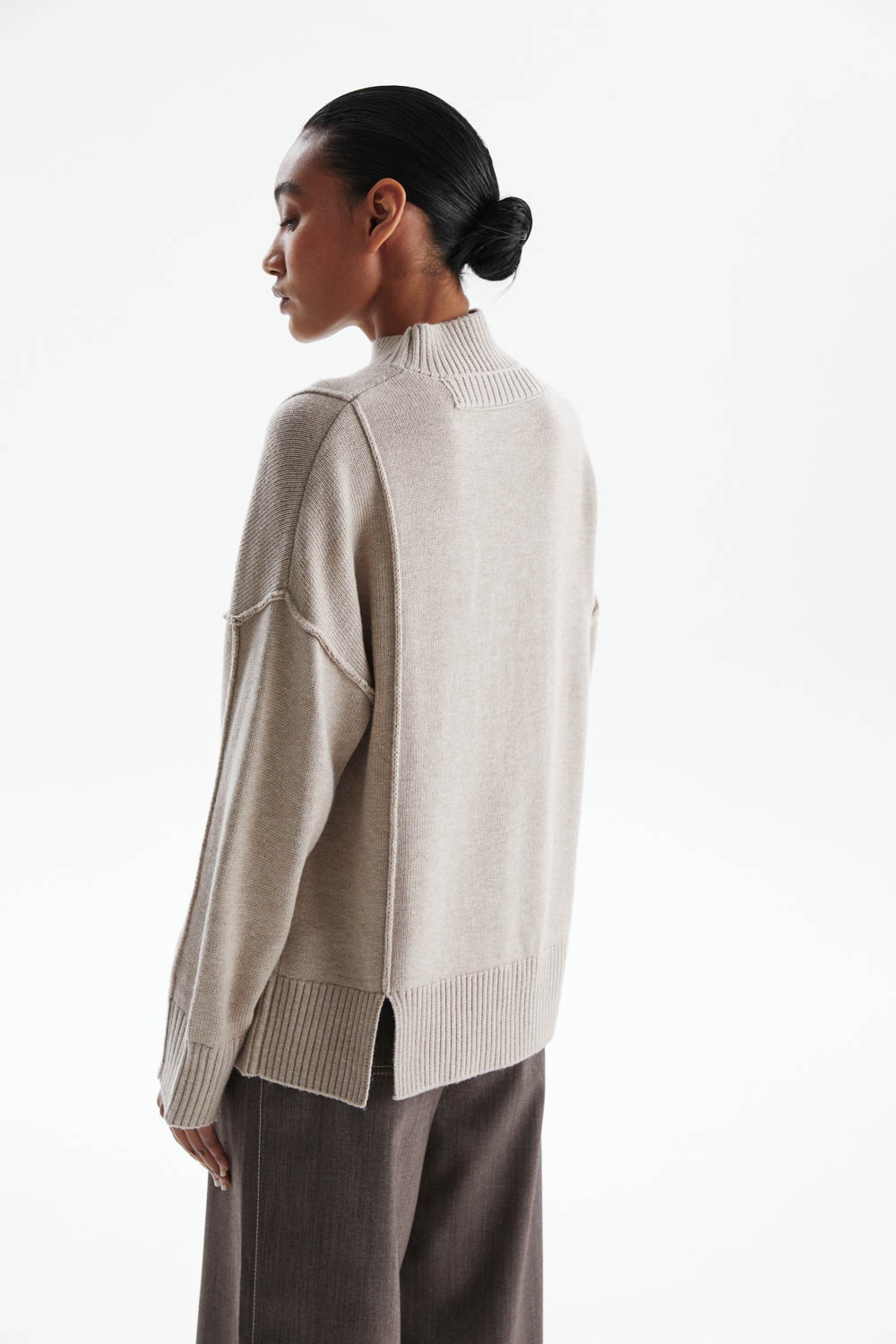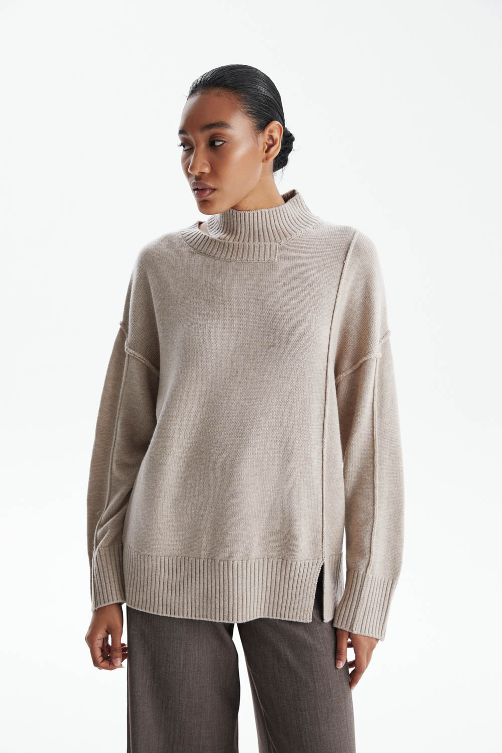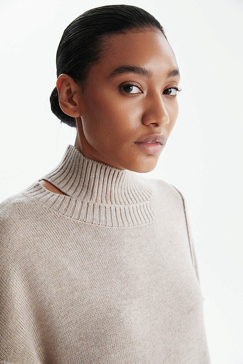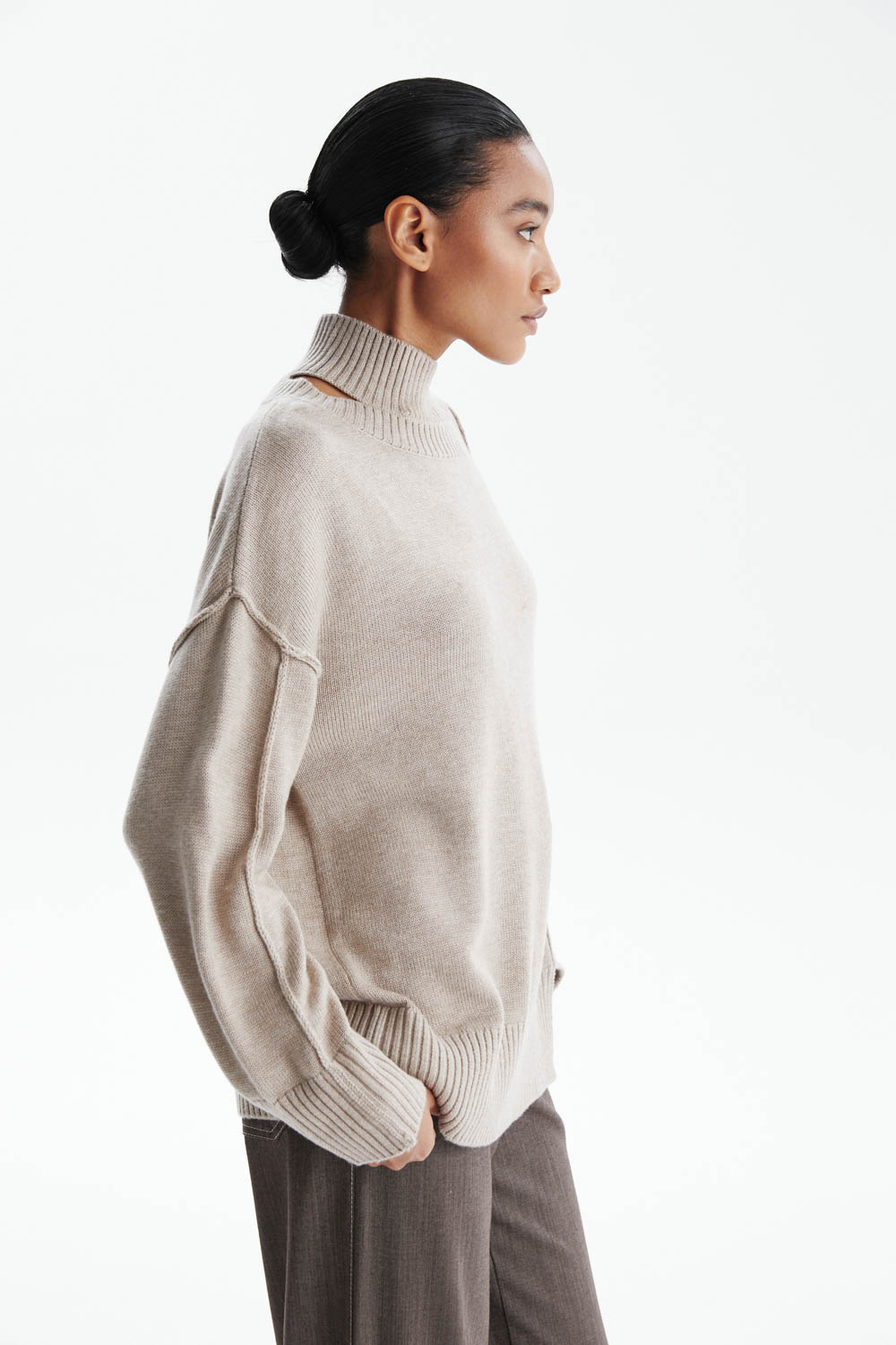 Свободный крой с удлинёнными линиями плеча и фактурной вязкой по краям создаёт расслабленный силуэт, идеально подходящий для многослойных образов. Высокий ворот с оригинальным вырезом добавляет изделию современный акцент и делает его стильной альтернативой привычным базовым вещам.