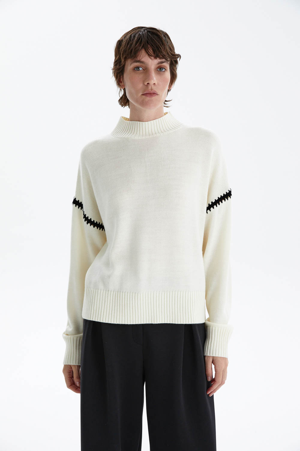 Прямой силуэт с комфортной посадкой и аккуратным воротником-стойкой создаёт элегантный и современный акцент. Контрастная декоративная строчка по линии рукава добавляет графичности и подчёркивает индивидуальность модели.