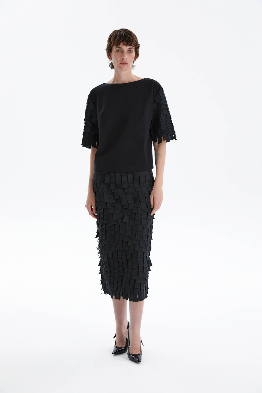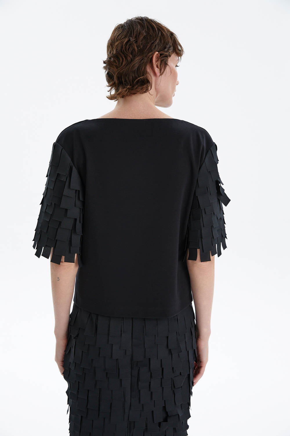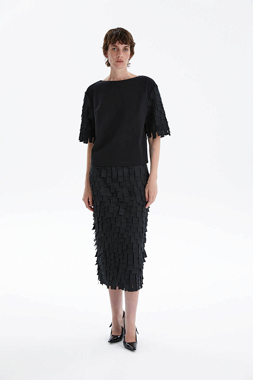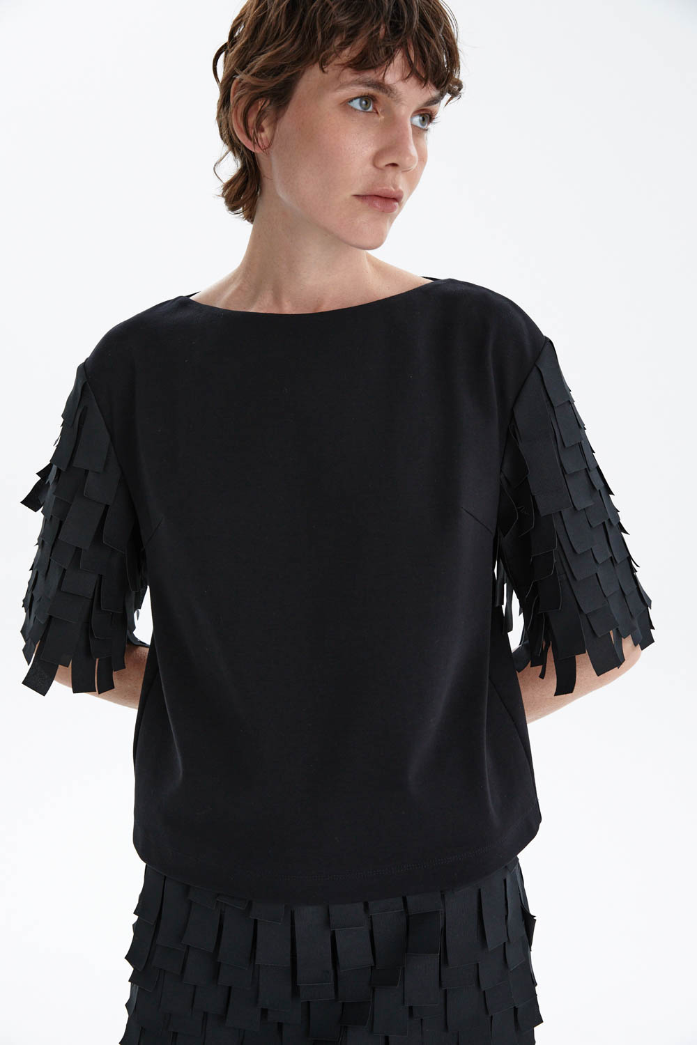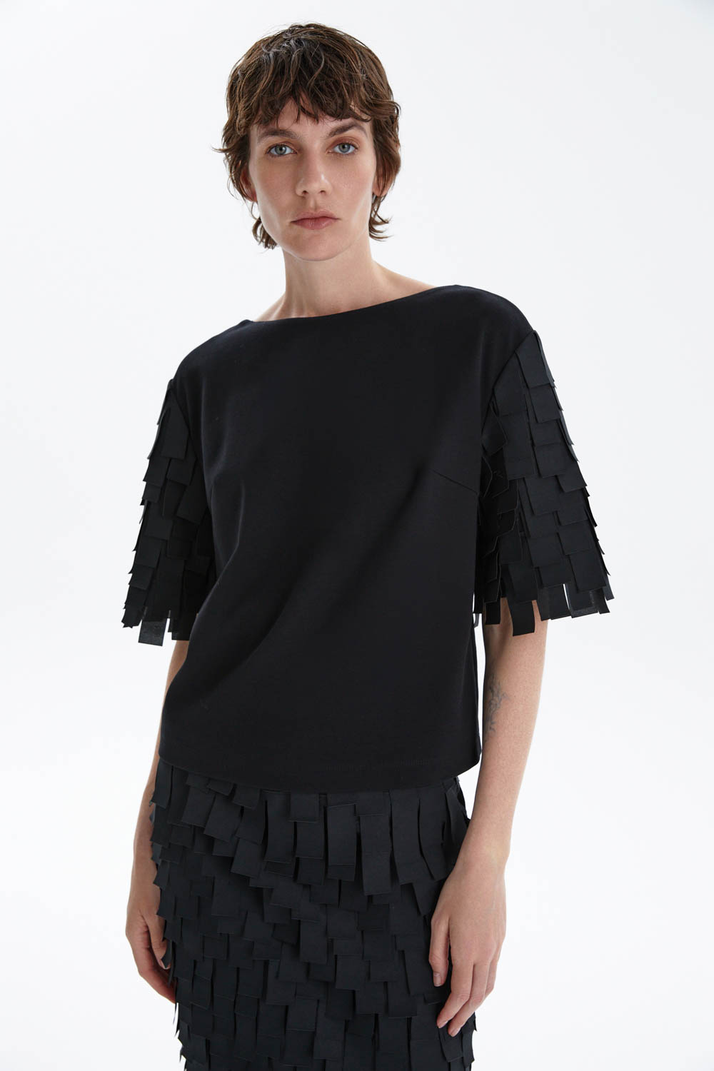 Чёрная футболка из мягкого джерси выполнена в прямом крое и отличается оригинальными акцентами. Главная деталь — фактурные рукава, декорированные квадратными нашивками, которые создают объём, динамику и эффект многослойности.