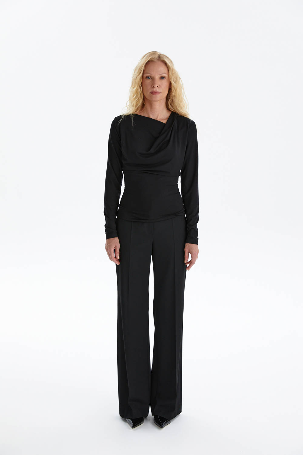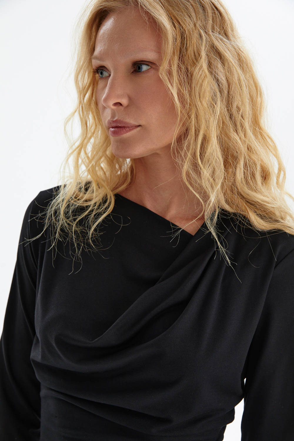 Чёрный лонгслив из мягкого вискозного трикотажа сочетает комфорт и элегантность. Приталенный силуэт подчёркивает фигуру, а драпированный вырез с лёгкой асимметрией добавляет изысканности и динамики. Длинные рукава со слегка присборенной формой вносят женственный акцент, сохраняя при этом лаконичный характер модели.