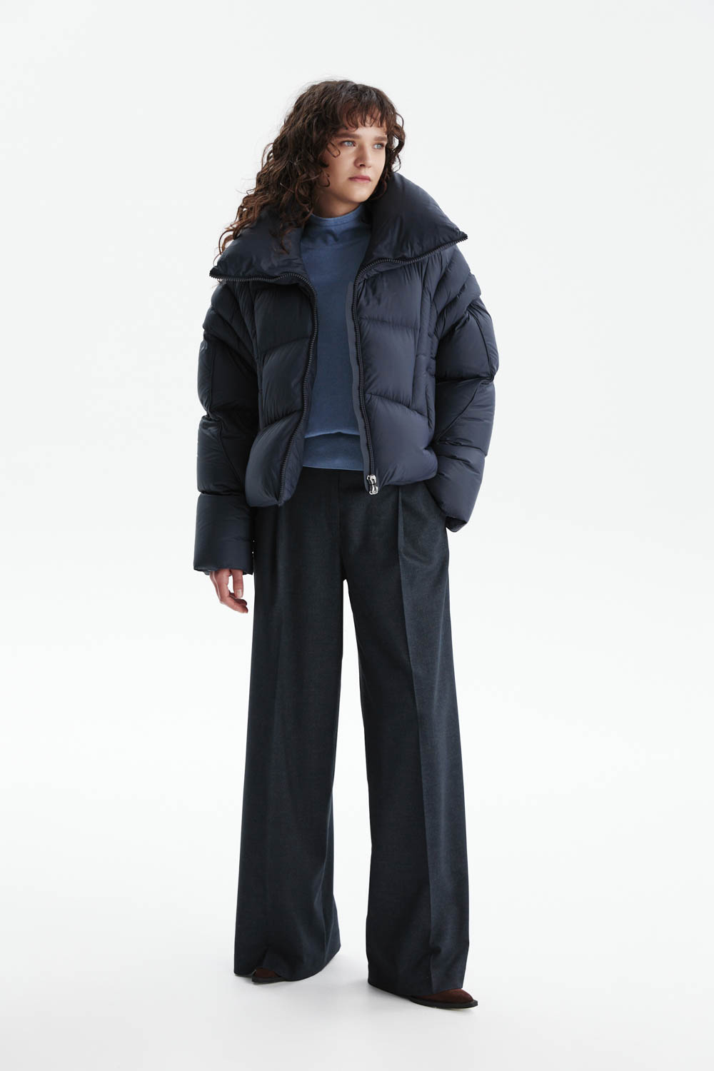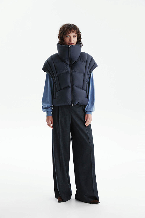 Съёмные рукава на молнии позволяют легко превратить модель в жилет, подстраиваясь под разную погоду и стиль. Высокий воротник-стойка надёжно защищает от ветра и холода, а прямой крой с мягким объёмом обеспечивает комфорт и актуальный городской характер.