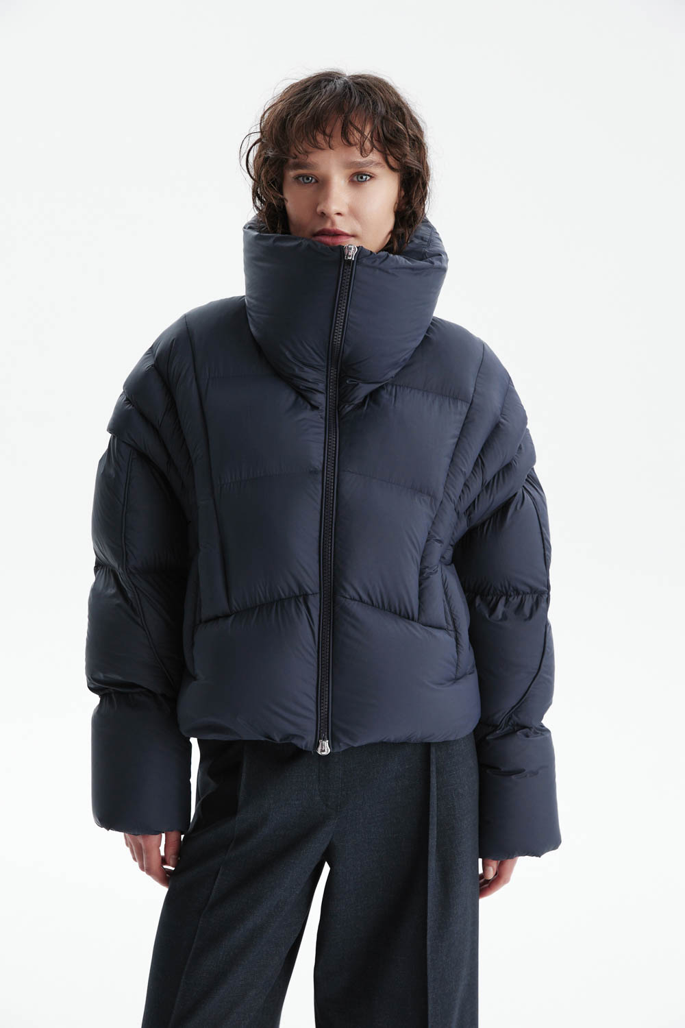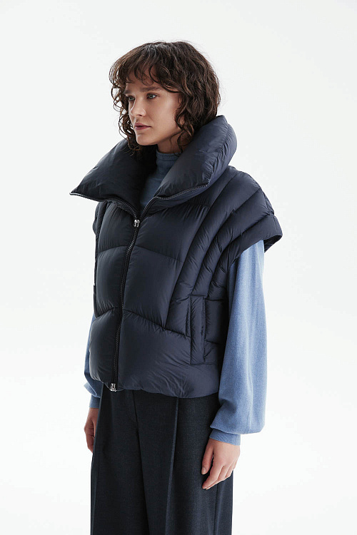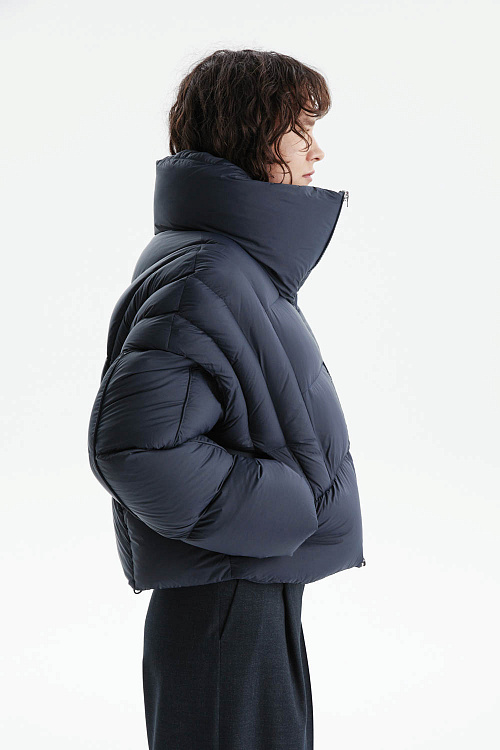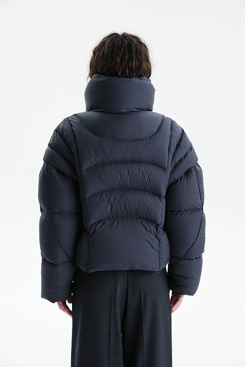 Укороченный пуховик-трансформер глубокого синего цвета выполнен из гладкой матовой ткани с эффектной фигурной стёжкой, создающей современный силуэт.