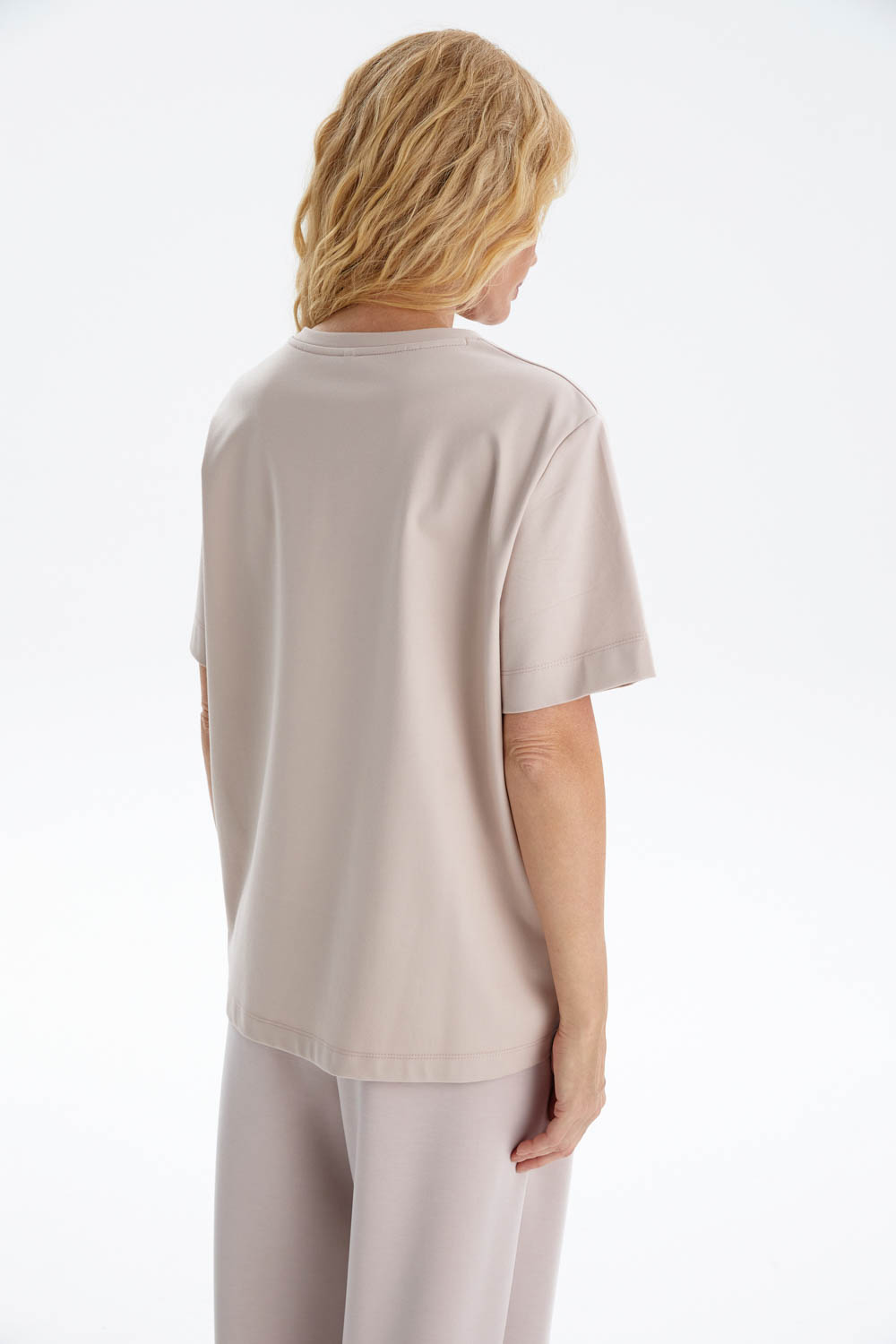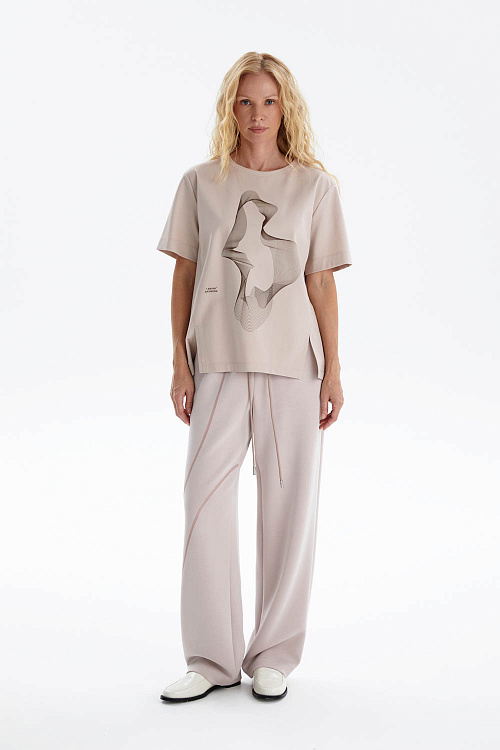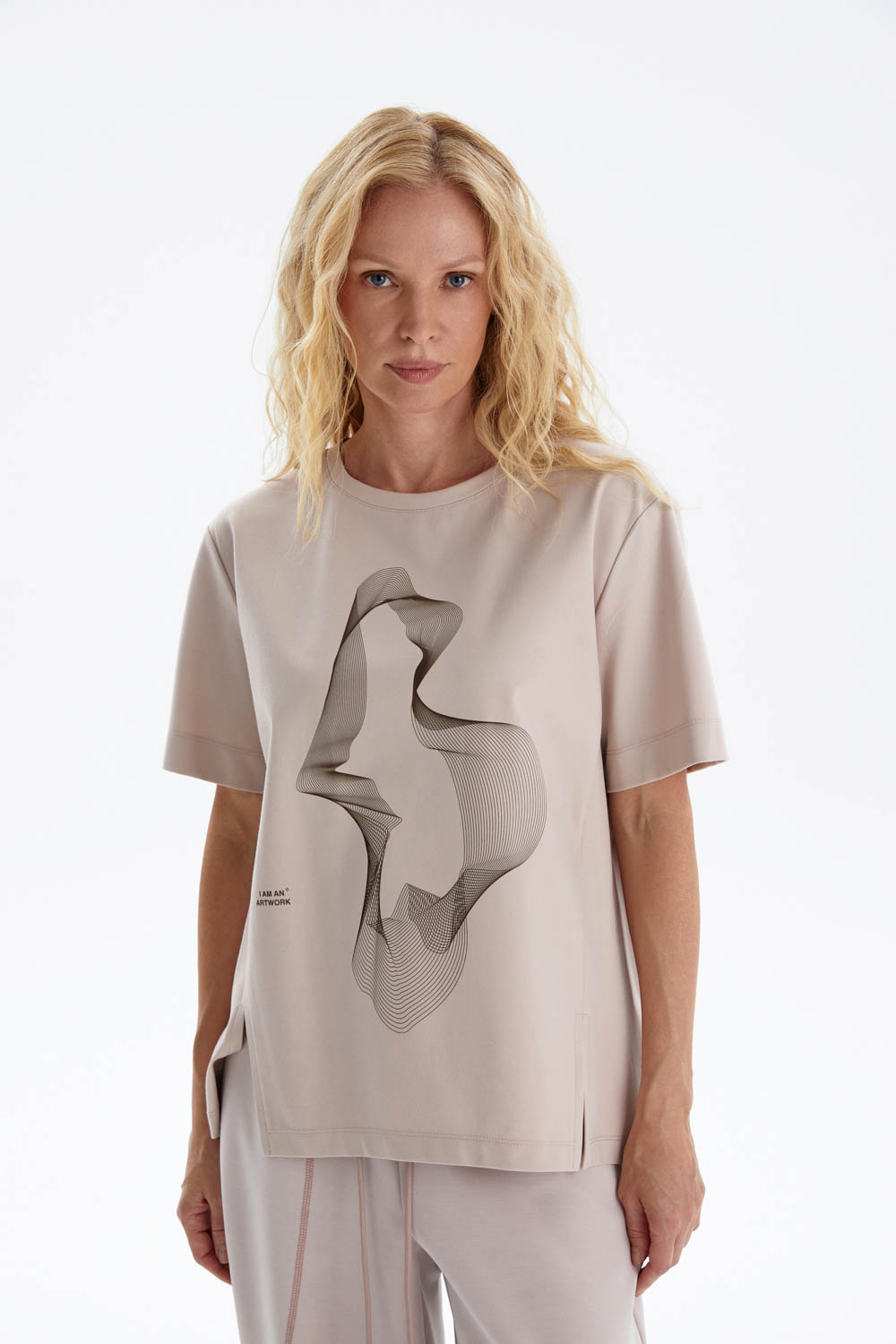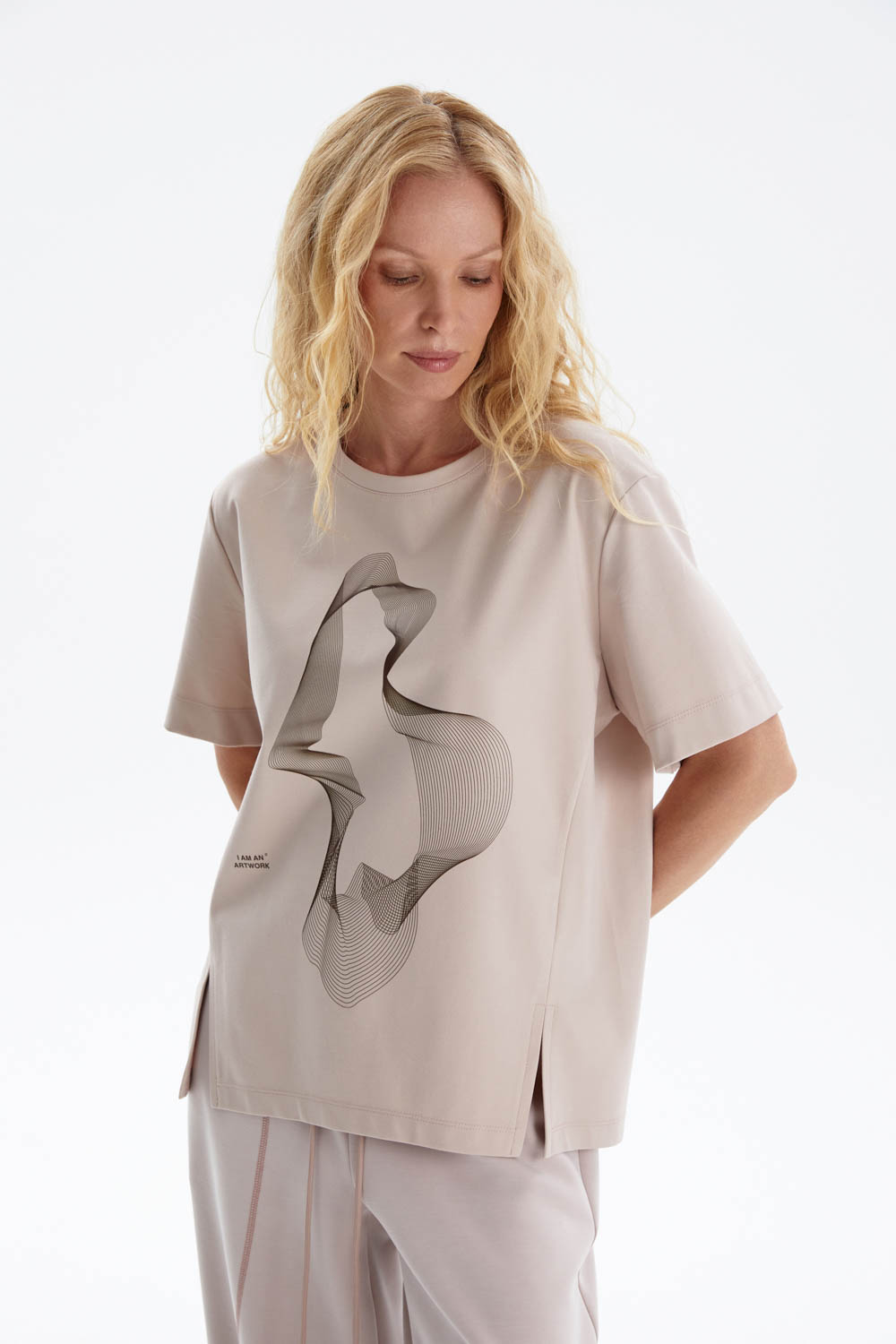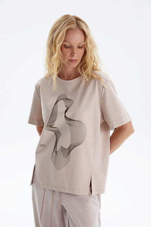 Футболка нежно-нюдового оттенка, украшенная абстрактным принтом с надписью «I AM AN ARTWORK» («Я произведение искусства»), подчеркивающей уникальность каждой личности.