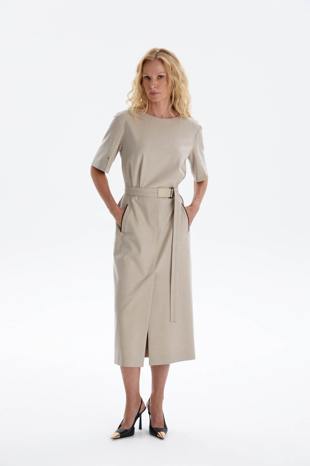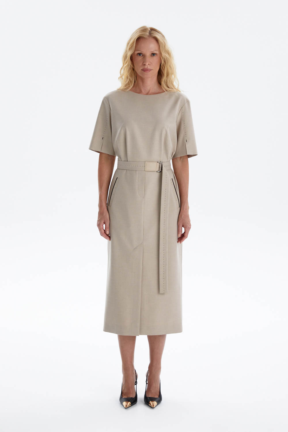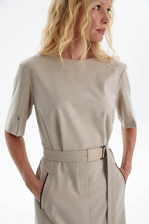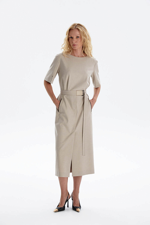 Модель оснащена накладными карманами с декоративной отделкой, а пояс с кожаной пряжкой и имитацией ручного стежка акцентирует талию и завершает дизайн. Скрытая молния на спинке деликатно вписывается в дизайн платья, сохраняя его изящный силуэт и создавая ощущение безупречной цельности образа.