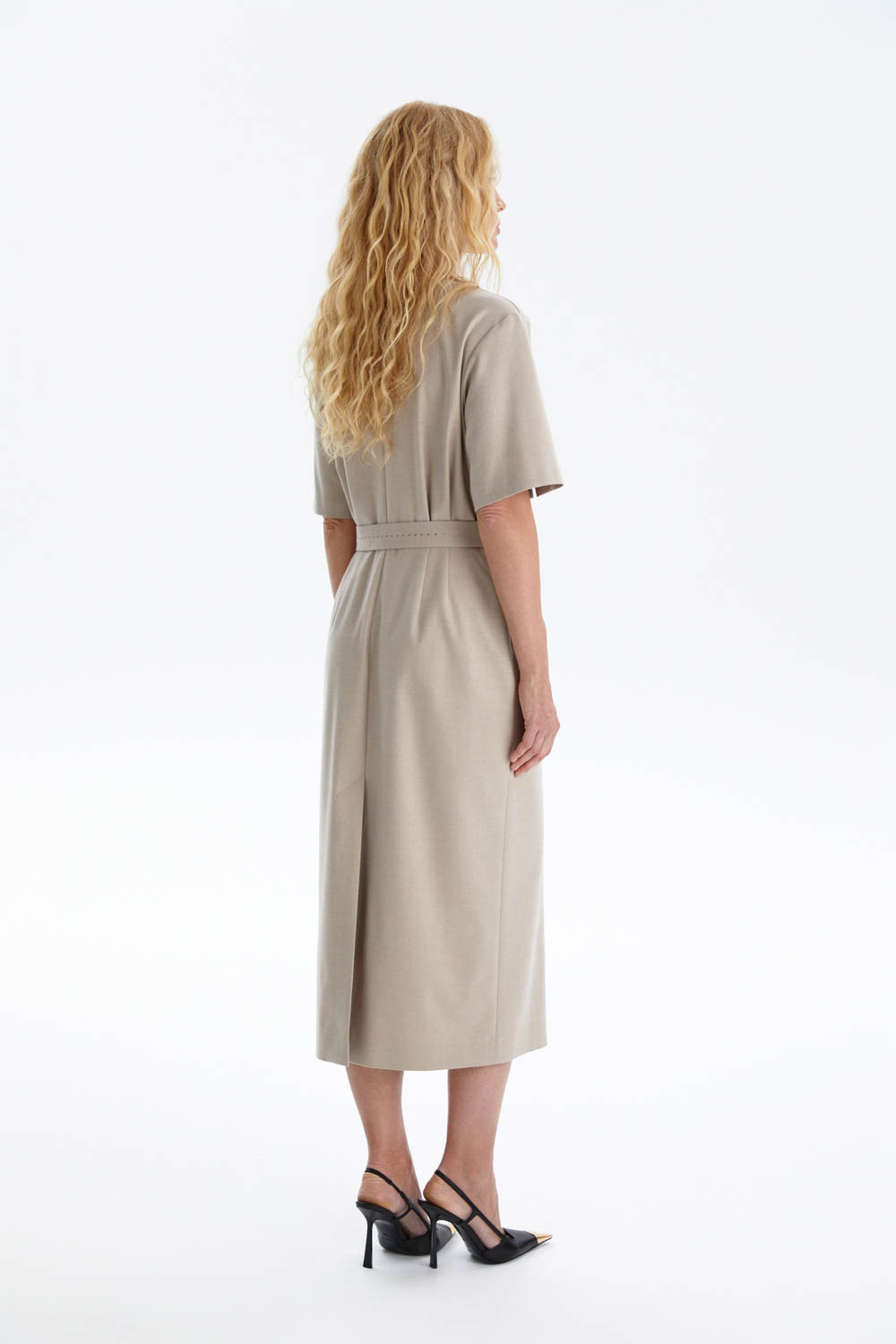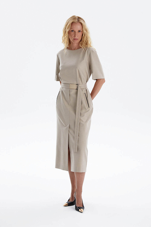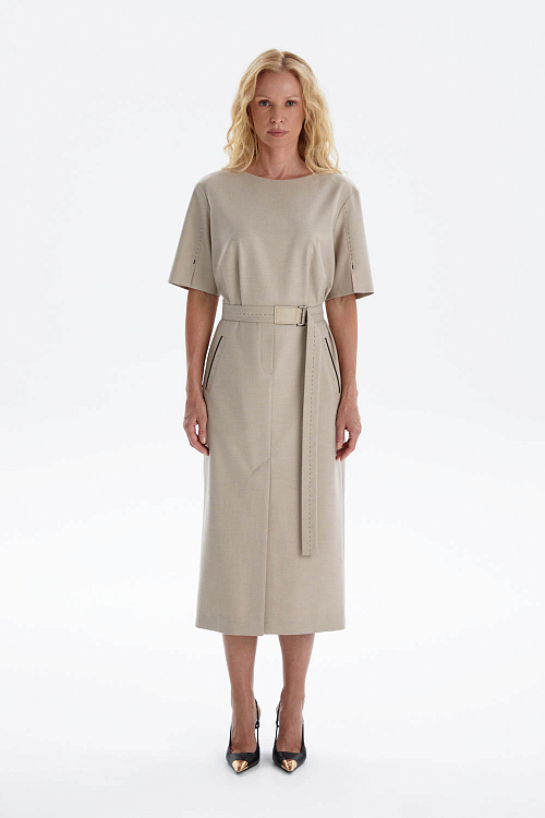 Платье-футляр миди длины выполнено из мягкой костюмной ткани в универсальном бежевом оттенке.
