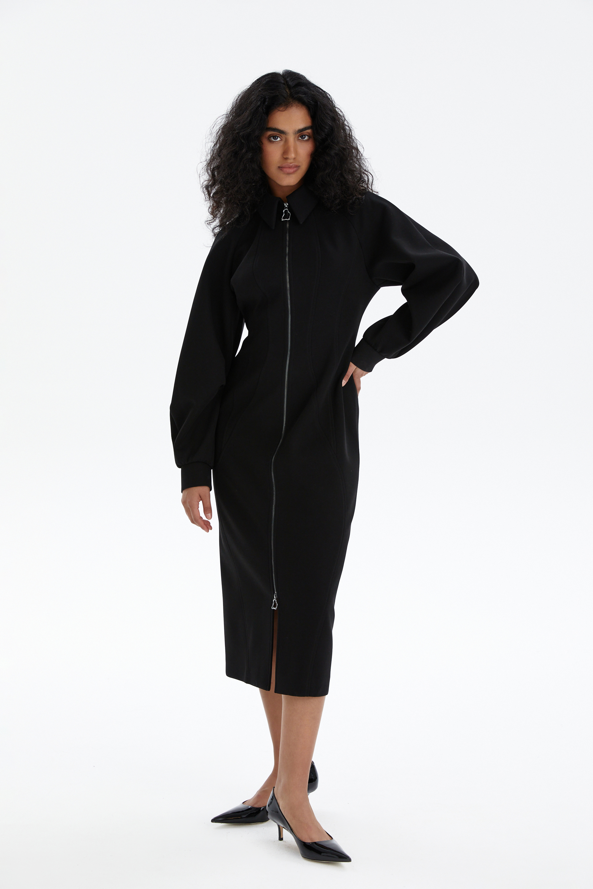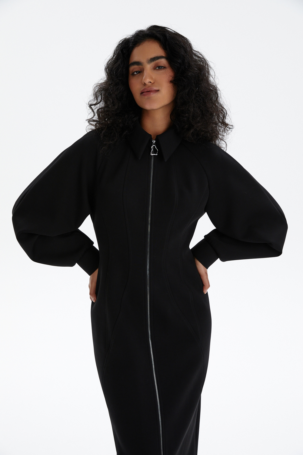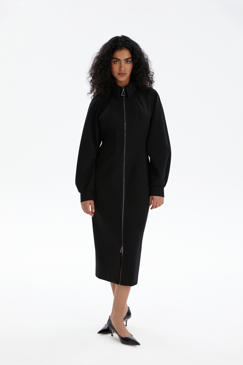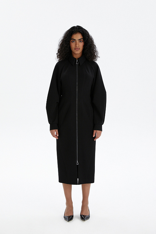 Приталенный силуэт длиной ниже колена подчёркнут рельефными швами с аккуратной отстрочкой, которые визуально вытягивают фигуру. Акцентные объёмные рукава-реглан с широкими манжетами добавляют выразительности, а рубашечный воротник придаёт строгий и в то же время актуальный характер. Центральная металлическая молния на всю длину делает модель функциональной и динамичной, позволяя варьировать стиль от делового до более расслабленного.