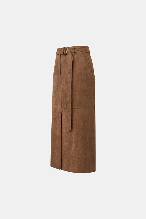Юбка миди прямого силуэта выполнена из мягкой искусственной замши в коричневом оттенке.