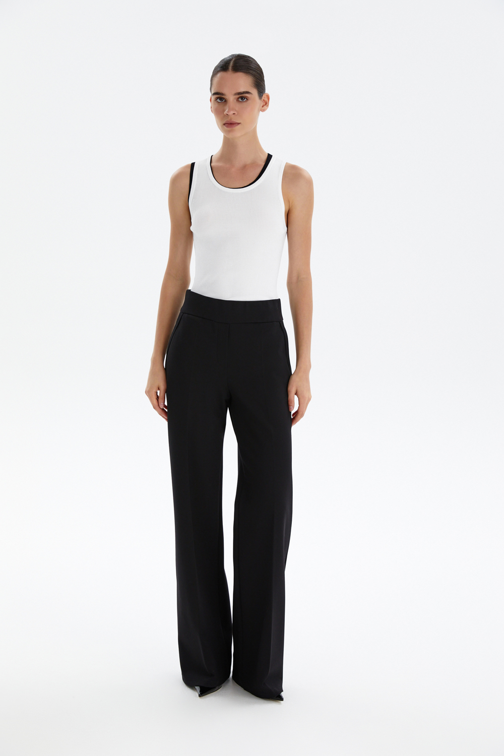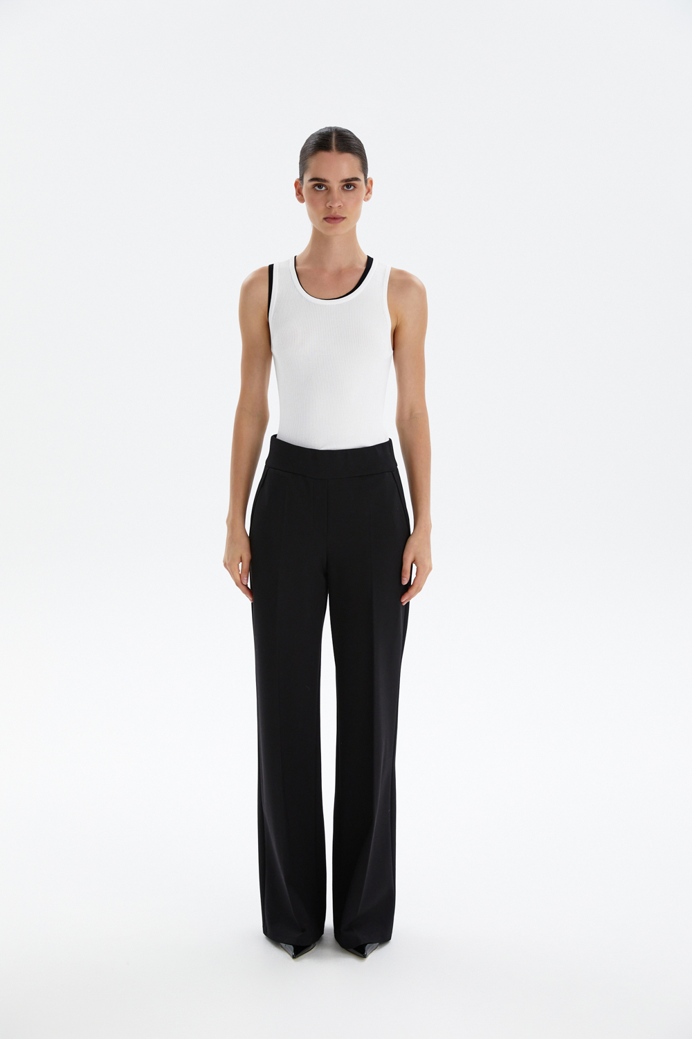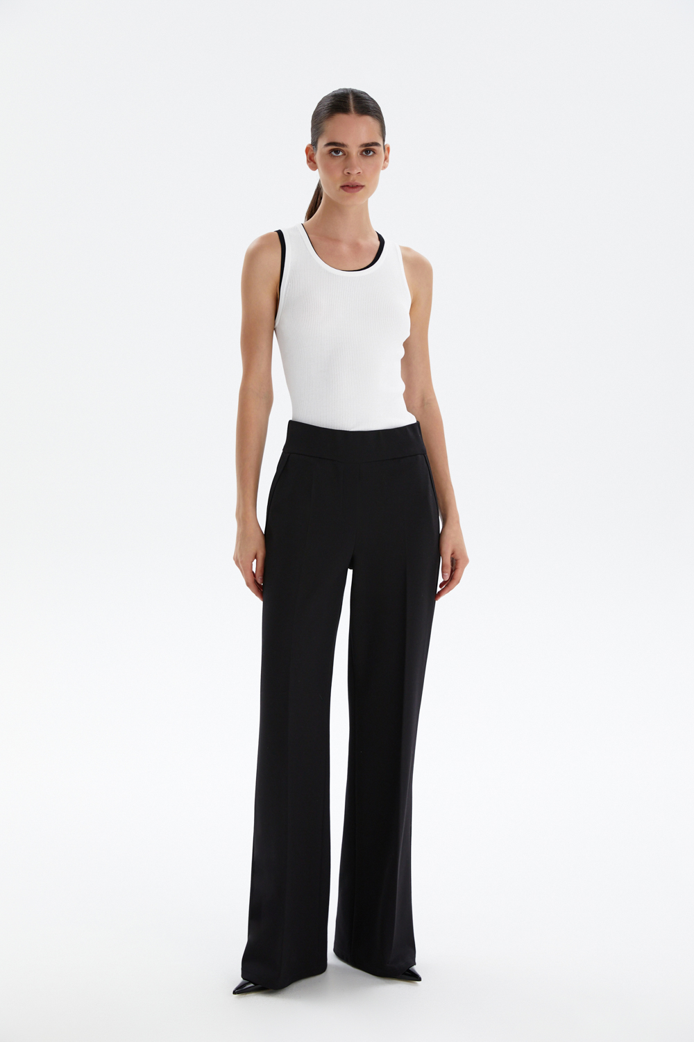 Лаконичный крой с высокой посадкой и прямыми широкими штанинами создаёт элегантный силуэт, который визуально вытягивает фигуру и делает образ более утончённым. Аккуратные боковые карманы добавляют функциональности, а строгие линии подчёркивают универсальный характер модели.