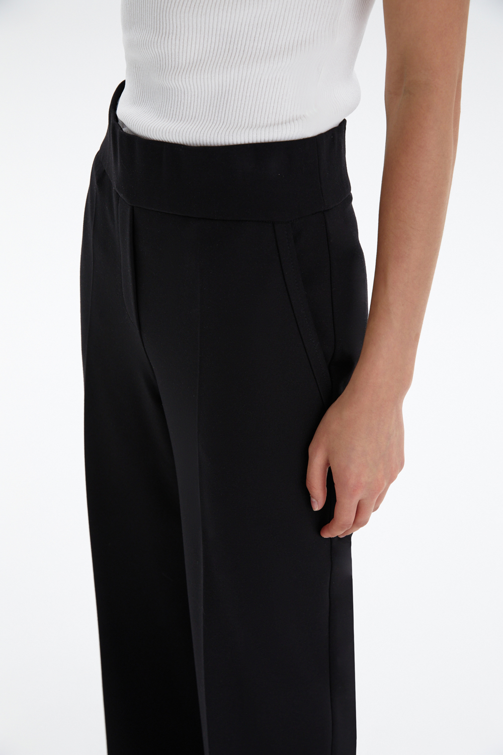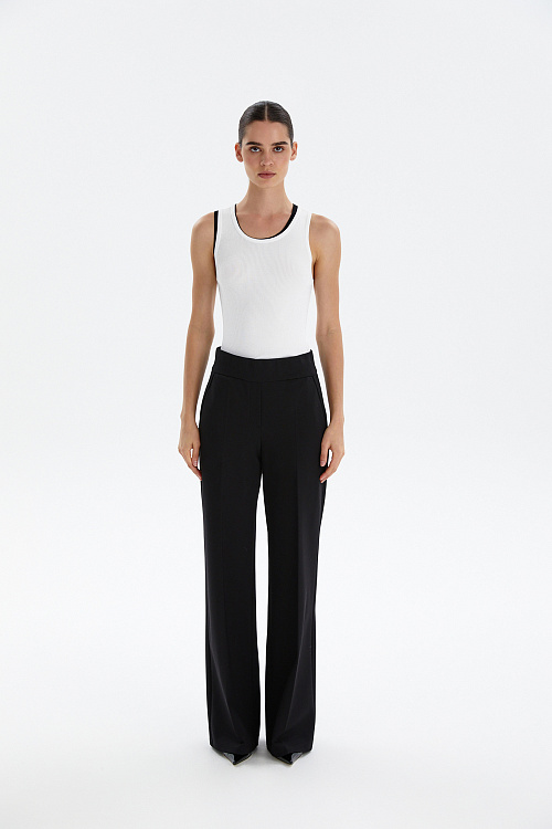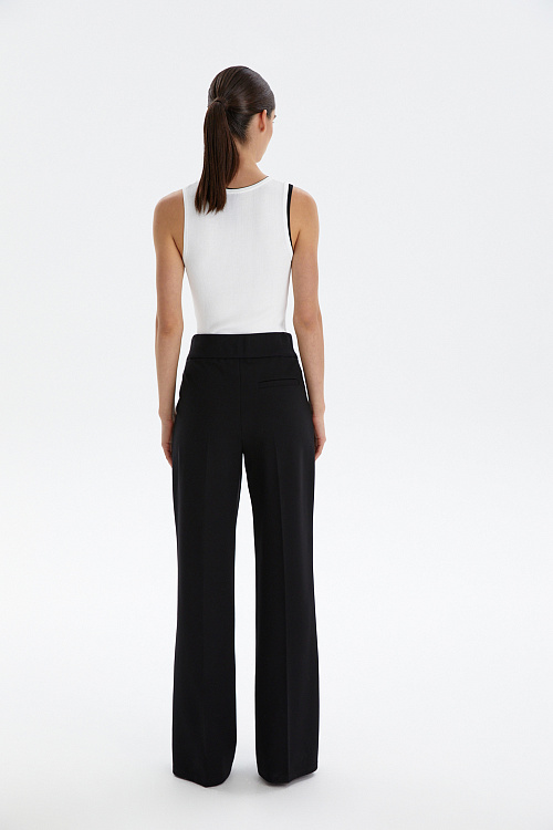 Брюки выполнены из гладкой трикотажной ткани глубокого чёрного оттенка.