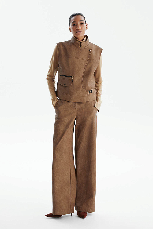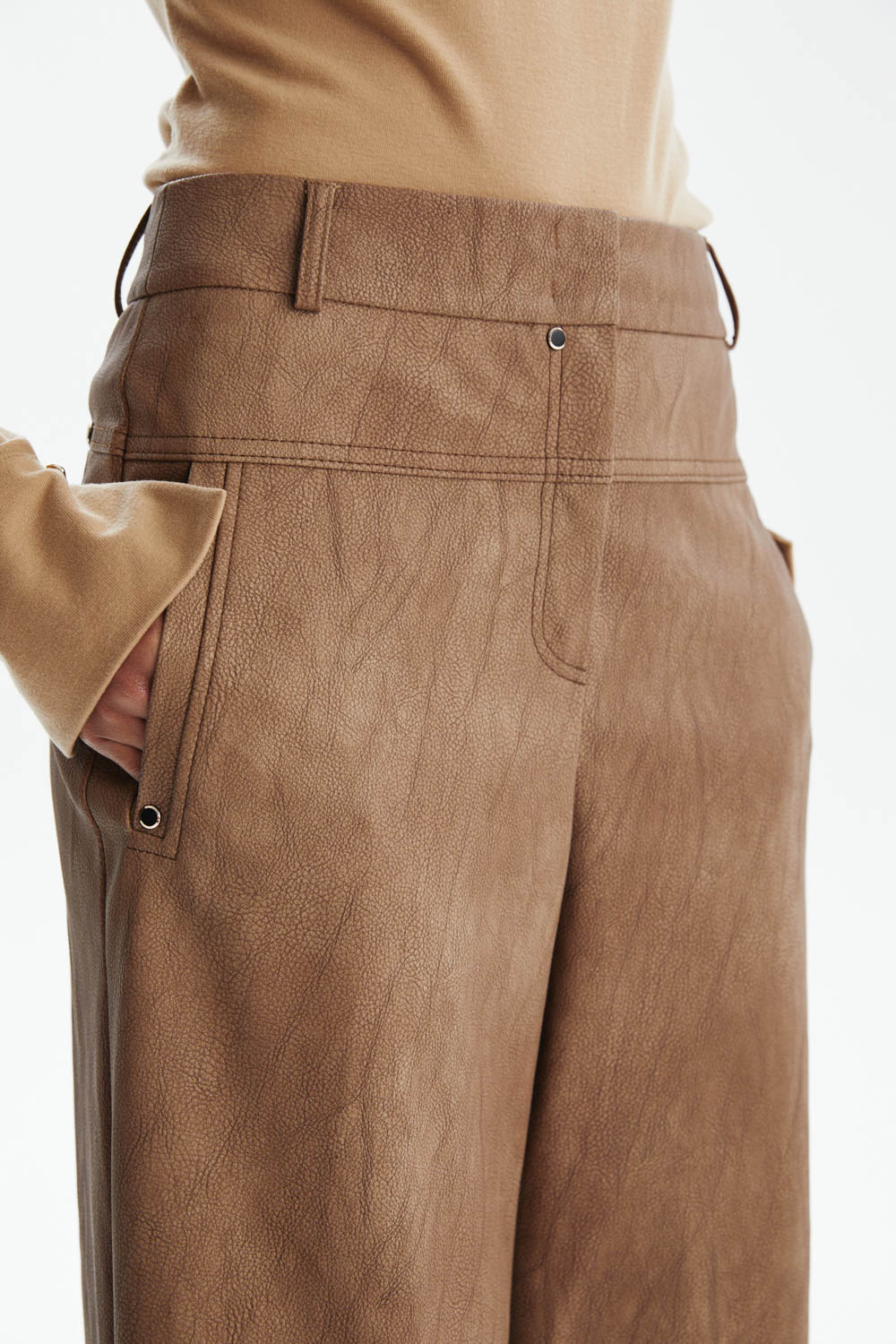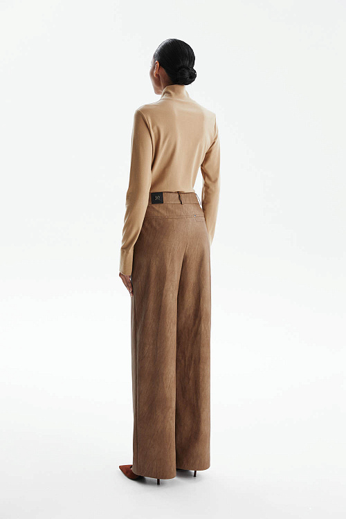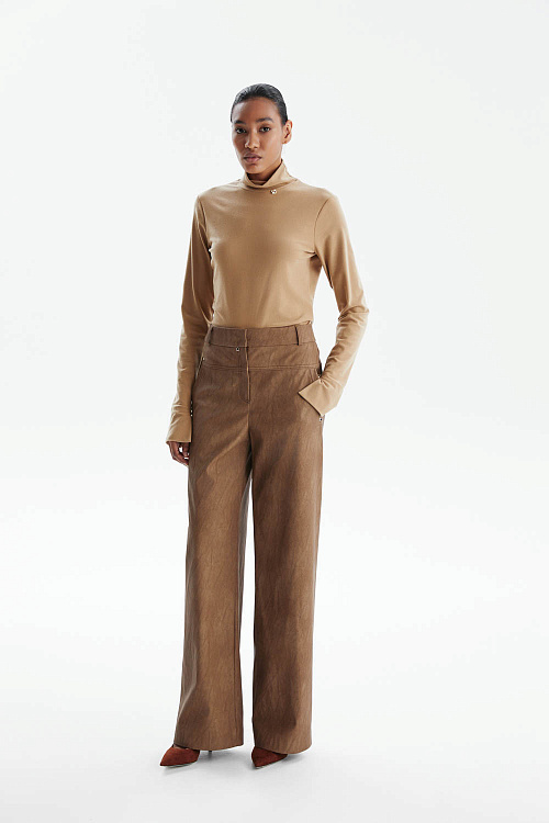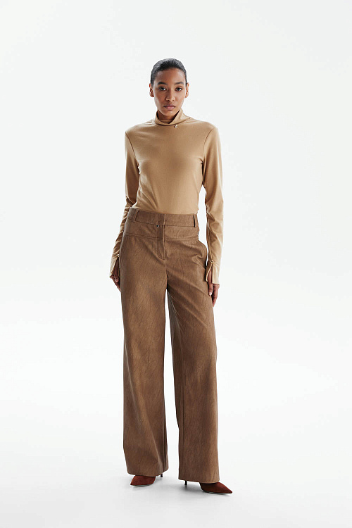 Прямые брюки из мягкой экокожи тёплого карамельного оттенка — воплощение утончённой элегантности и современного стиля. Широкий крой визуально вытягивает силуэт, а высокая посадка подчёркивает талию, создавая выразительный и благородный образ.