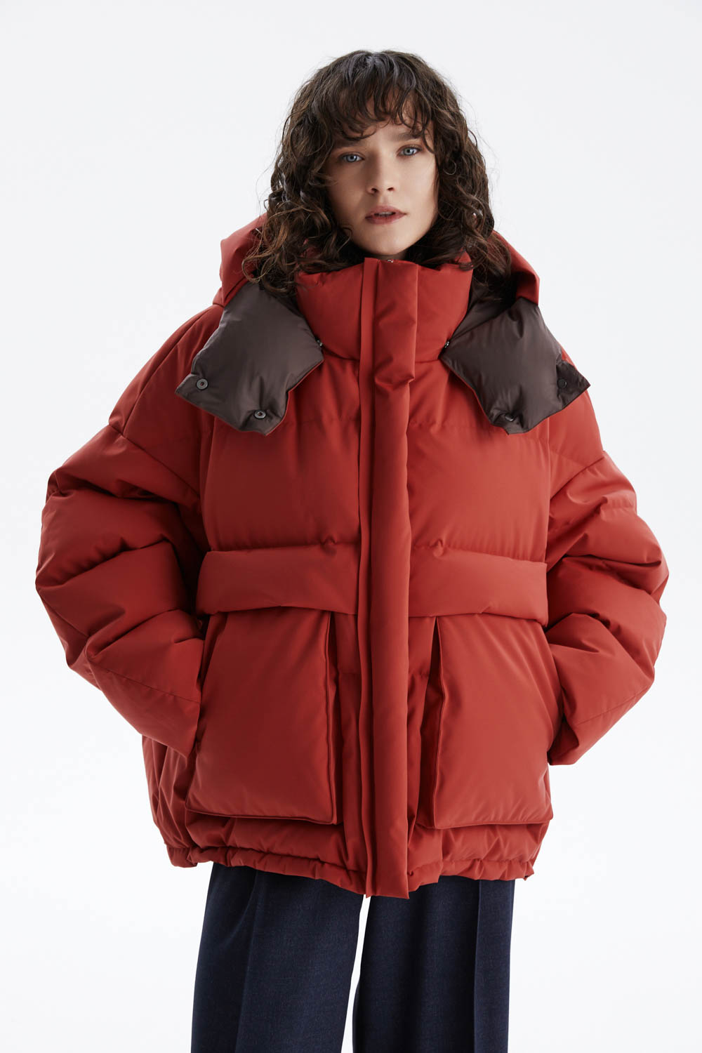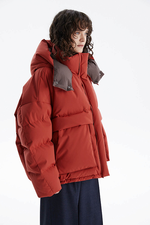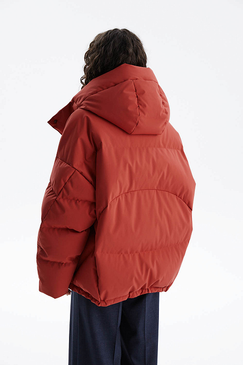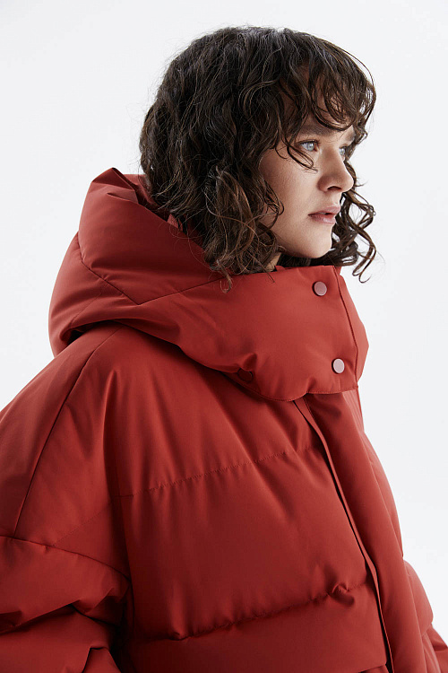 Объёмный пуховик-пальто в насыщенном терракотовом оттенке сочетает лёгкость, тепло и современный стиль.