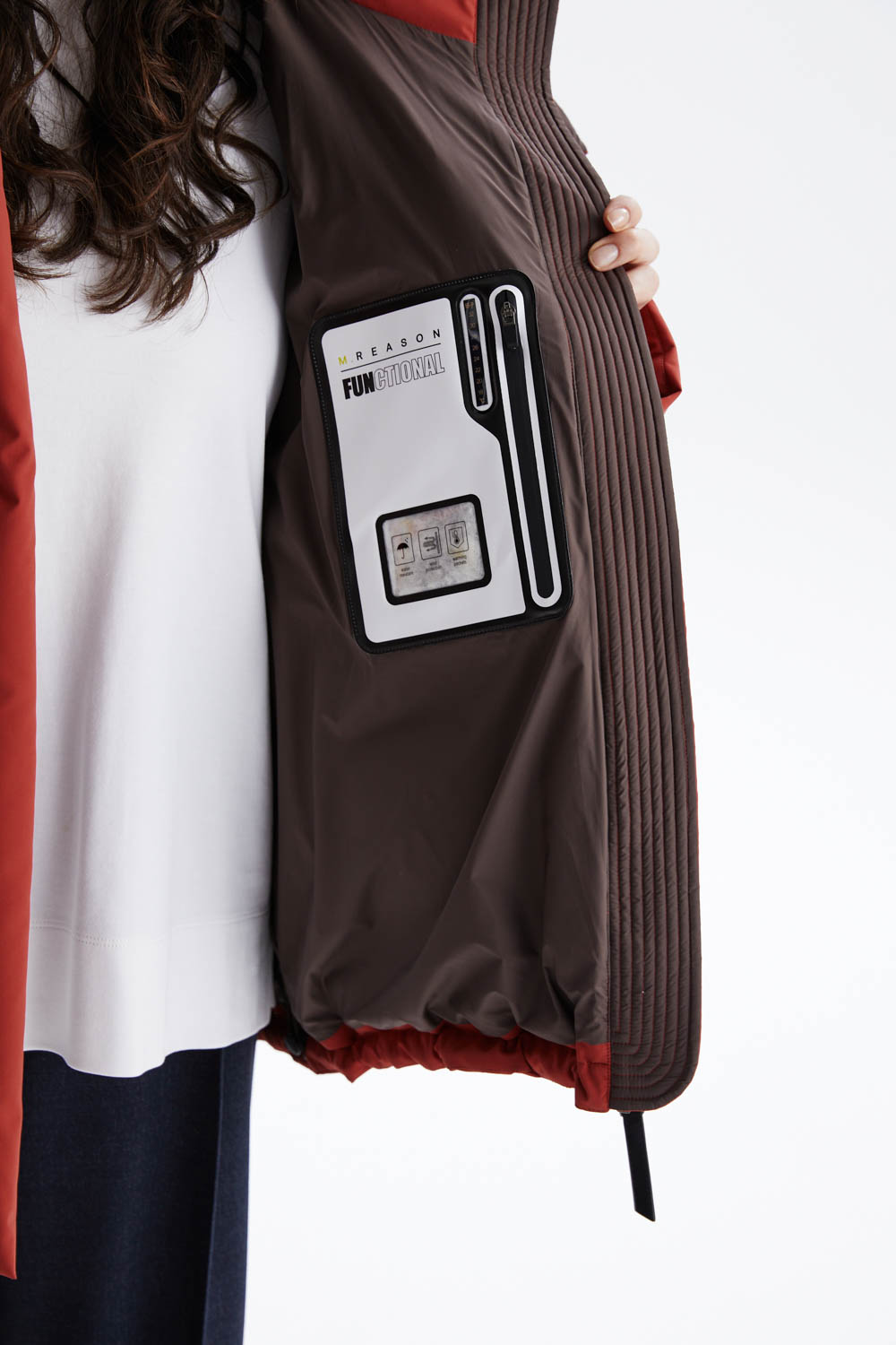 Лёгкий, но тёплый наполнитель эффективно удерживает тепло даже при морозах до –25 °C, не утяжеляя силуэт и даря ощущение комфорта. Внутри расположен декоративный термометр, указывающий температурный режим носки — стильная деталь, подчеркивающая продуманность дизайна.