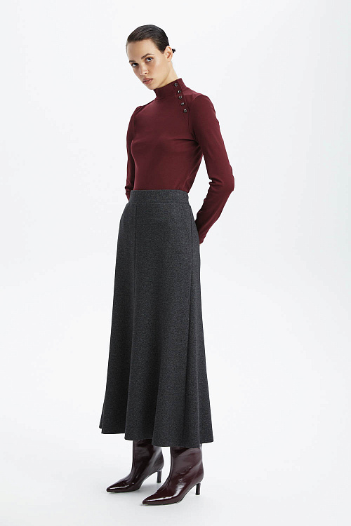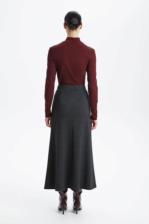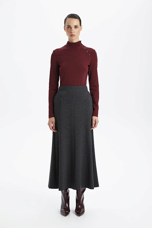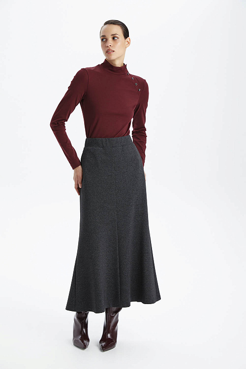 Юбка миди выполнена из плотного графитового джерси с эффектом твидового плетения, что обеспечивает мягкость, комфорт и красивое драпирование. Высокая посадка и слегка расклёшенный силуэт от линии бёдер подчёркивают элегантность и визуально вытягивают фигуру, создавая современный, сдержанный образ.