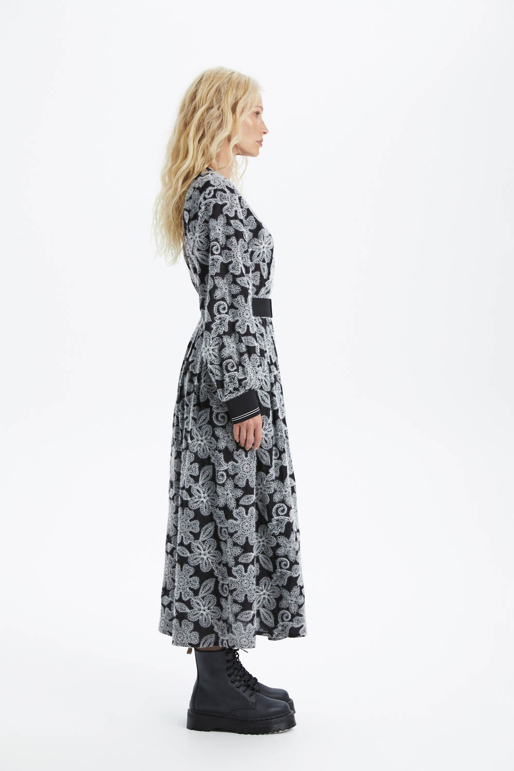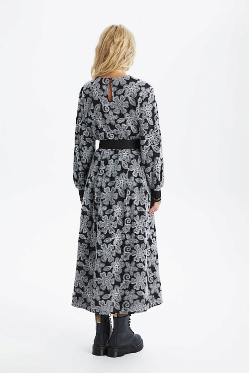 Платье выполнено из чёрной тонкой ткани с фактурной вышивкой ворсистыми нитями и контрастным серо-белым цветочным узором, создающим эффект объёмного кружева и подчёркивающим утончённый, элегантный характер модели.