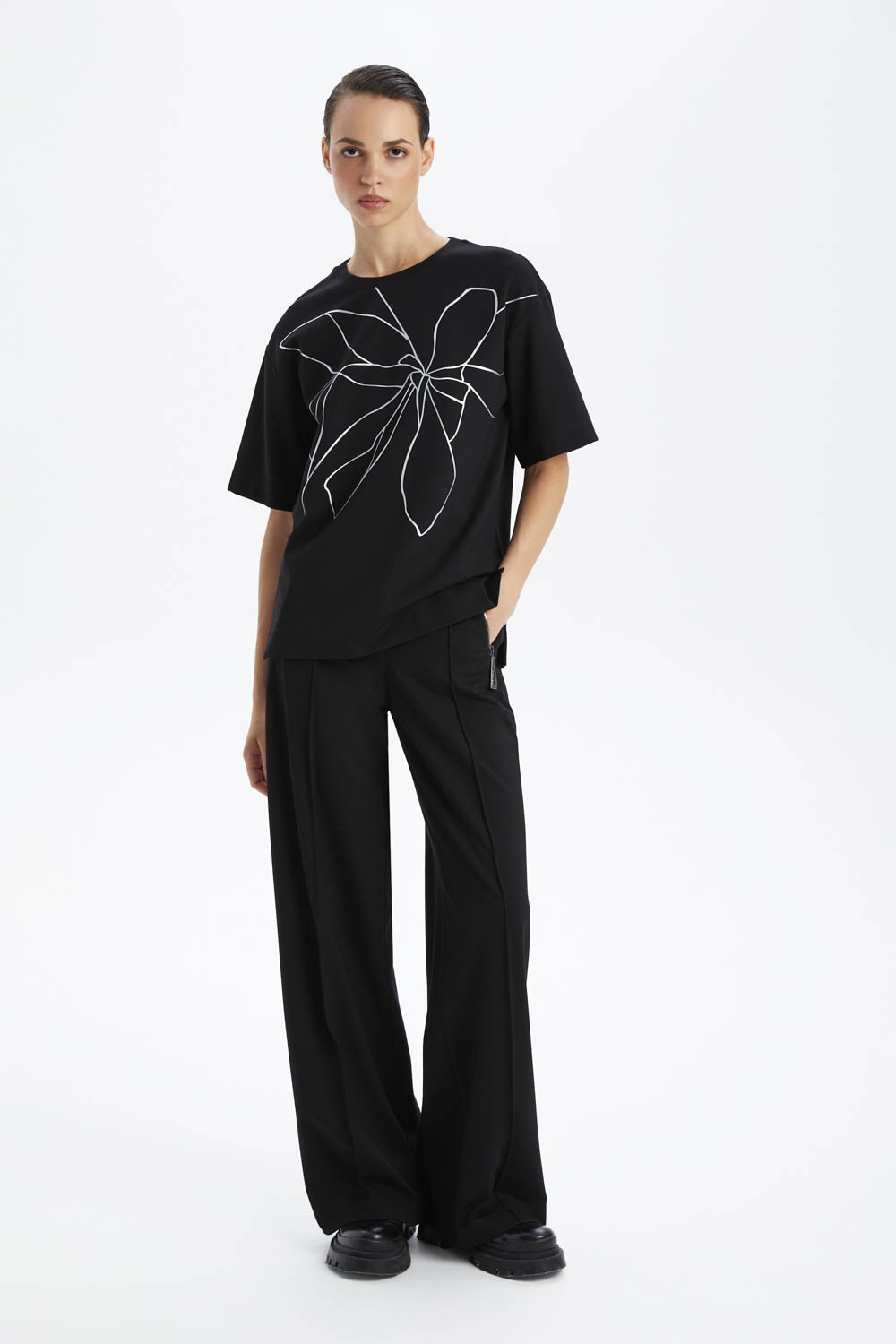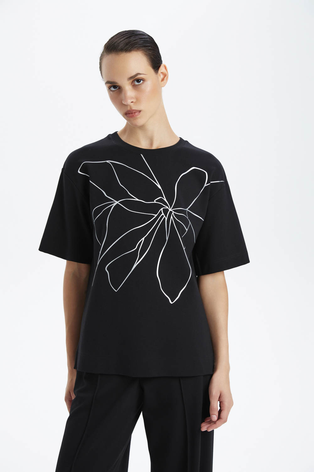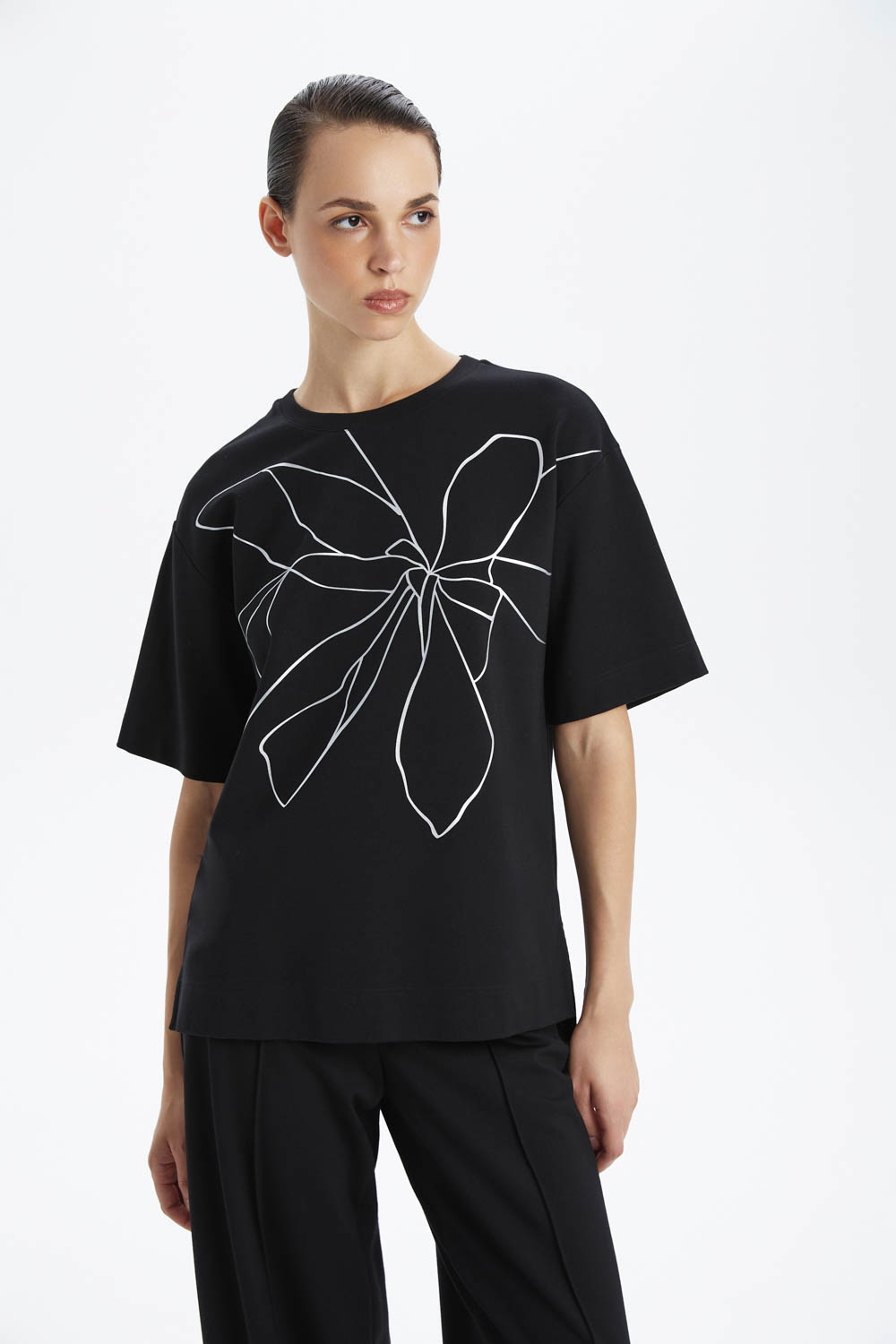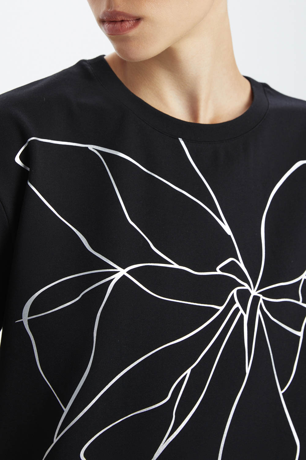 Приспущенная линия плеча, короткие рукава и асимметричная линия низа с небольшими разрезами по бокам создают лёгкий объём, комфортную посадку и современный акцент. По переду расположен цветочный принт серебристого цвета, который подчёркивает стильный характер модели и делает её акцентной. Круглый вырез горловины с тонкой эластичной обработкой завершает лаконичный дизайн.