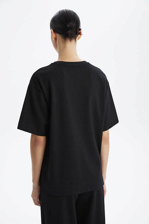 Футболка прямого свободного силуэта выполнена из плотного мягкого хлопкового трикотажа чёрного цвета, который делает её универсальной основой гардероба.