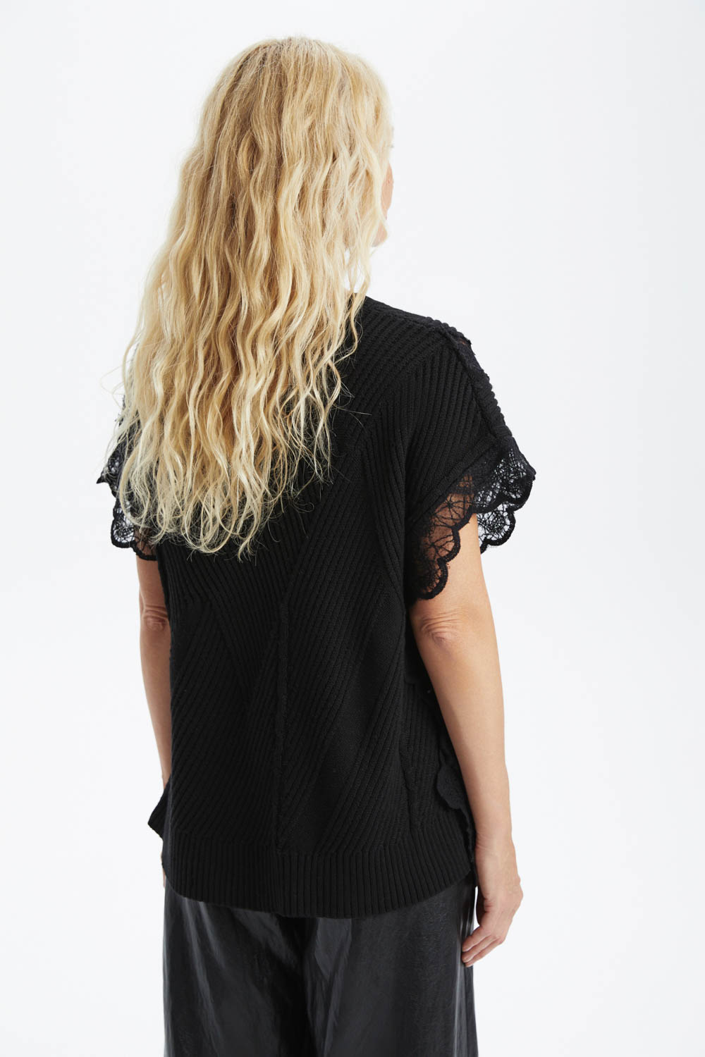 Жилет прямого силуэта выполнен из мягкого вязаного трикотажа с изящными черными кружевными вставками, создающими утончённый контраст фактур, эффект многослойности и лёгкую полупрозрачность.