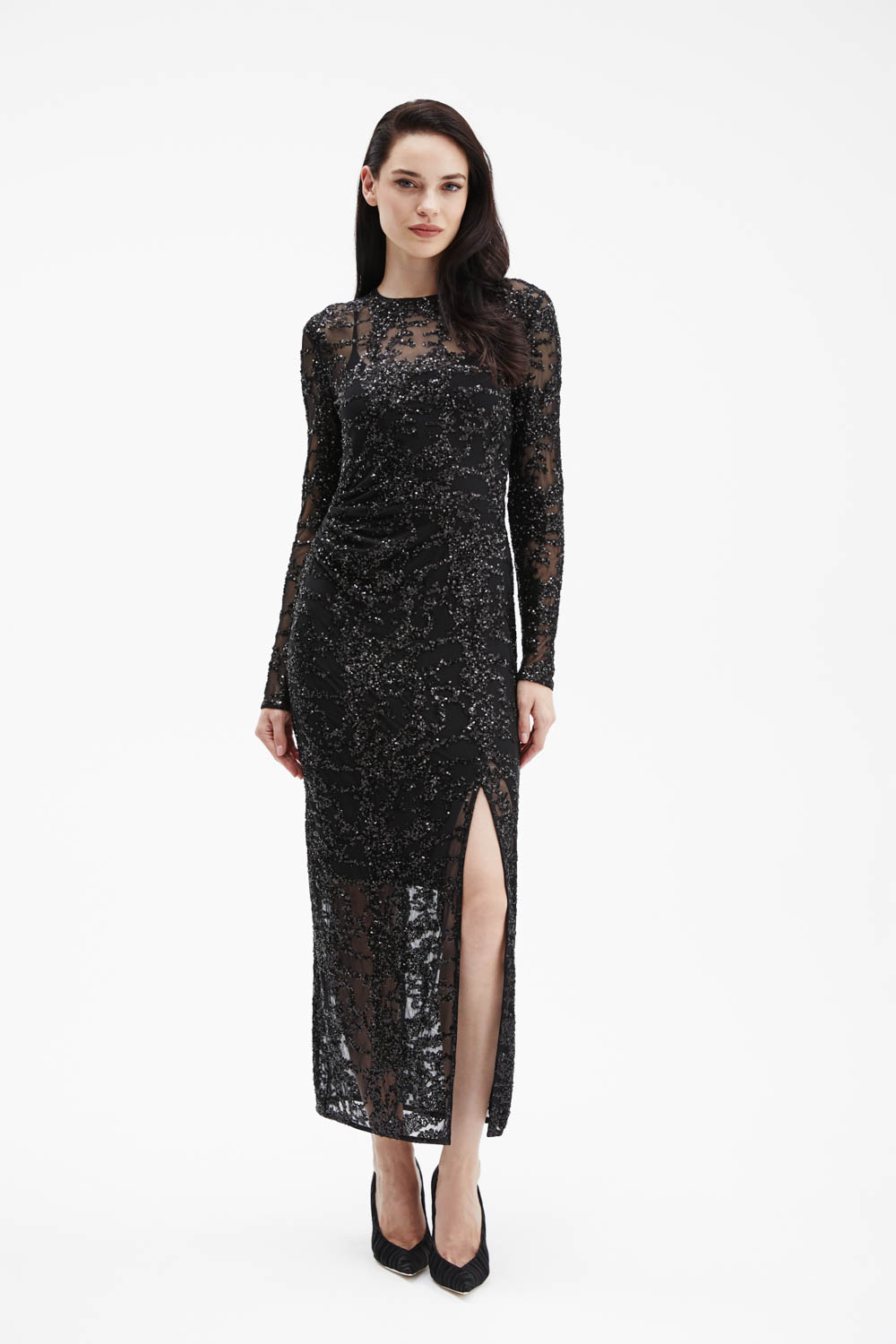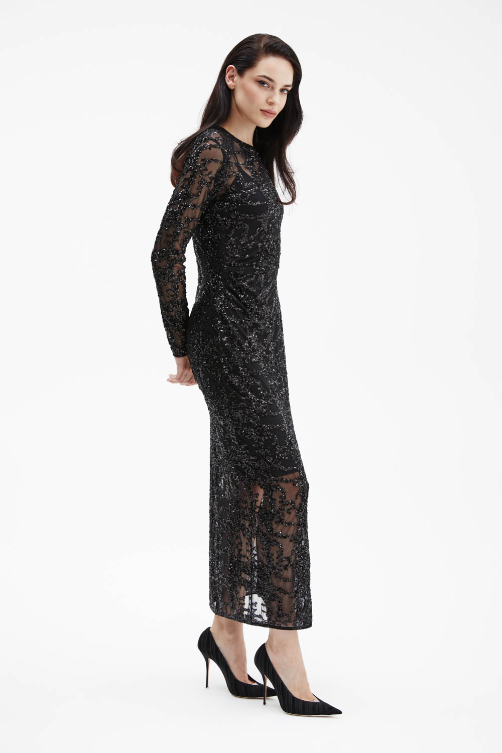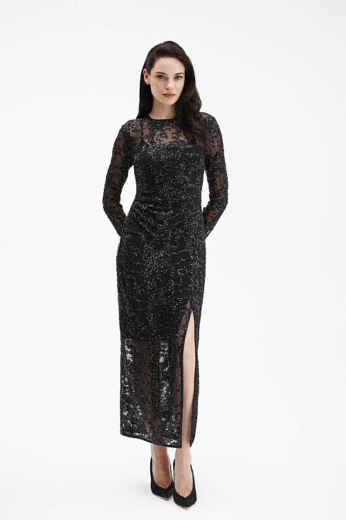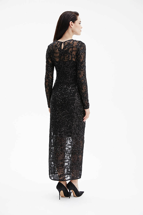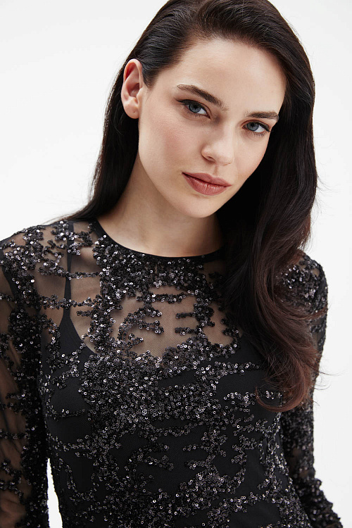 Черное платье приталенного силуэта выполнено из прозрачной трикотажной сетки, полностью расшитой пайетками, которые создают выразительное мерцание при движении. Под верхним слоем — внутреннее платье из гладкого трикотажа на тонких бретелях, обеспечивающее комфорт и безупречную посадку.