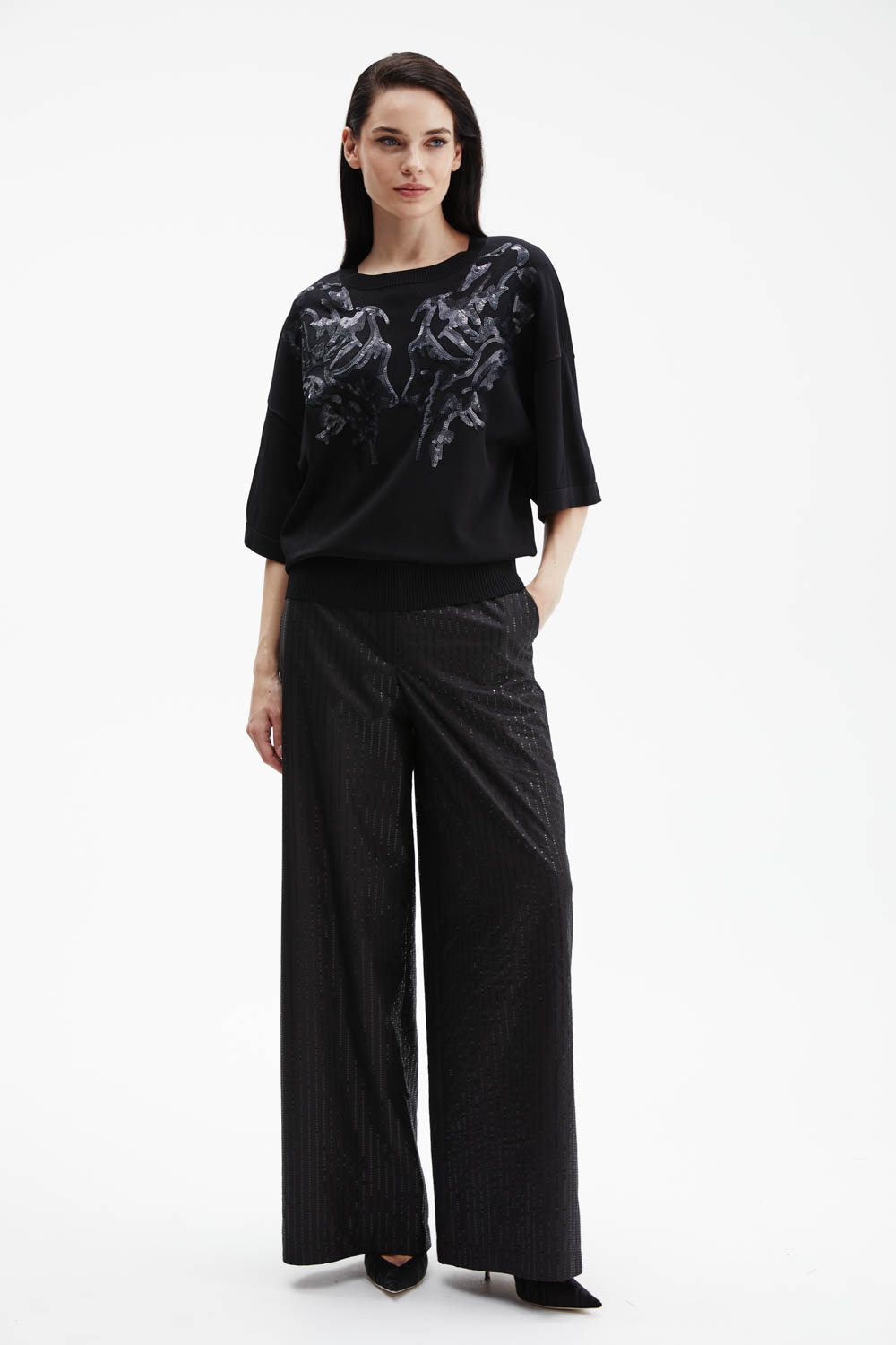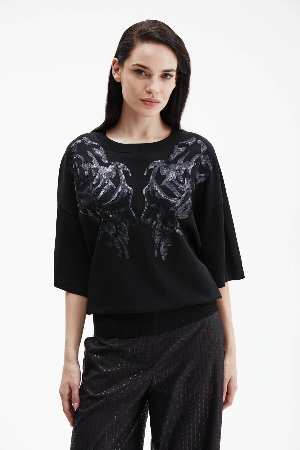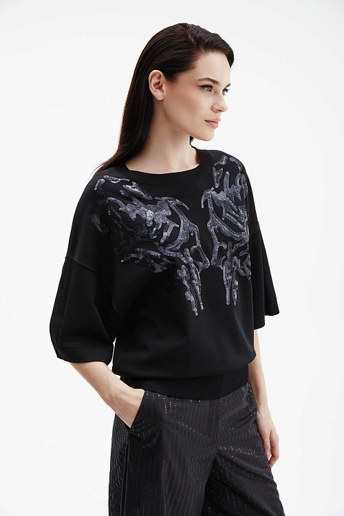 Приспущенная линия плеча создаёт расслабленный силуэт, а резинка по низу и манжетам формирует аккуратный объём. Главный акцент — абстрактный узор по переду, выполненный из матовых чёрных пайеток. Он добавляет деликатный блеск и фактурную глубину, сохраняя сдержанную элегантность.