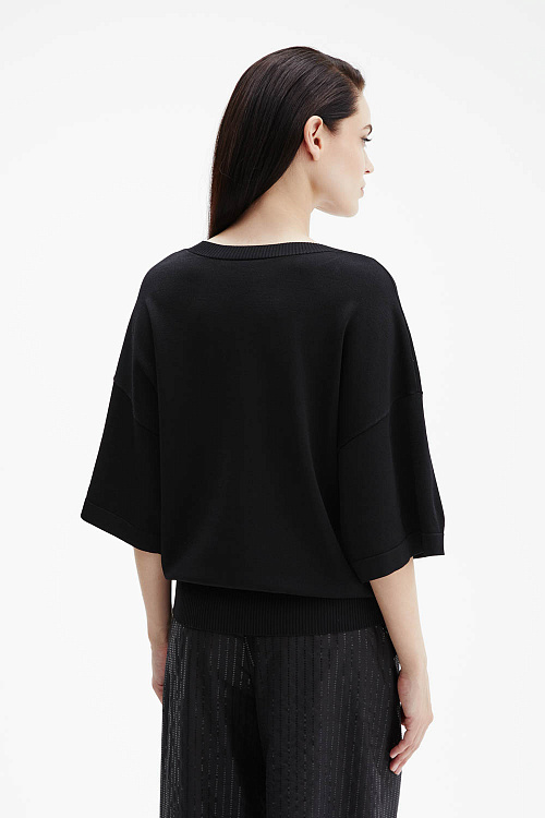 Черный джемпер свободного силуэта выполнен из мягкой пряжи, комфортно садится и держит форму.