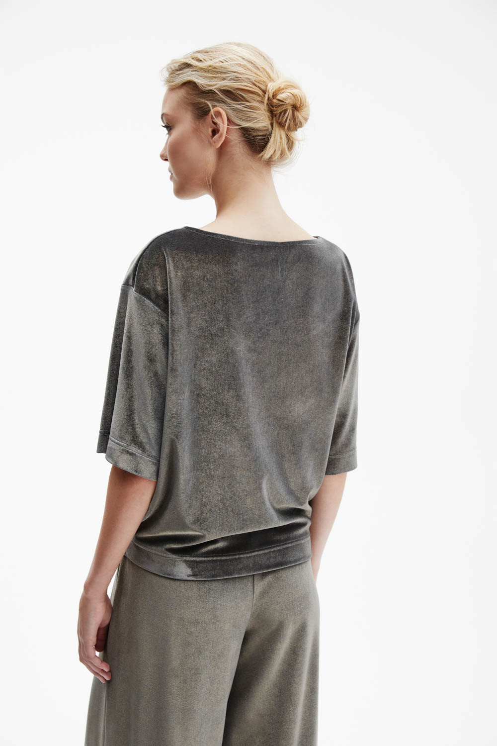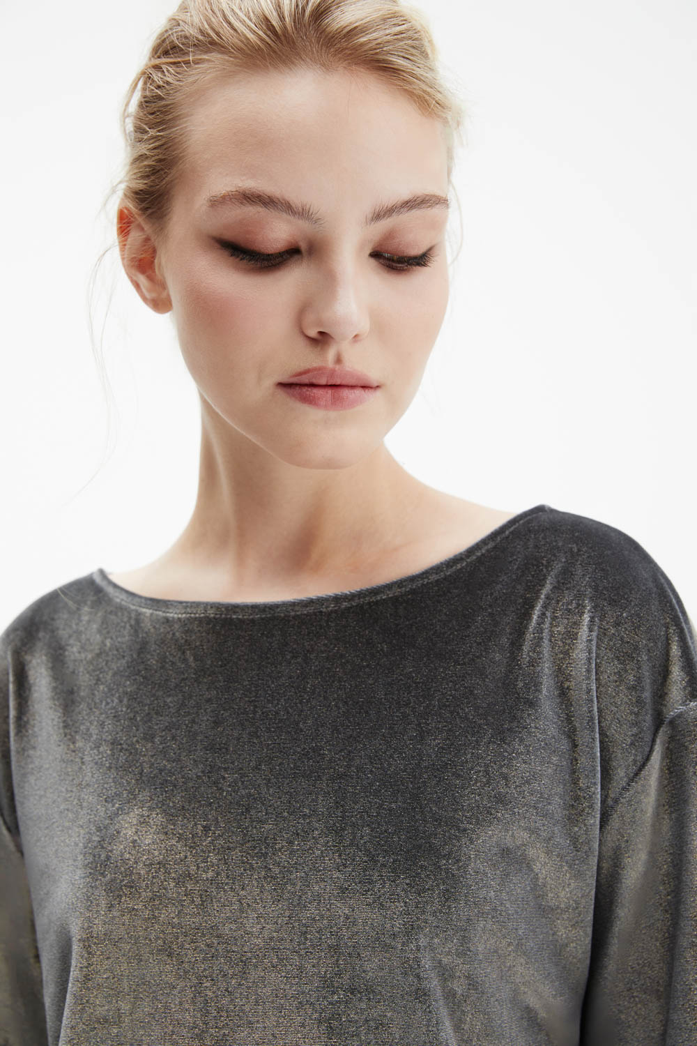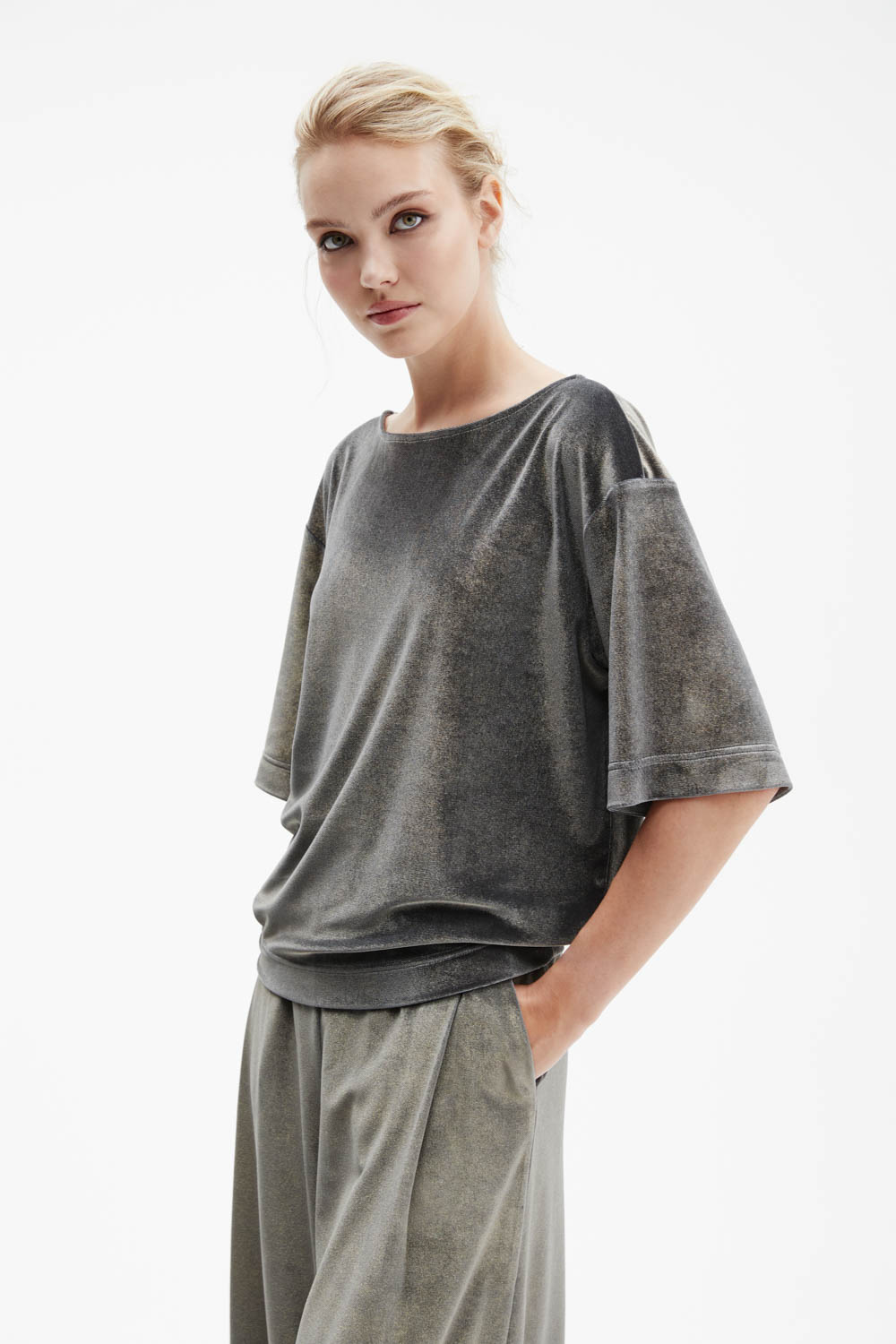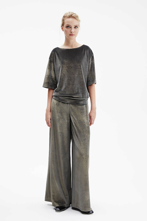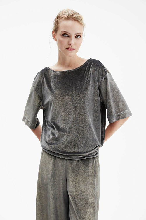 Футболка серебристо-серого оттенка прямого силуэта выполнена из мягкого трикотажа с лёгким металлизированным блеском.