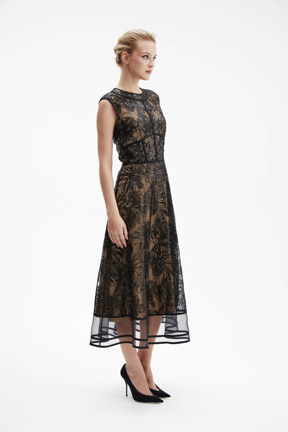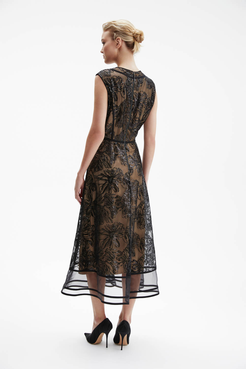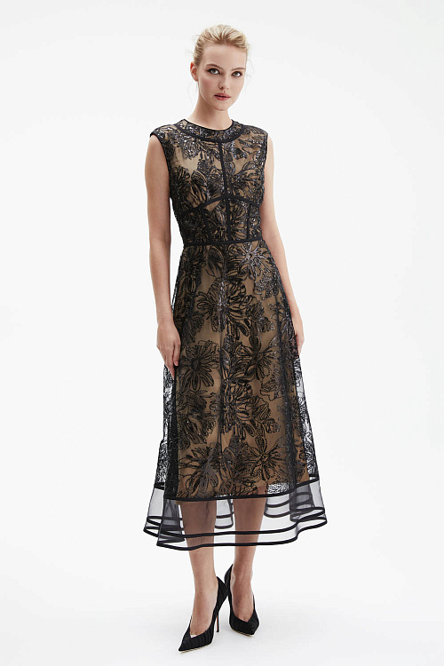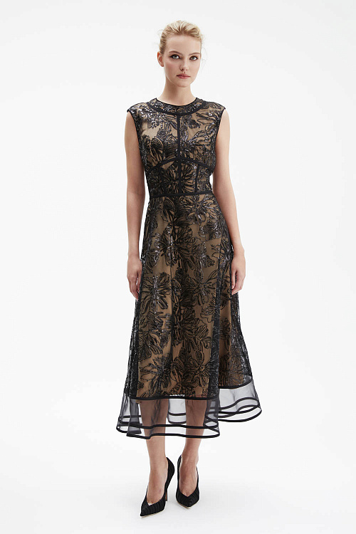 Черное платье миди приталенного силуэта выполнено из сетки с вышивкой пайетками поверх тонкой телесной подкладки, создающей эффект лёгкой прозрачности и глубины.