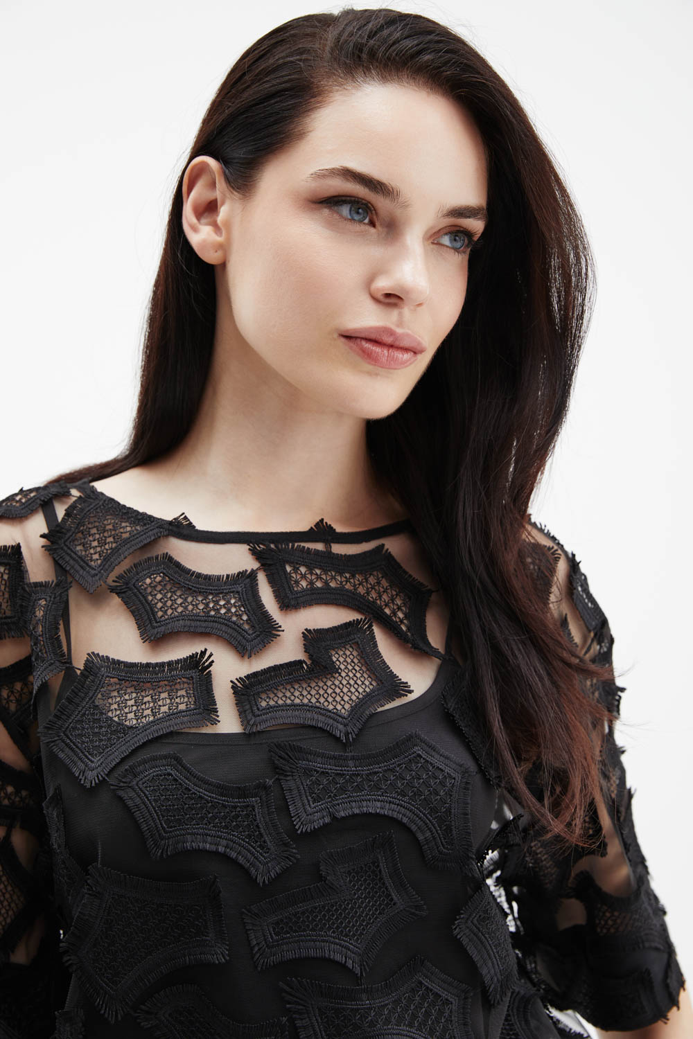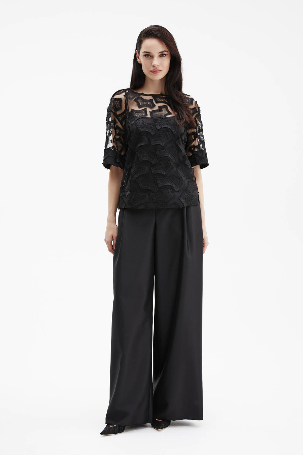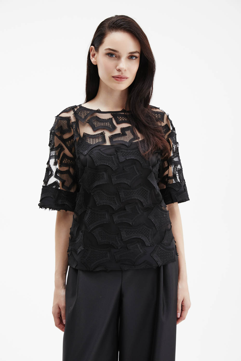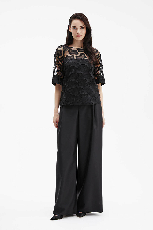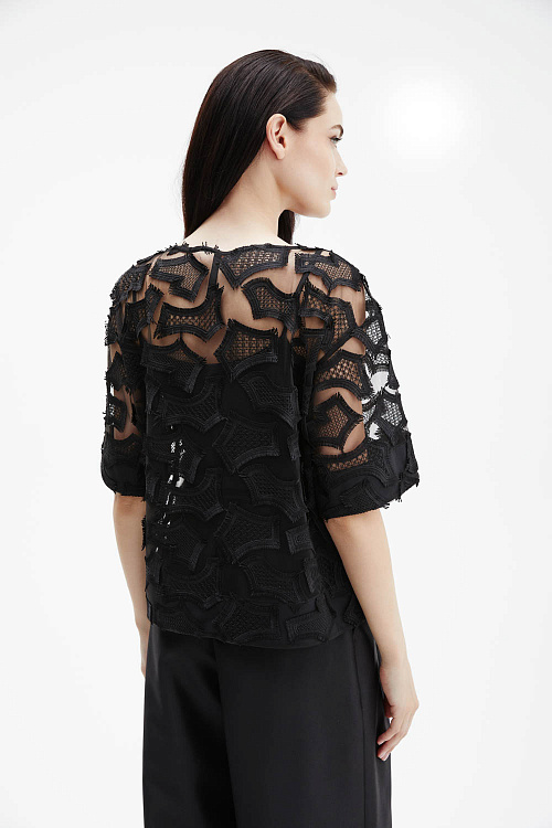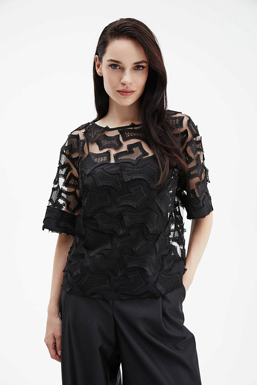 Черная объёмная футболка прямого силуэта выполнена из тончайшей сетки с фактурной вышивкой в тон ткани, создающей выразительный рельеф и утончённый контраст прозрачности и текстуры.