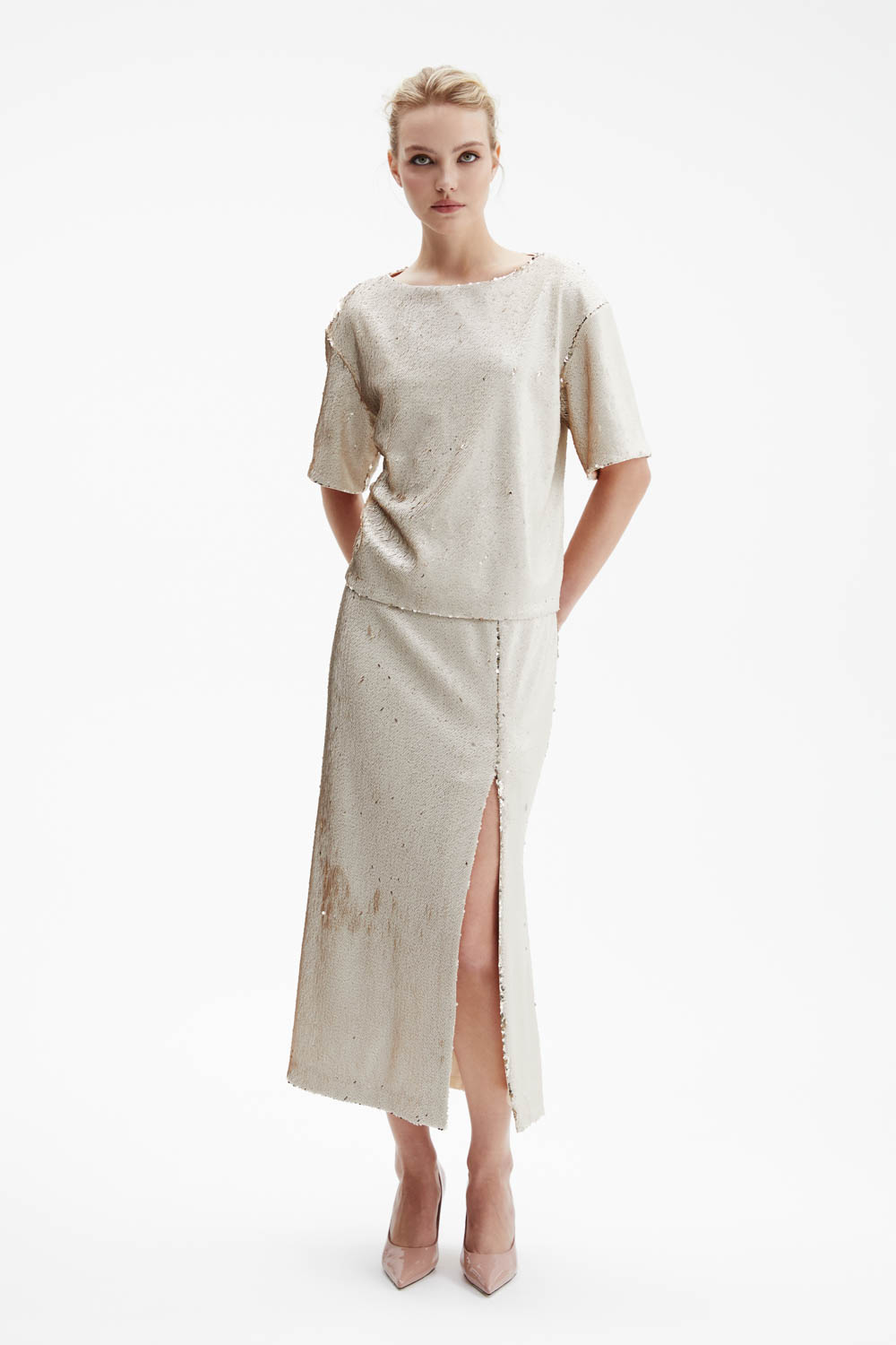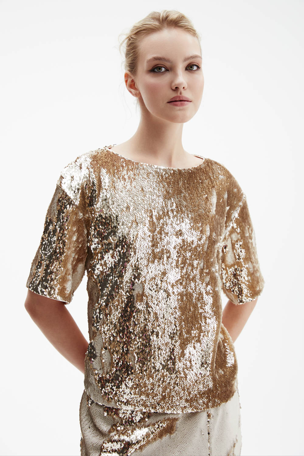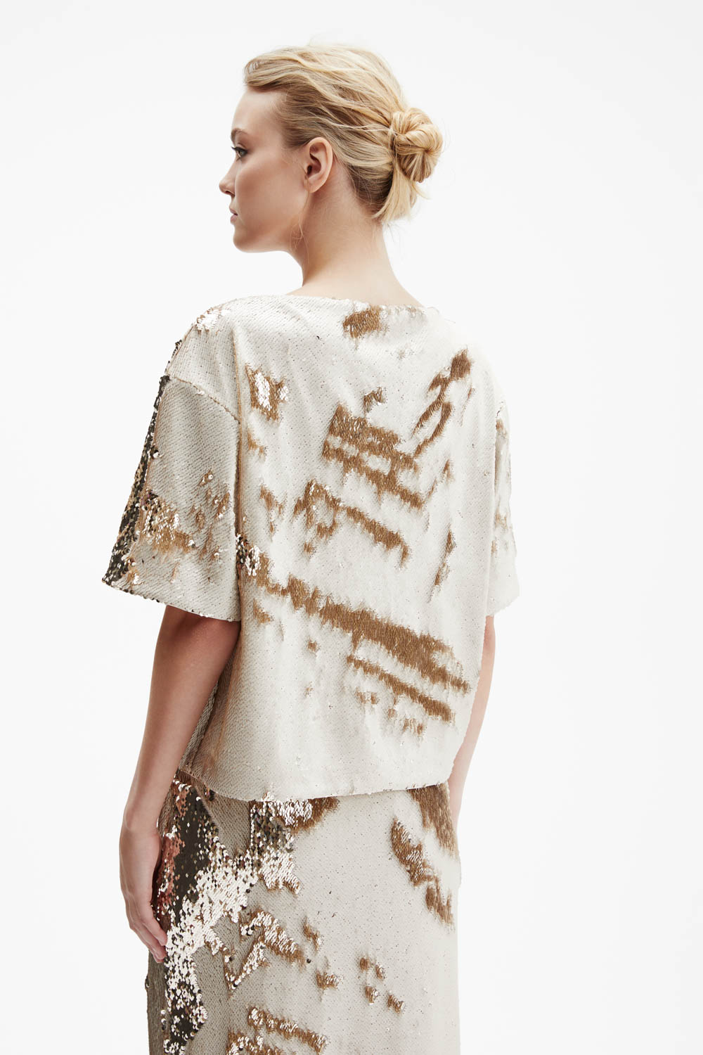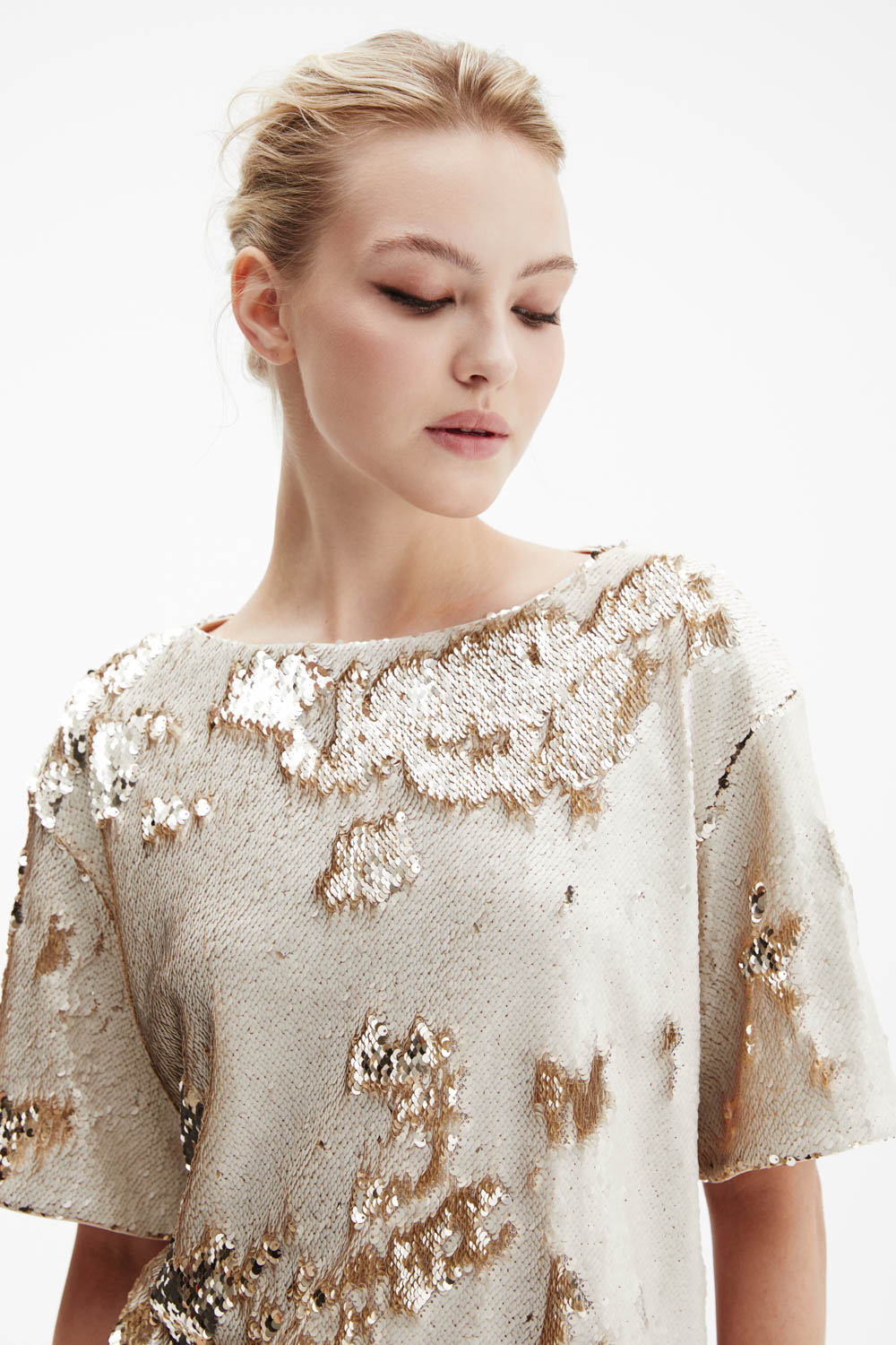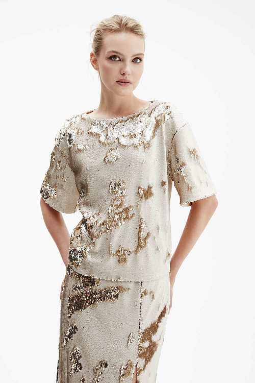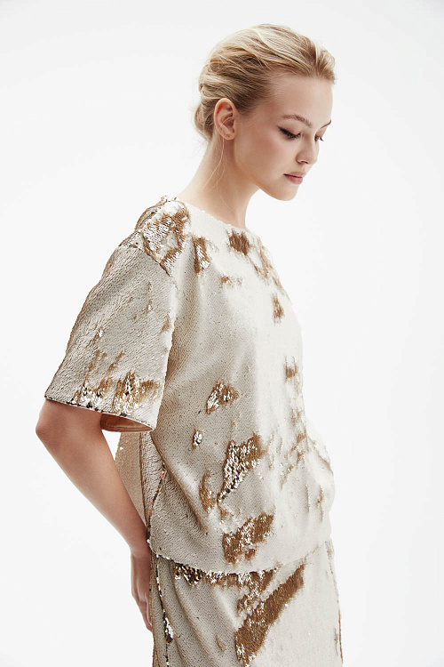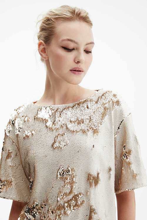 Футболка оверсайз прямого силуэта выполнена из плотной ткани, полностью расшитой реверсивными пайетками — оттенок меняется от жемчужного к золотому, создавая эффект живого сияния.