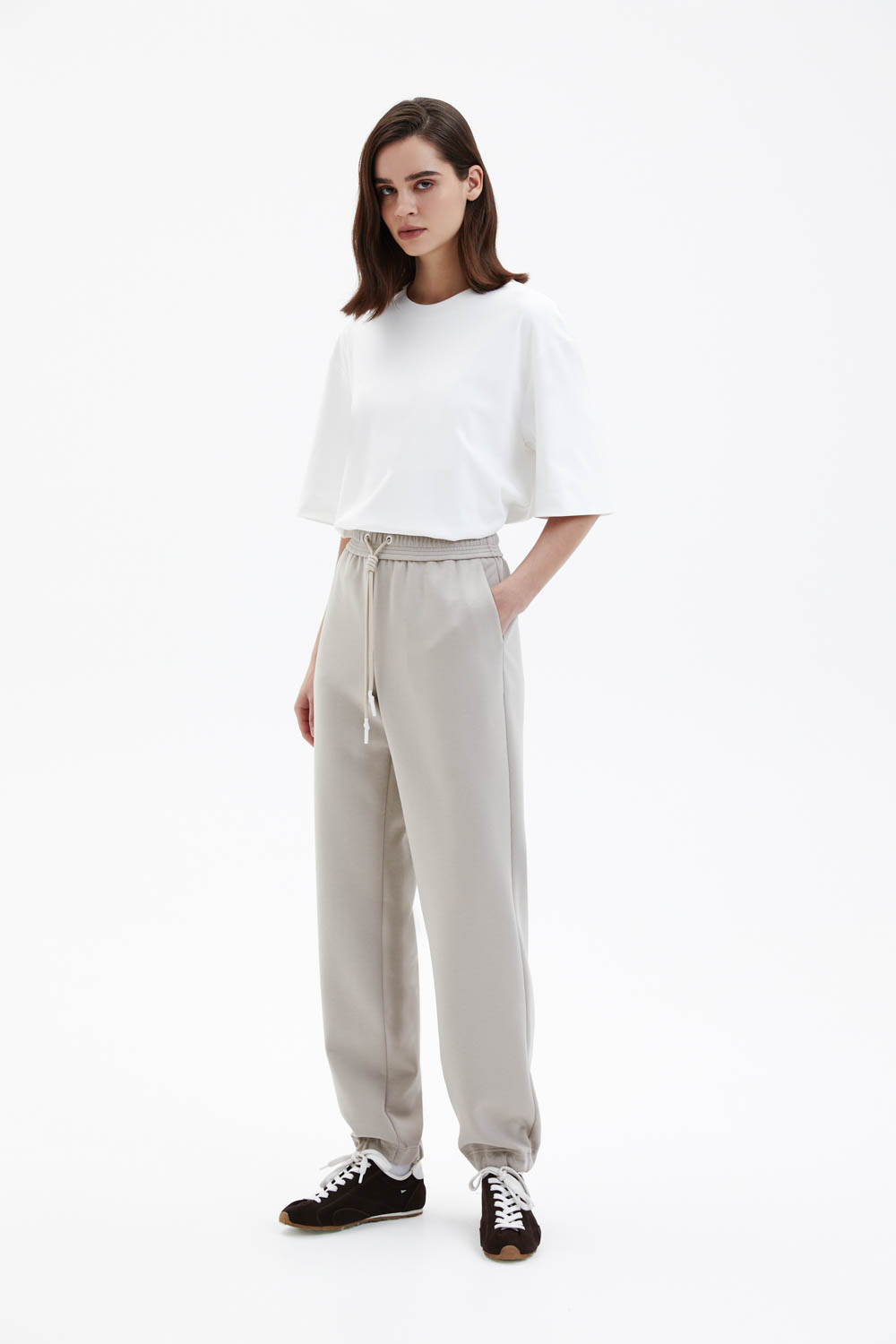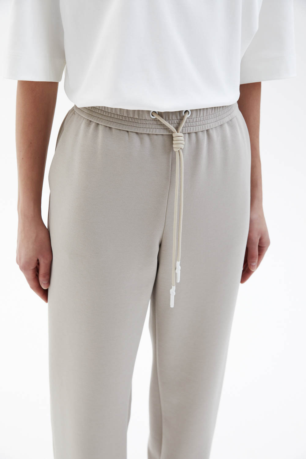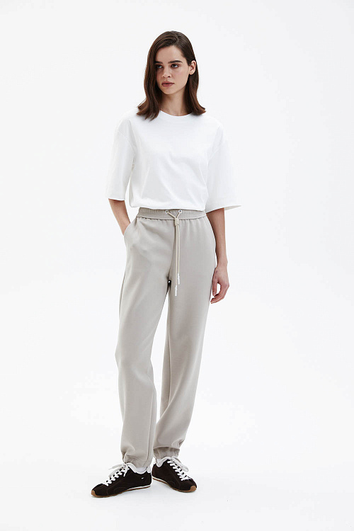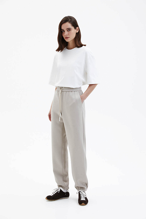 Брюки свободного прямого силуэта выполнены из мягкого джерси светлого бежево-песочного оттенка с гладкой, эластичной фактурой. Модель с эластичным поясом и кулиской обеспечивает комфортную посадку и подчёркивает расслабленный характер изделия. Прямые брючины мягко драпируются и сохраняют чистоту линий, формируя аккуратный и современный силуэт.