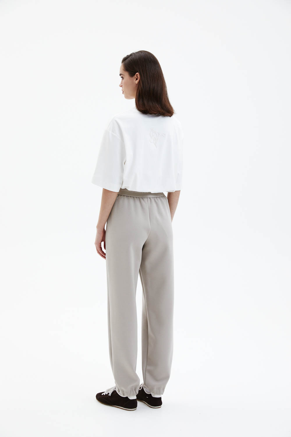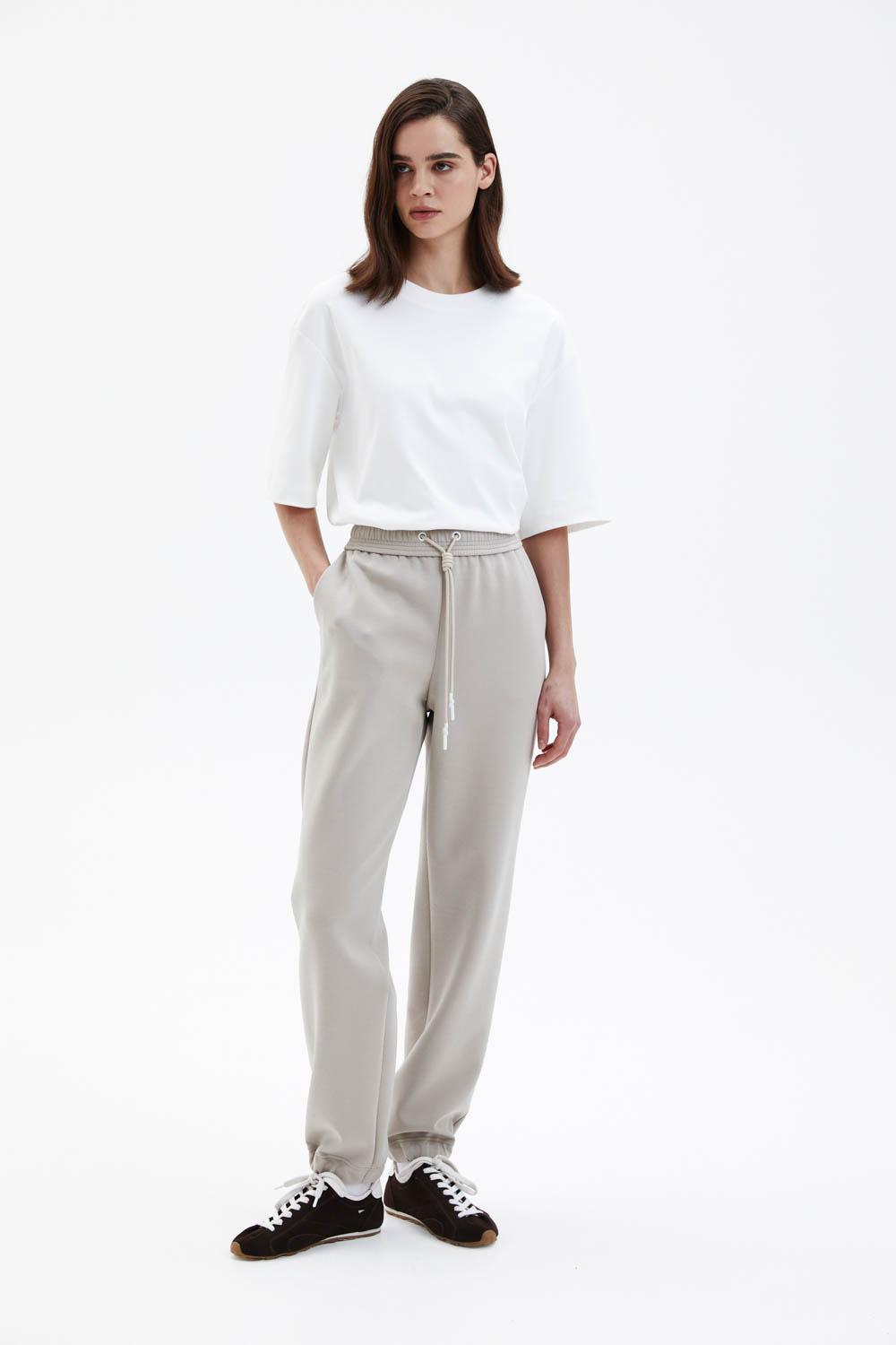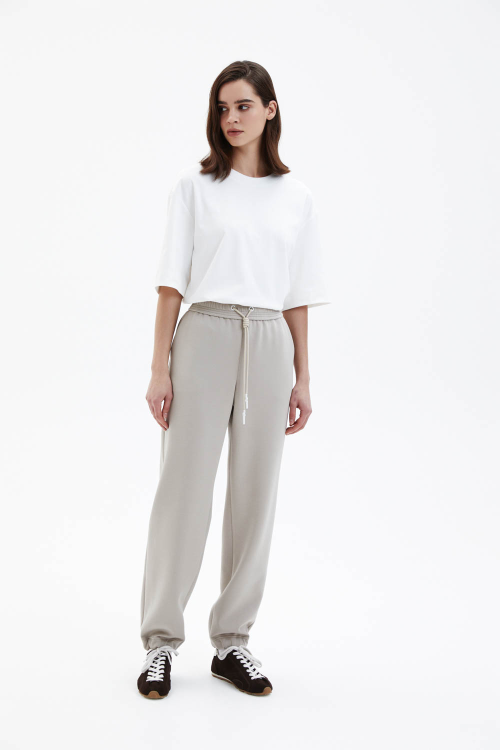 Брюки свободного прямого силуэта выполнены из мягкого джерси светлого бежево-песочного оттенка с гладкой, эластичной фактурой. Модель с эластичным поясом и кулиской обеспечивает комфортную посадку и подчёркивает расслабленный характер изделия. Прямые брючины мягко драпируются и сохраняют чистоту линий, формируя аккуратный и современный силуэт.