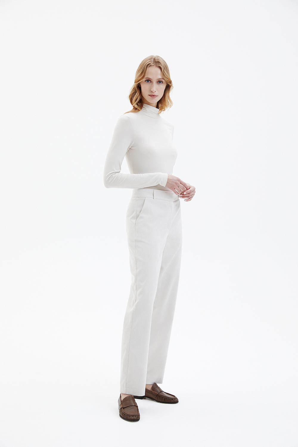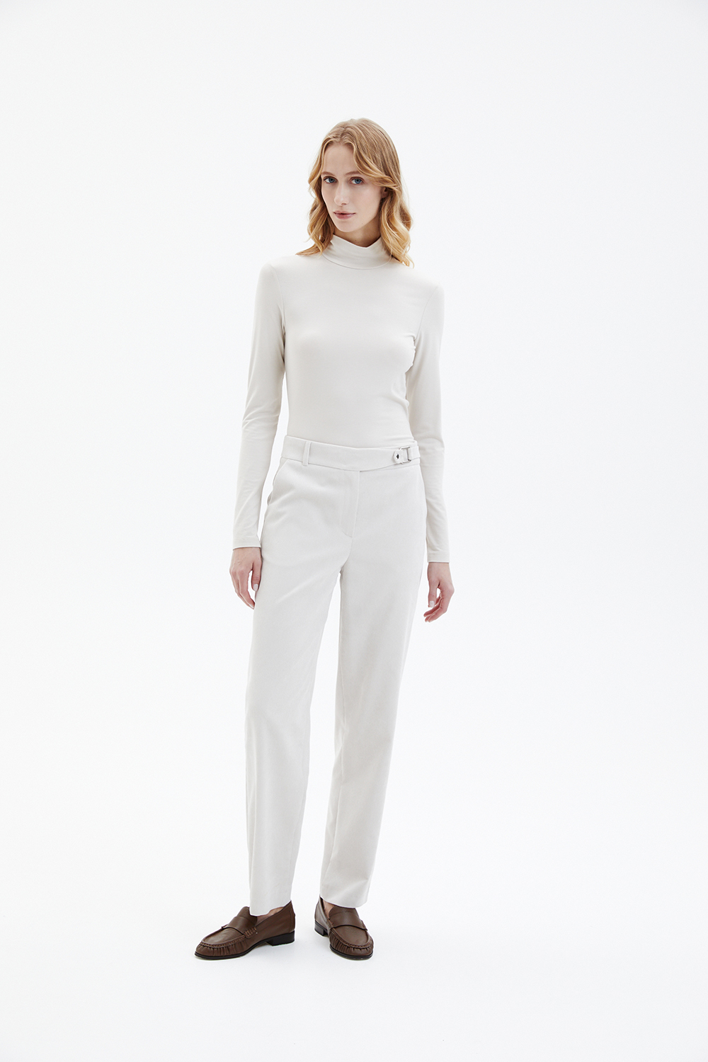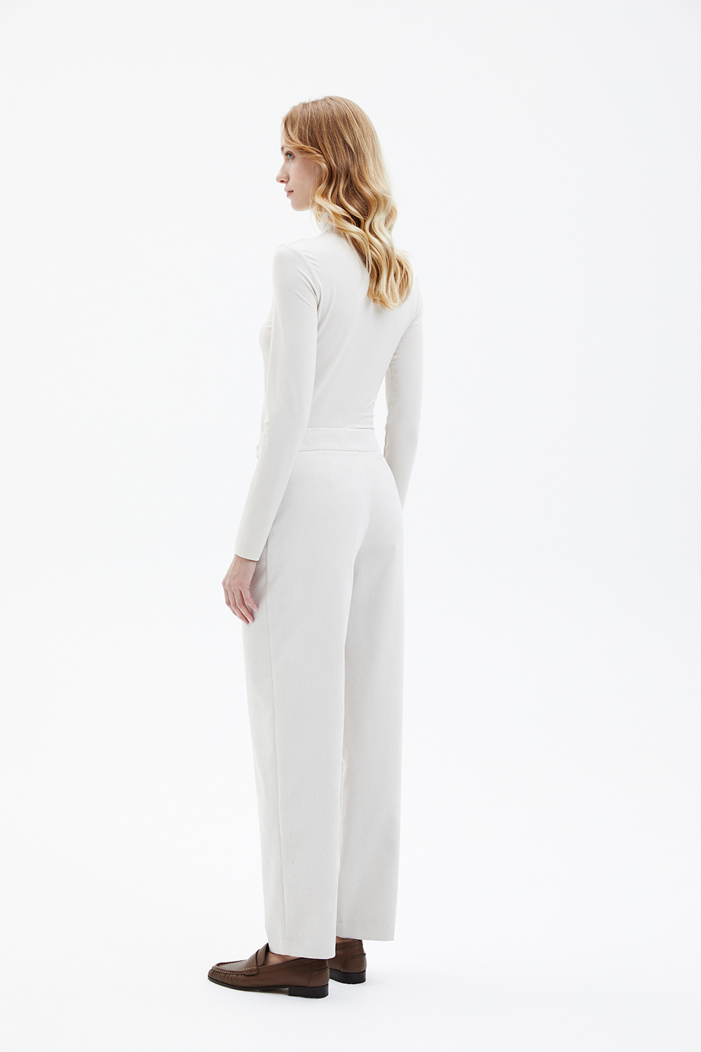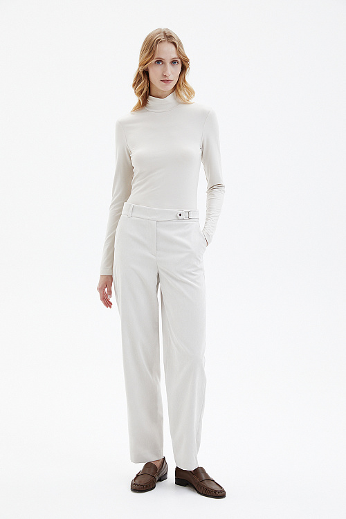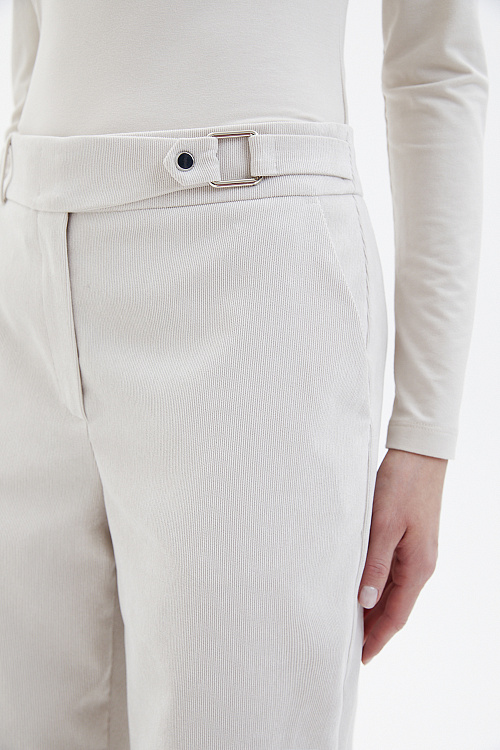 Вельветовые брюки прямого кроя молочного цвета выполнены из мягкого плотного материала с характерной фактурой в тонкий рубчик. Модель со средней посадкой дополнена аккуратным поясом с декоративной металлической пряжкой и функциональными карманами. Чёткие линии кроя формируют чистый, вытянутый силуэт и подчёркивают аккуратность посадки.