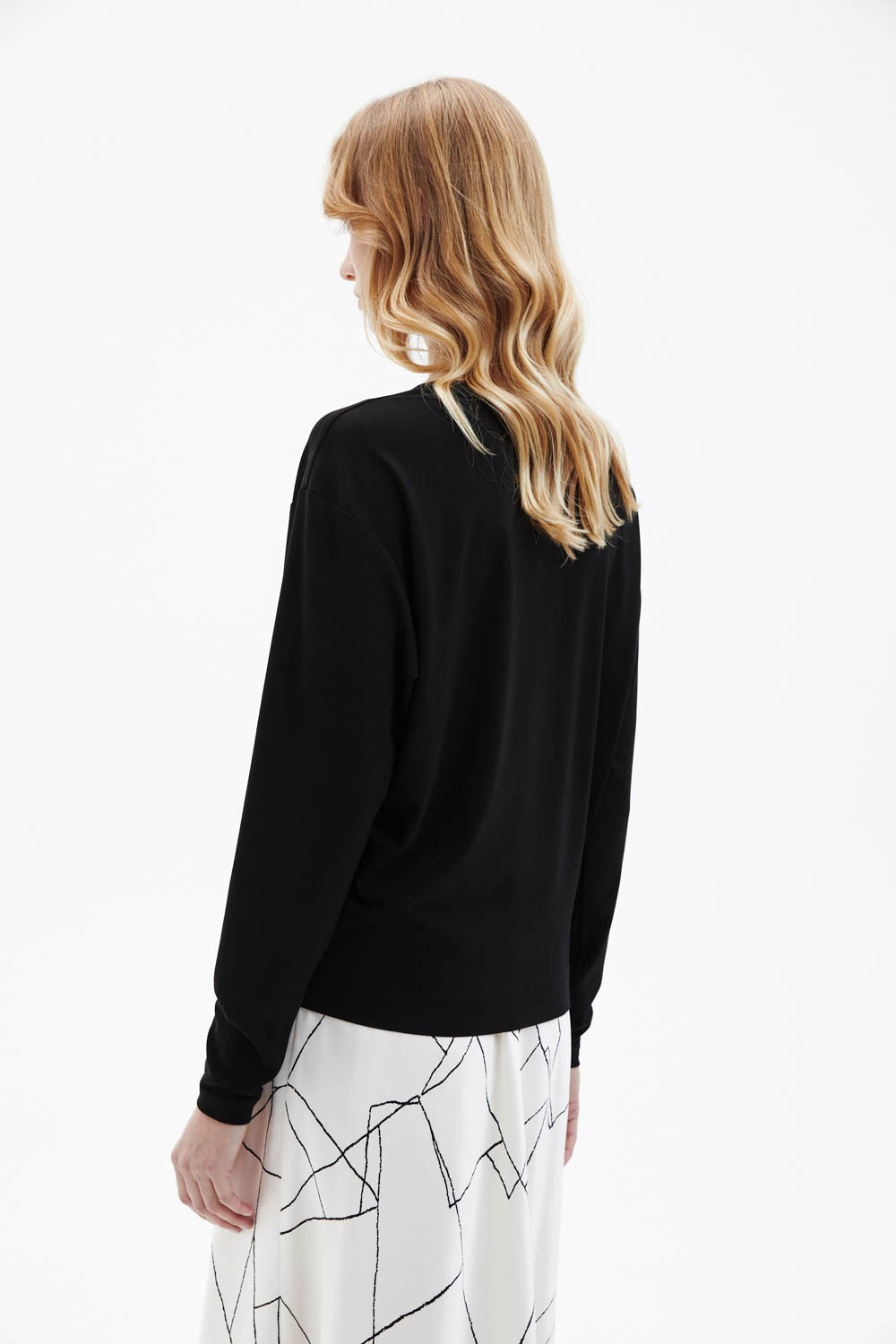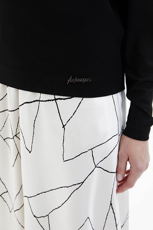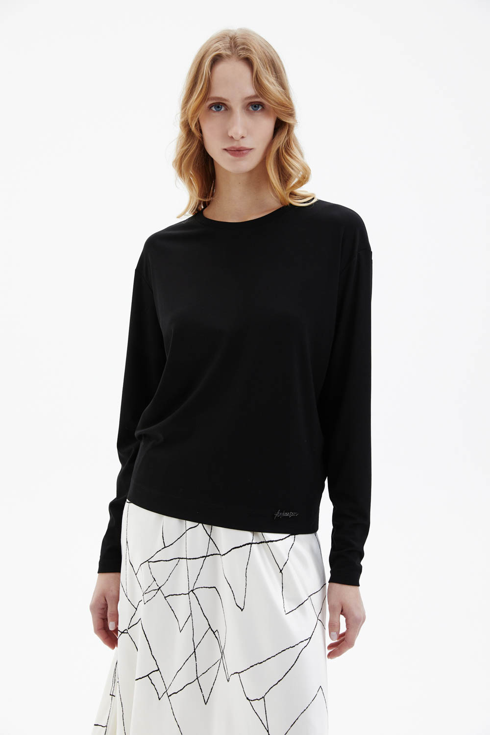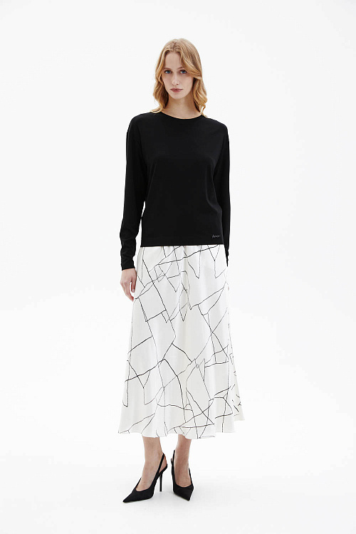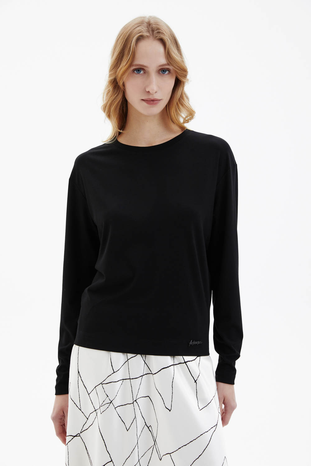 Лонгслив прямого силуэта с круглой горловиной выполнен из мягкого пластичного трикотажа и имеет приспущенную линию плеча, создающую расслабленную посадку. Силуэт слегка зауживается книзу, формируя аккуратную линию. Дизайн выдержан в минималистичном ключе: единственный декоративный акцент — металлический логотип M.REASON в нижней части переда. Гладкая фактура трикотажа обеспечивает мягкое прилегание и комфорт при носке.