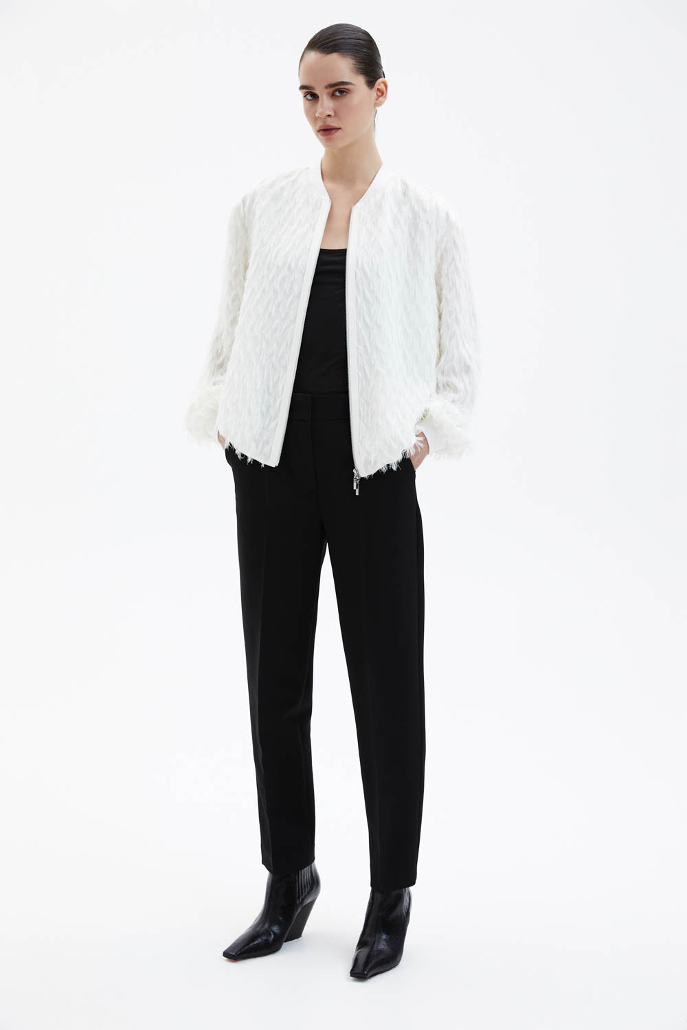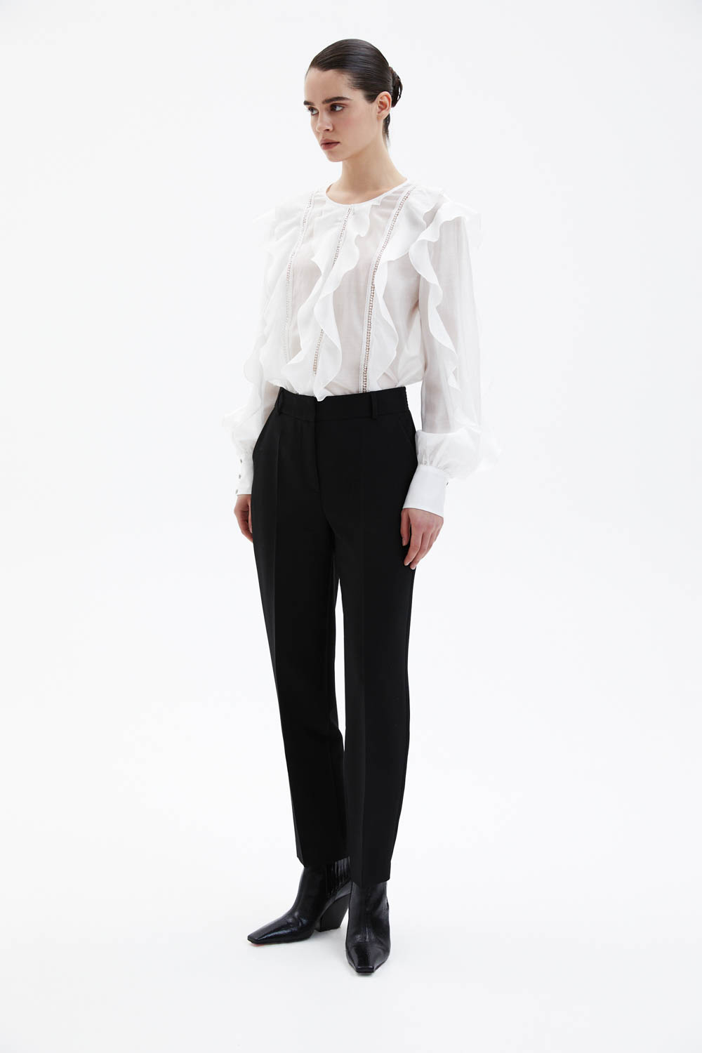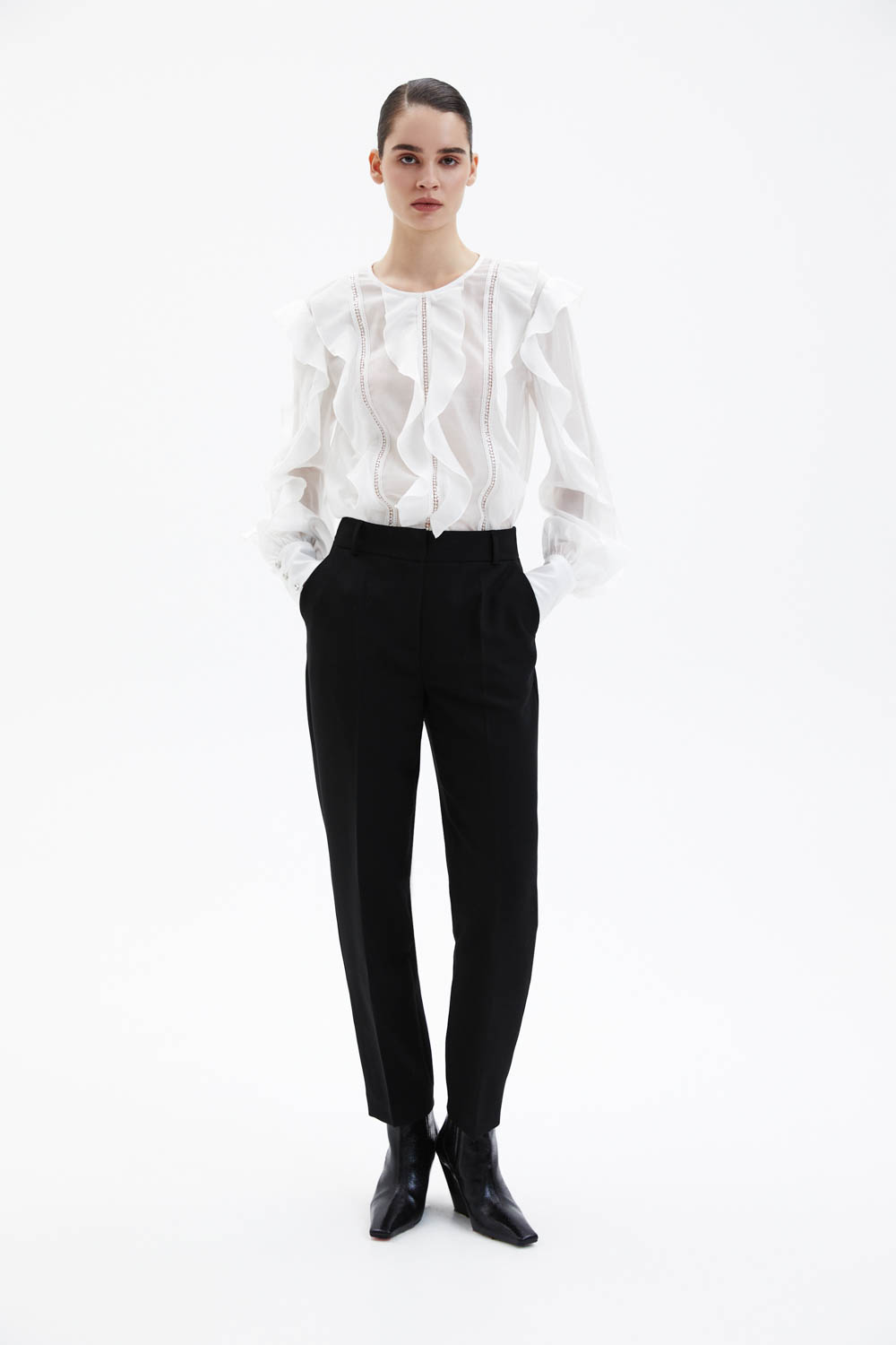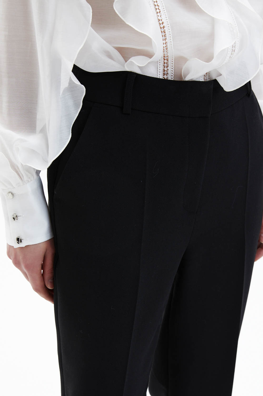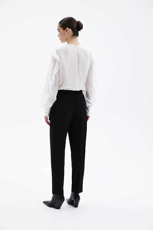 Брюки прямого кроя выполнены из чёрной костюмной ткани, которая хорошо держит форму и создаёт аккуратный, собранный силуэт. Средняя посадка подчёркивает линию талии, а лаконичный крой с мягким заужением к низу делает модель универсальной и визуально вытягивает силуэт. Чистая линия пояса и минималистичная отделка подчёркивают сдержанную элегантность изделия.