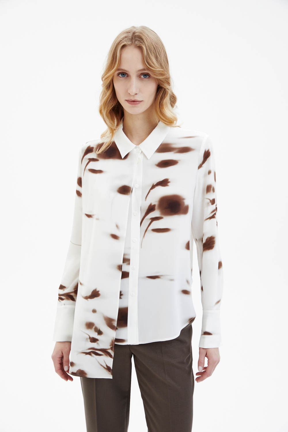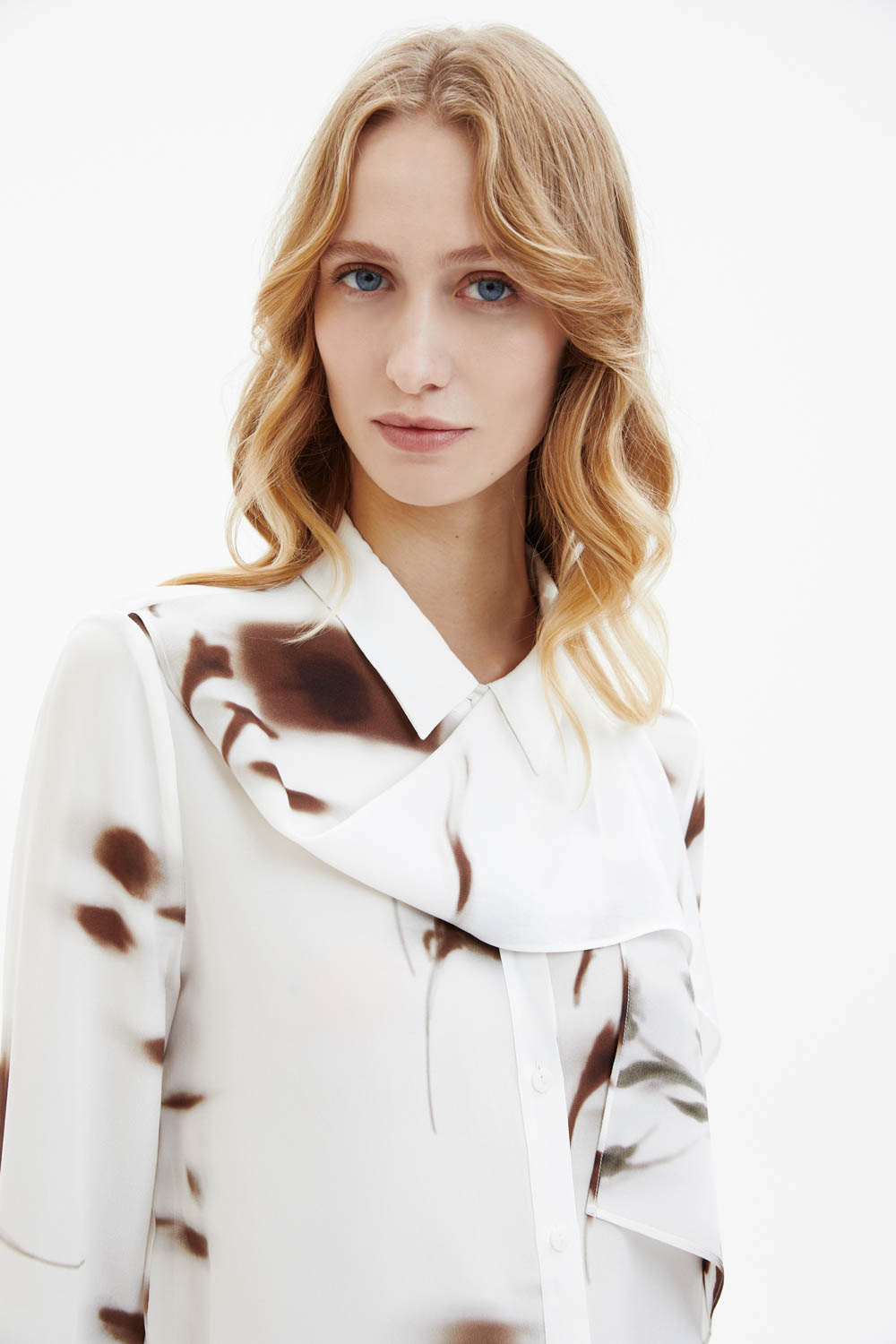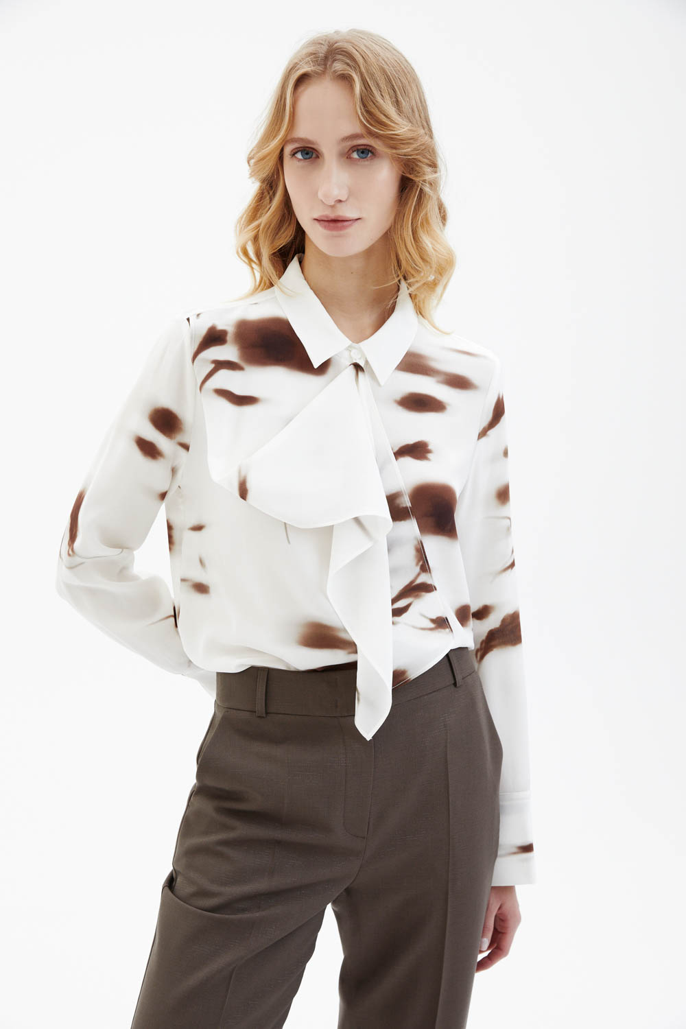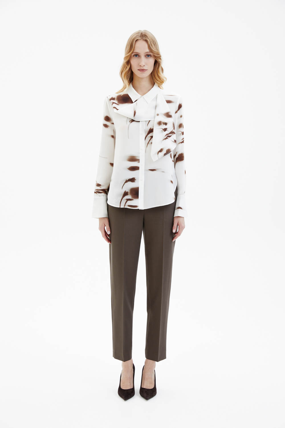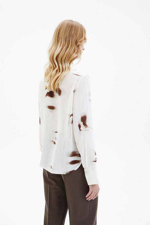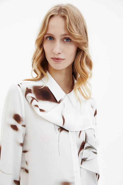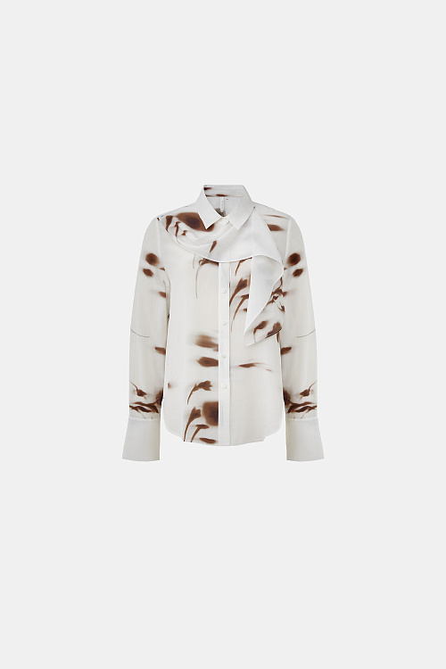 Шёлковая рубашка молочного цвета выполнена из лёгкого струящегося материала с гладкой, слегка матовой фактурой. Модель прямого кроя дополнена классическим отложным воротником и декоративным шарфом-бантом, который формирует мягкую драпировку в зоне горловины. Контрастный абстрактный принт в коричневых оттенках придаёт изделию выразительность и современный характер.