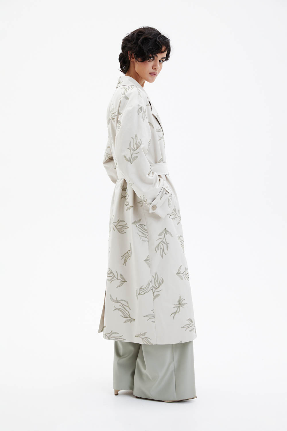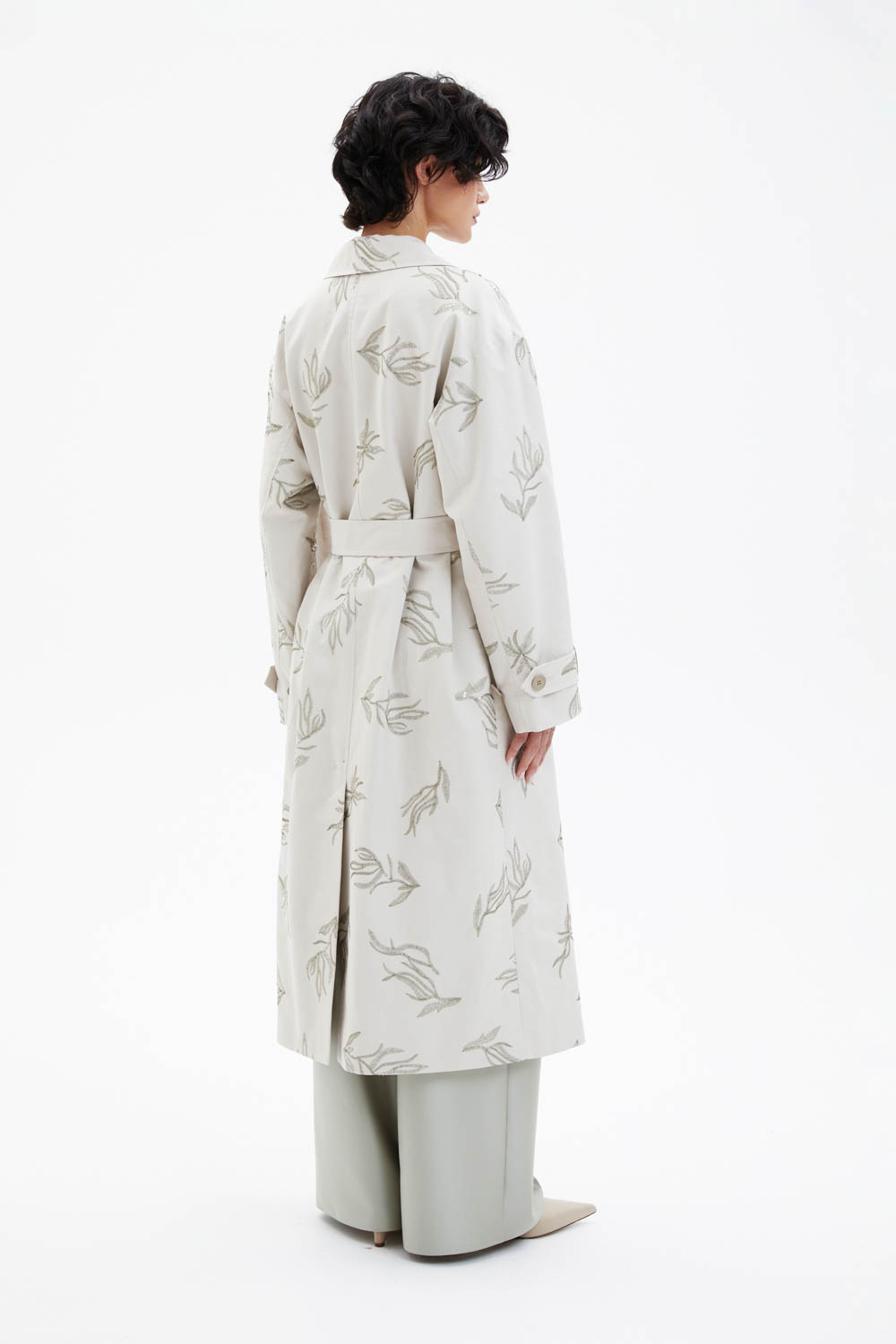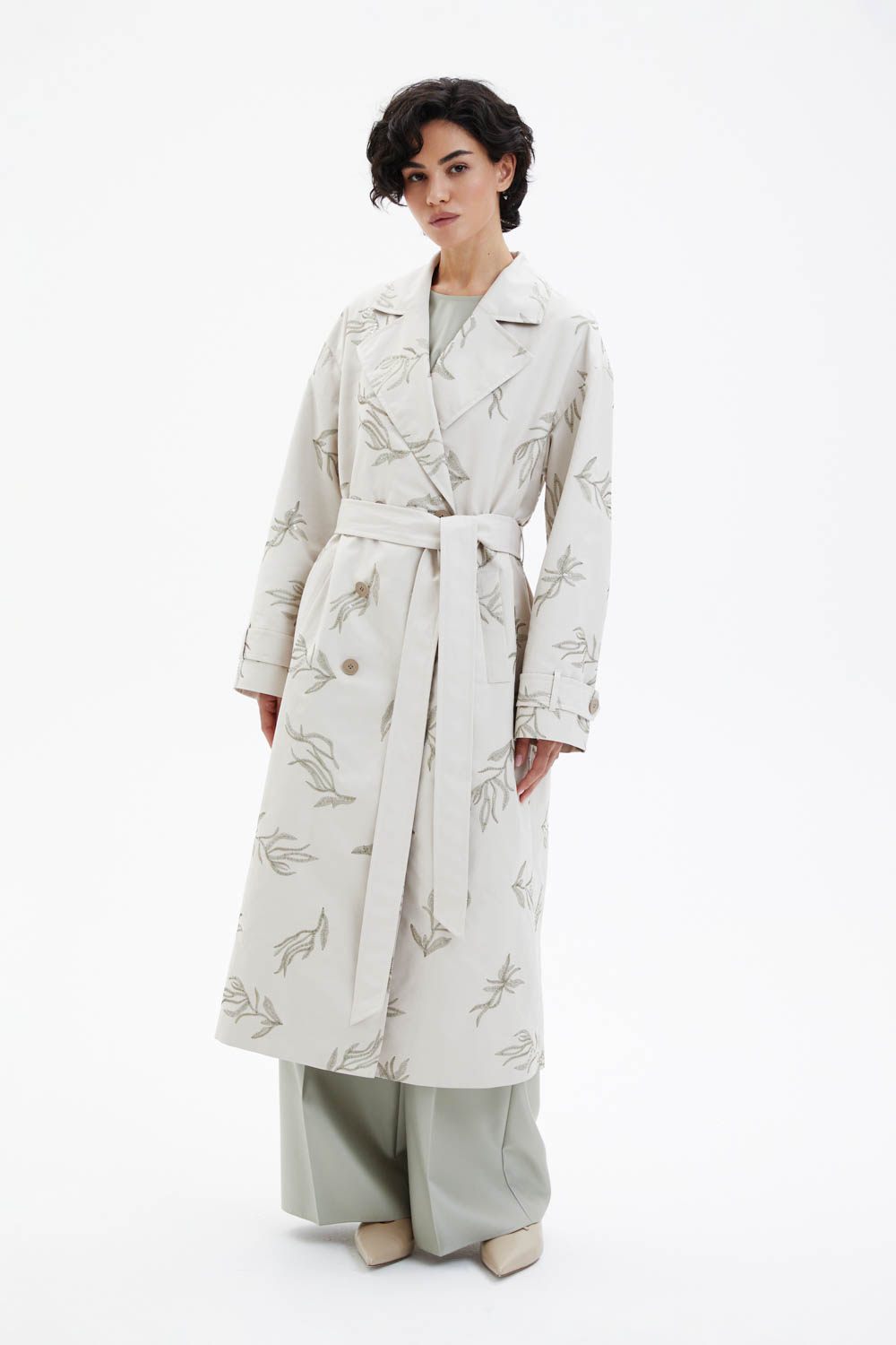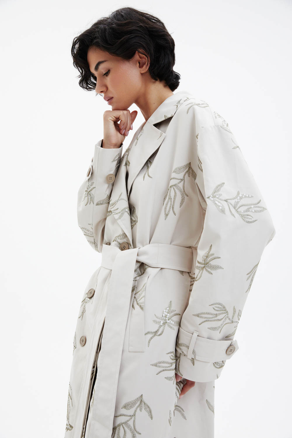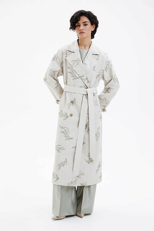 Плащ молочного цвета выполнен из плотной ткани с гладкой матовой фактурой. Модель прямого удлинённого кроя дополнена классическими лацканами, застёжкой на пуговицы и съёмным поясом, позволяющим акцентировать линию талии. Декоративная вышивка с растительными мотивами, равномерно распределённая по поверхности изделия, придаёт образу утончённость и выразительный характер.